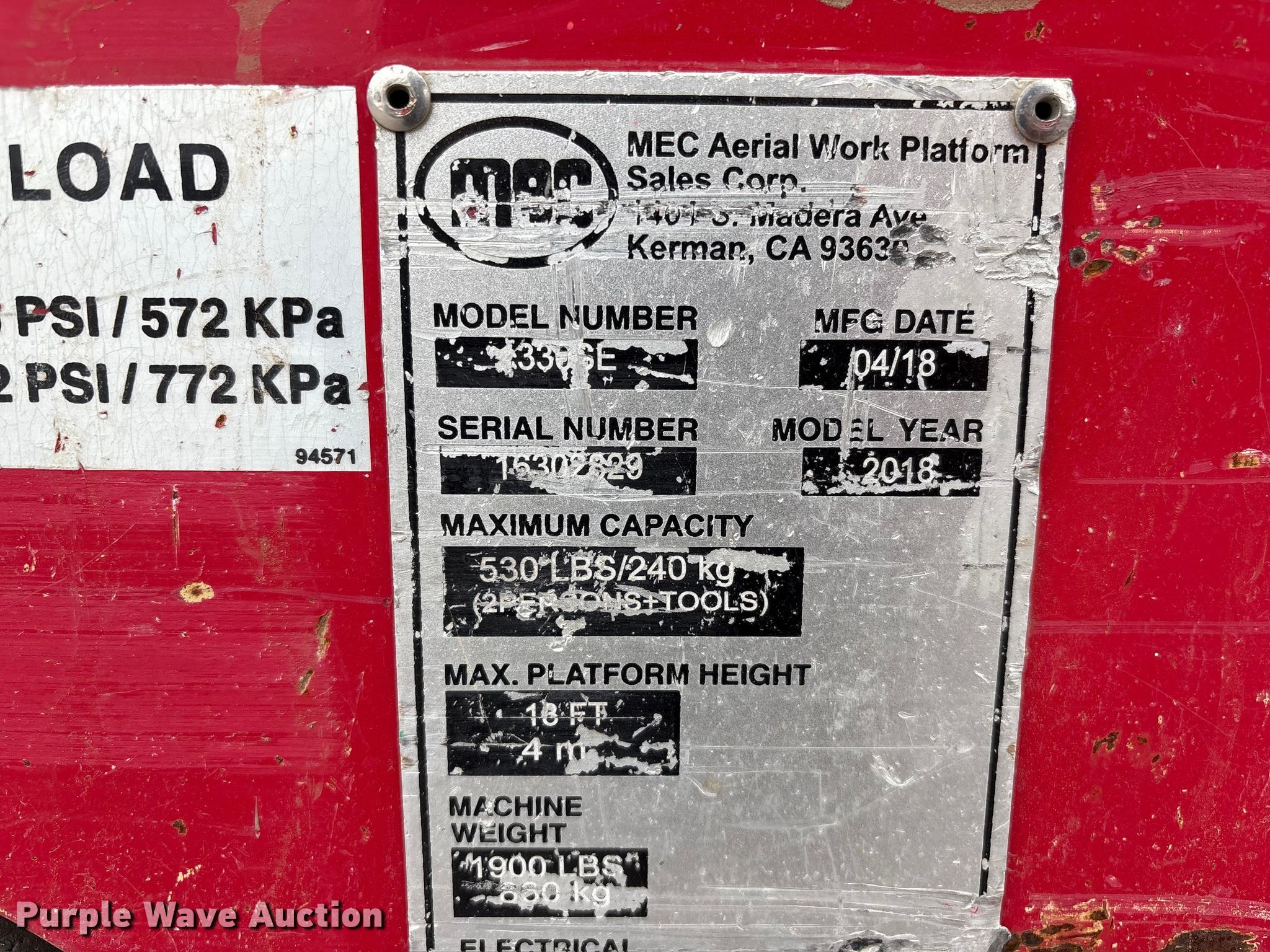 Purple Wave is selling a used Scissor or Vertical Lift in Nebraska. This item is a 2018 MEC 1330SE scissor lift with the following: Hours: 348 on meter, Serial: 16302829