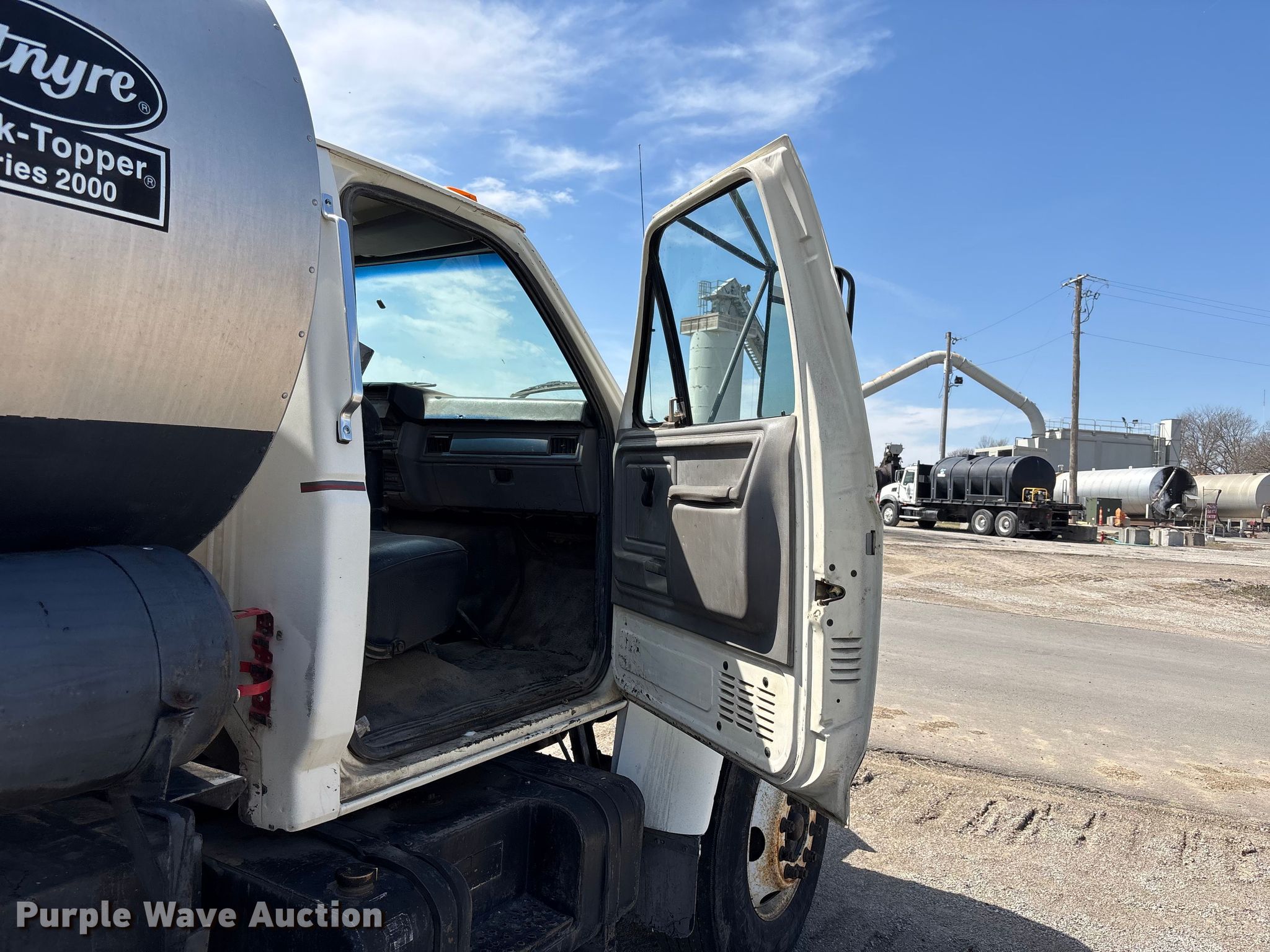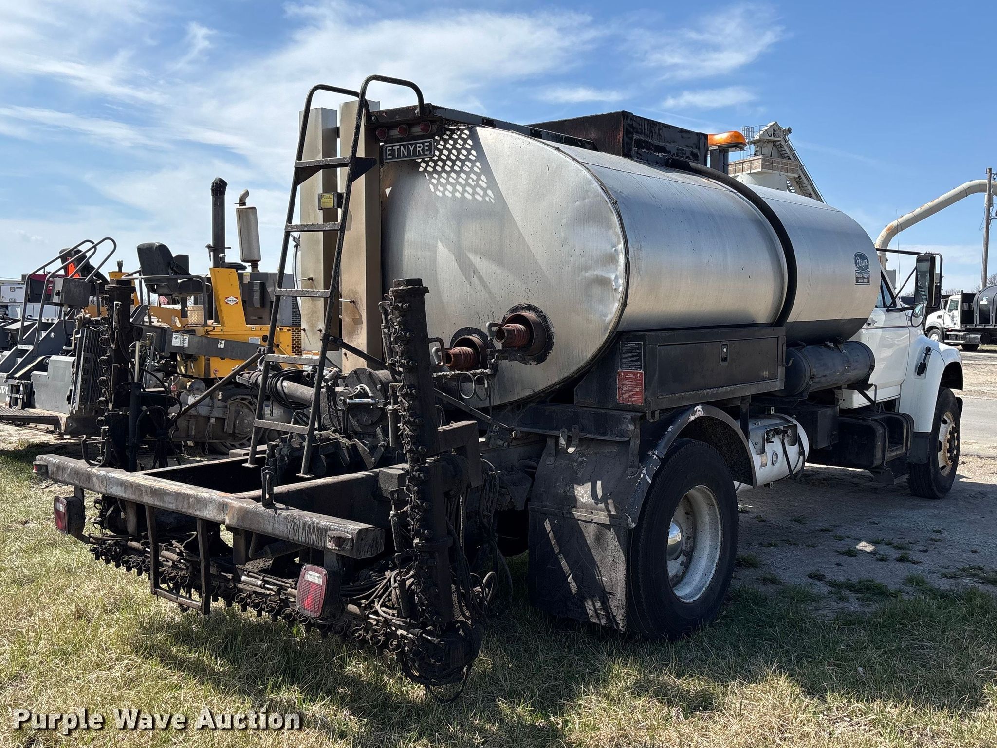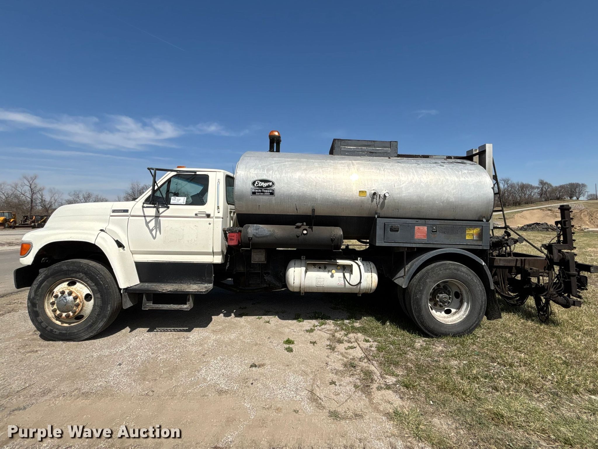 1997 Ford F800 oil distributor truck. Miles: 57,428 on odometer, VIN: 1FDXF80C8VVA41701. Engine Cummins B5.9L-190, Serial: 45465687, Displacement: 5.9L, Cylinders: 6, Fuel type: Diesel. Transmission Manual, Speed: 5. Chassis Axles: Single, Suspension: Spring, Brakes: Air, GVWR: 33,000 lbs. Interior AC, Heat. Features Bed Tank bed, Etnyre Black Topper S-2000, Serial: S2099, Length: 198", Width: 8', Capacity: 2,000 gallons, In-cab controls, Spray boom Folding, Asphalt sealer. Tires Size: 11R22.5. Missouri title. Title distribution may be delayed up to 14 days from verification of funds. Keller Construction. Saint Joseph, MO 64505