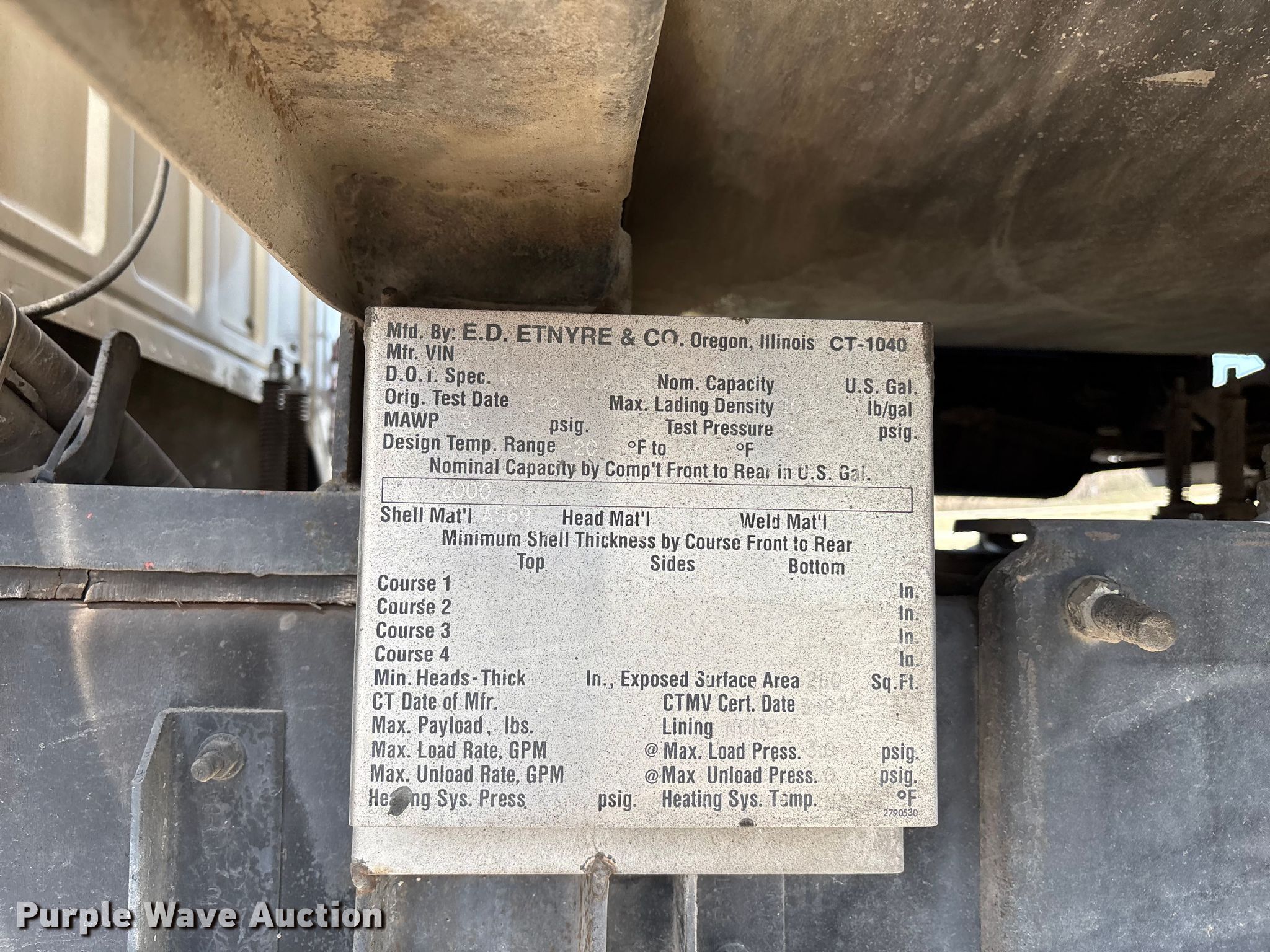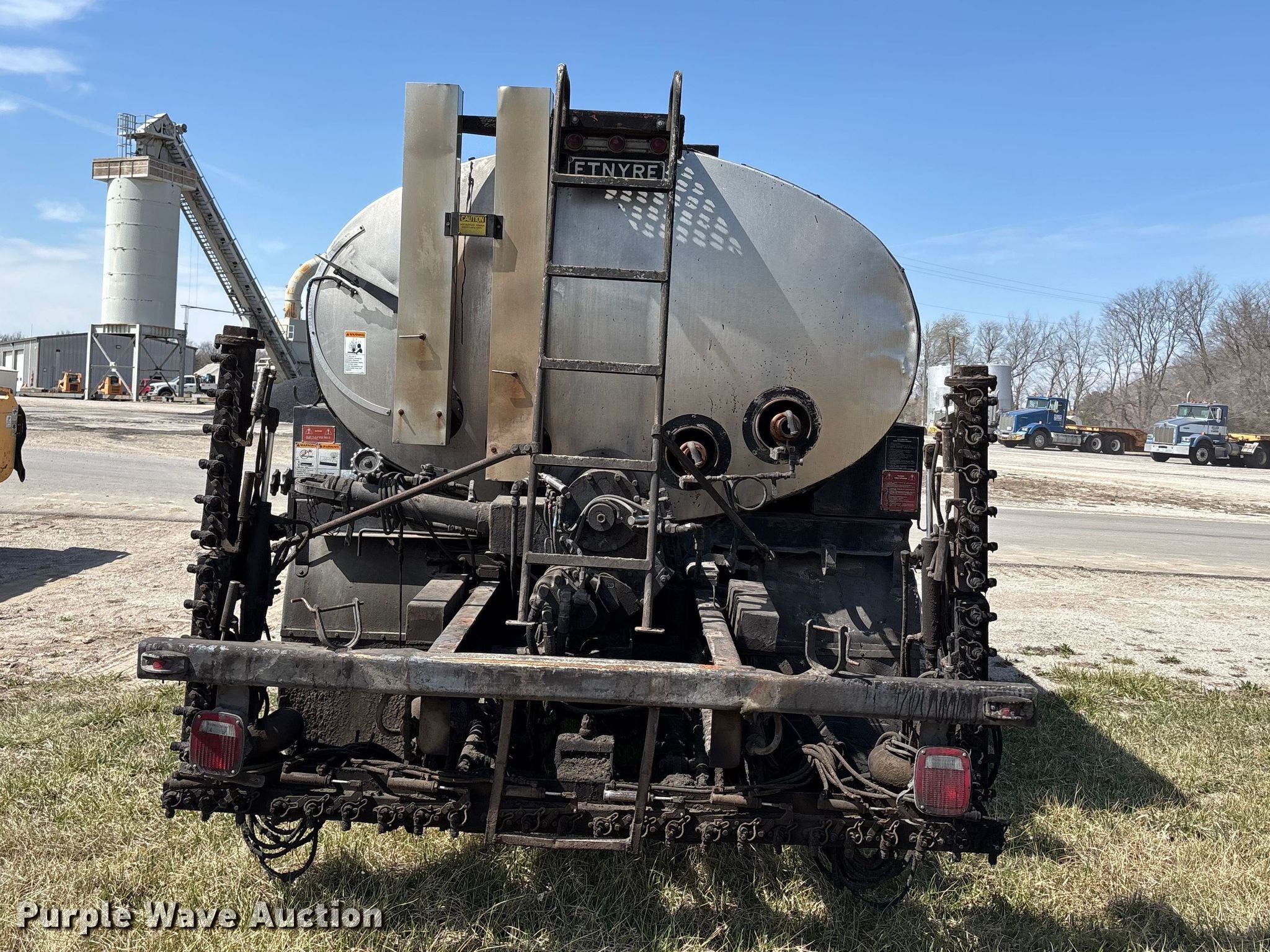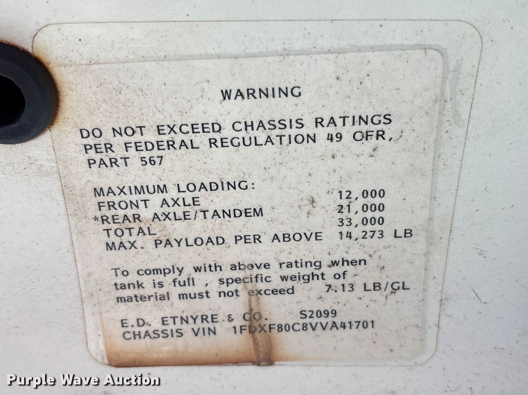 1997 Ford F800 oil distributor truck. Miles: 57,428 on odometer, VIN: 1FDXF80C8VVA41701. Engine Cummins B5.9L-190, Serial: 45465687, Displacement: 5.9L, Cylinders: 6, Fuel type: Diesel. Transmission Manual, Speed: 5. Chassis Axles: Single, Suspension: Spring, Brakes: Air, GVWR: 33,000 lbs. Interior AC, Heat. Features Bed Tank bed, Etnyre Black Topper S-2000, Serial: S2099, Length: 198", Width: 8', Capacity: 2,000 gallons, In-cab controls, Spray boom Folding, Asphalt sealer. Tires Size: 11R22.5. Missouri title. Title distribution may be delayed up to 14 days from verification of funds. Keller Construction. Saint Joseph, MO 64505