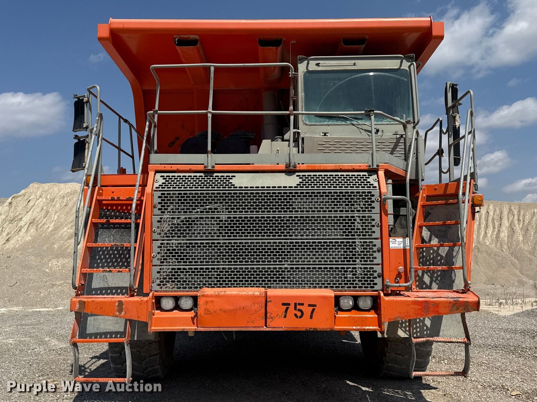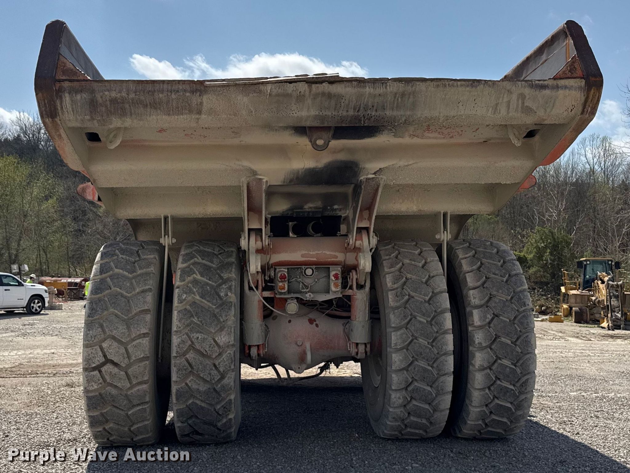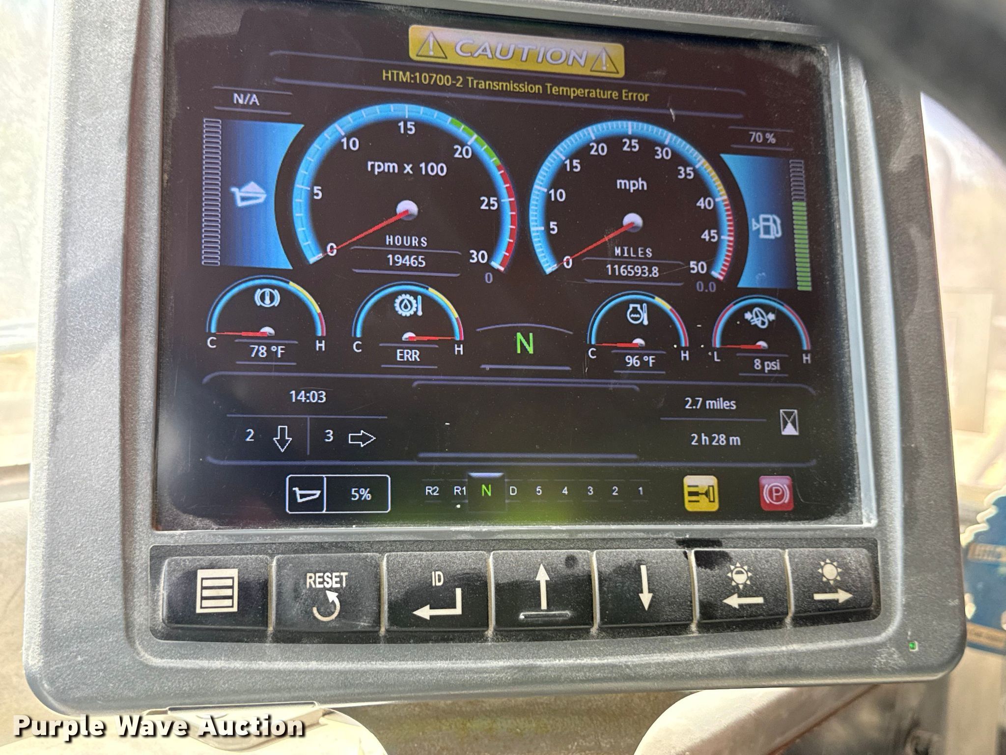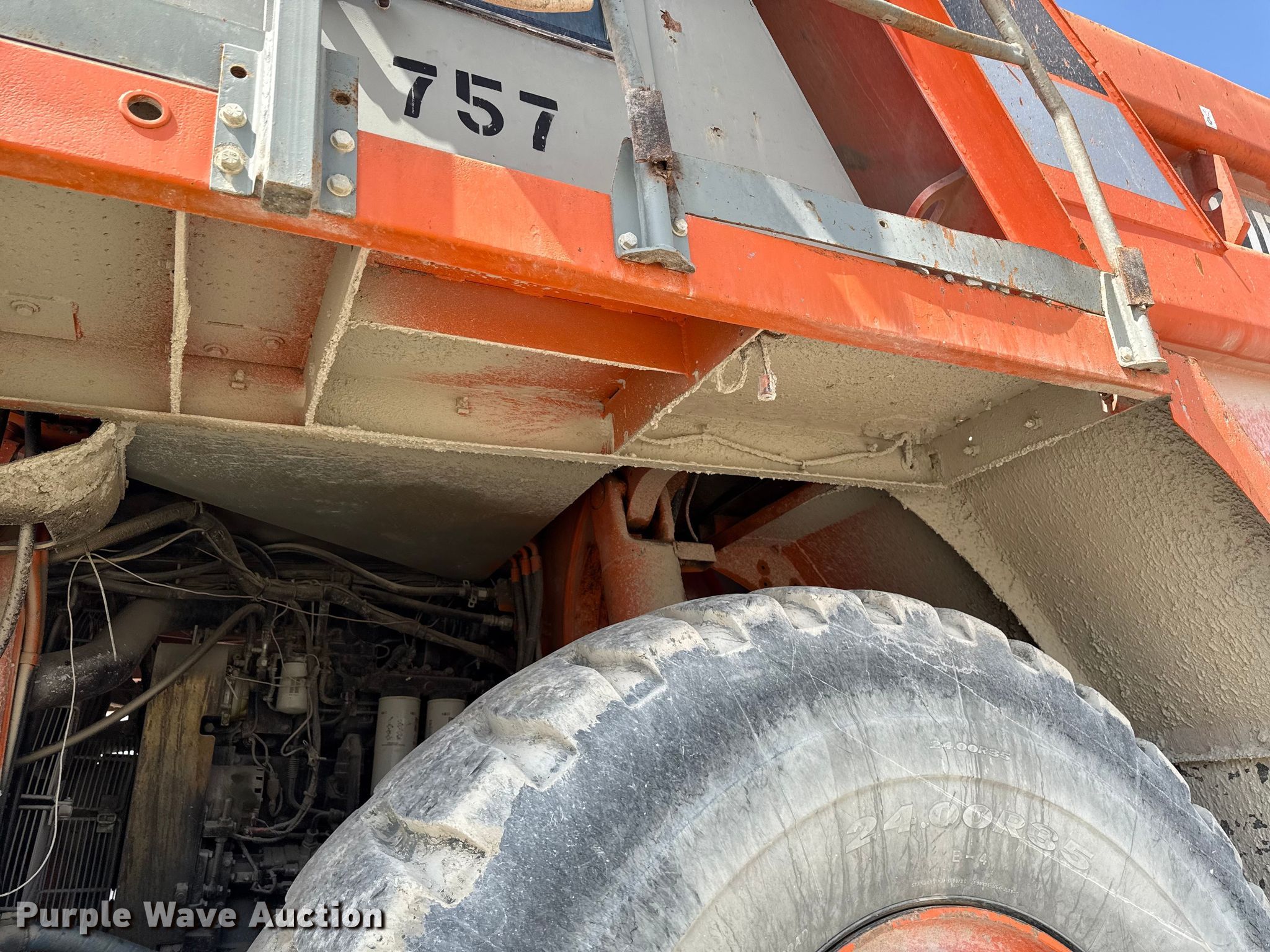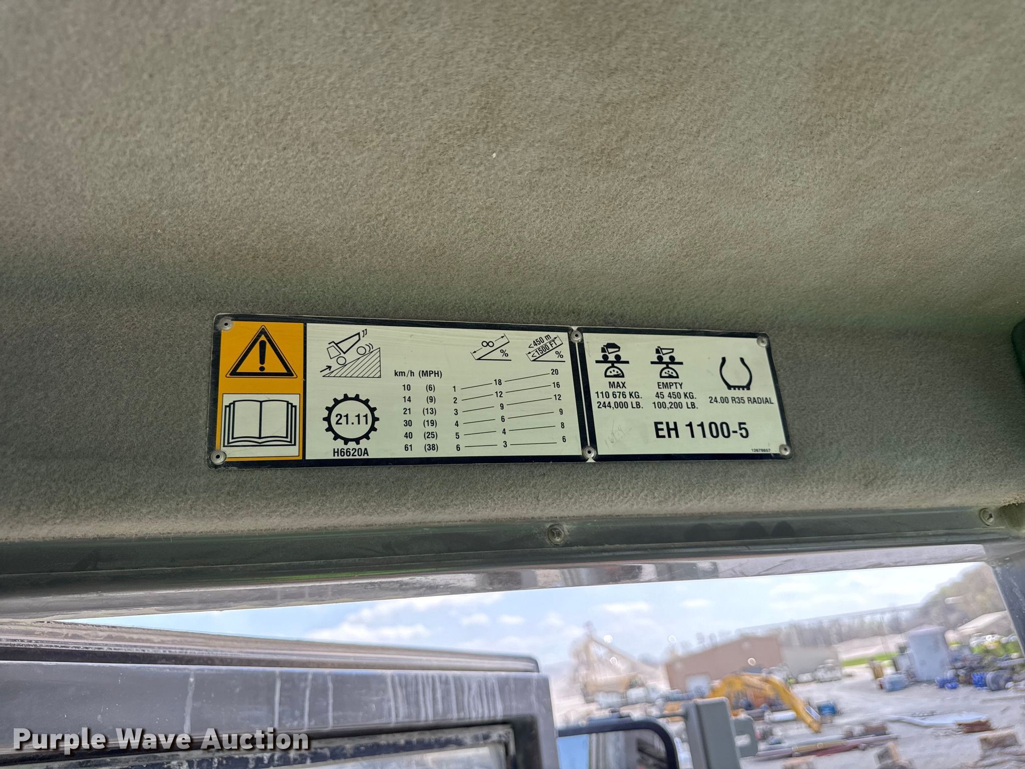 2015 Hitachi EH1100-5 haul truck. Miles: 116,594 on odometer, Hours: 19,465 on meter, Serial: HTMQBA80N00002004. Engine Cummins, Cylinders: 6, Fuel type: Diesel. Transmission Allison, Automatic. Interior AC, Heat. Features Dump bed Capacity: 70 tons. Tires Size: 24.00R35. Notes Dash warning indicator: Transmission Temp Error, Steering fluid leak. Battletown Materials, LLC. Battletown, KY 40104