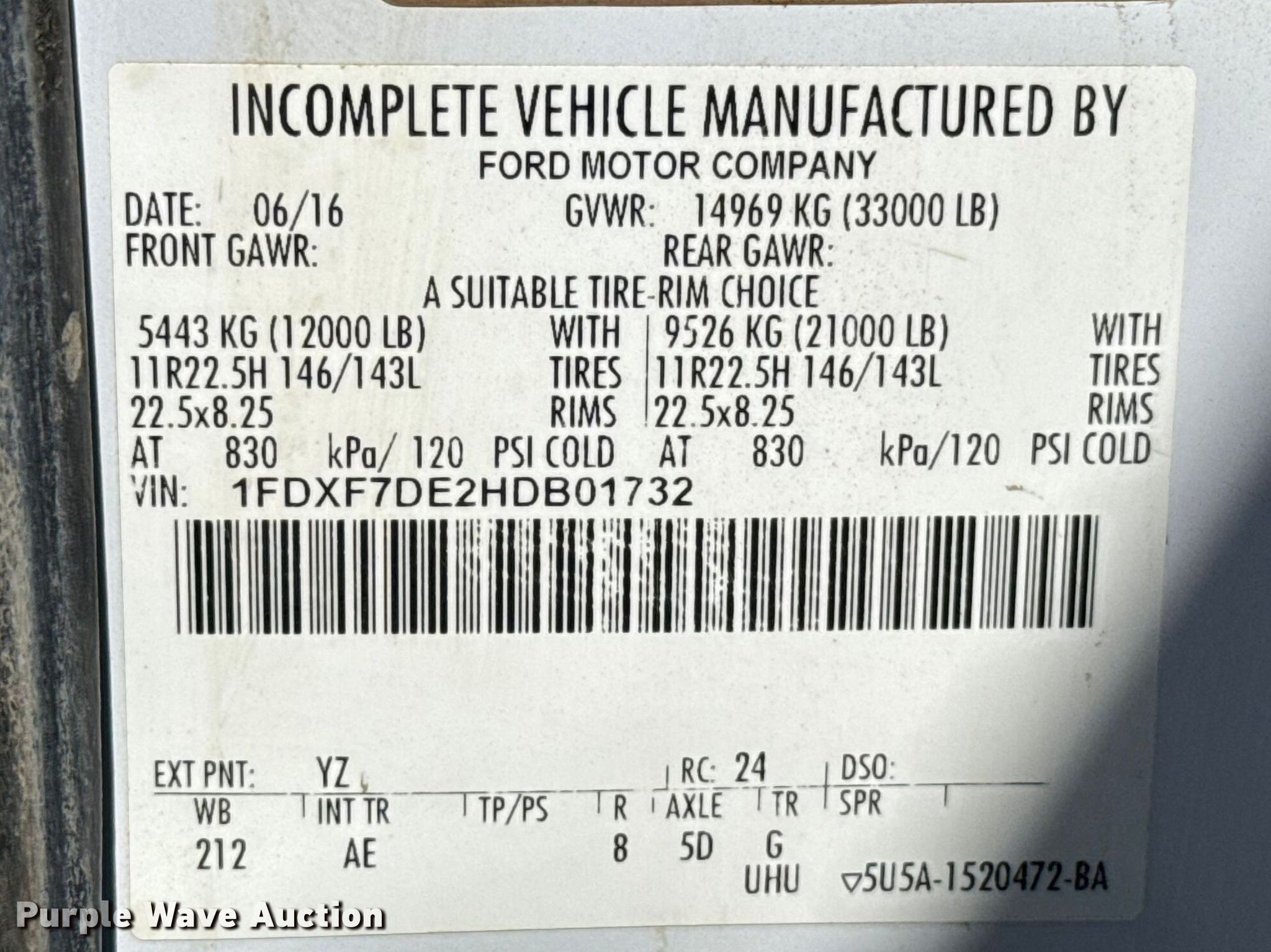 2017 Ford F750 Super Duty hydrovac truck. Miles: 179,923 on odometer, Hours: 2,082 on meter, VIN: 1FDXF7DE2HDB01732. Engine Displacement: 6.7L, Cylinders: 8, Fuel type: Diesel. Transmission Automatic. Chassis Axles: Single, Suspension: Spring, Brakes: Air, PTO, GVWR: 33,000 lbs, Wheelbase: 212". Interior AC, Heat, Cruise control, Auxiliary controls, Brake controller. Features Bed Tank bed, Vac-Tron, Length: 12', Width: 96", Capacity: 800 gallons, Rear manway, Rear outlet: 6", Vacuum pump Vac-Tron Equipment LLC HTV873PT0, Serial: 161203, Hose reel Rear, Manual. Tires Size: 11R22.5. Notes Dash warning indicator: Check engine, ABS, Boom missing. Oklahoma title. Title distribution may be delayed up to 30 days from verification of funds. Norman, OK 73072