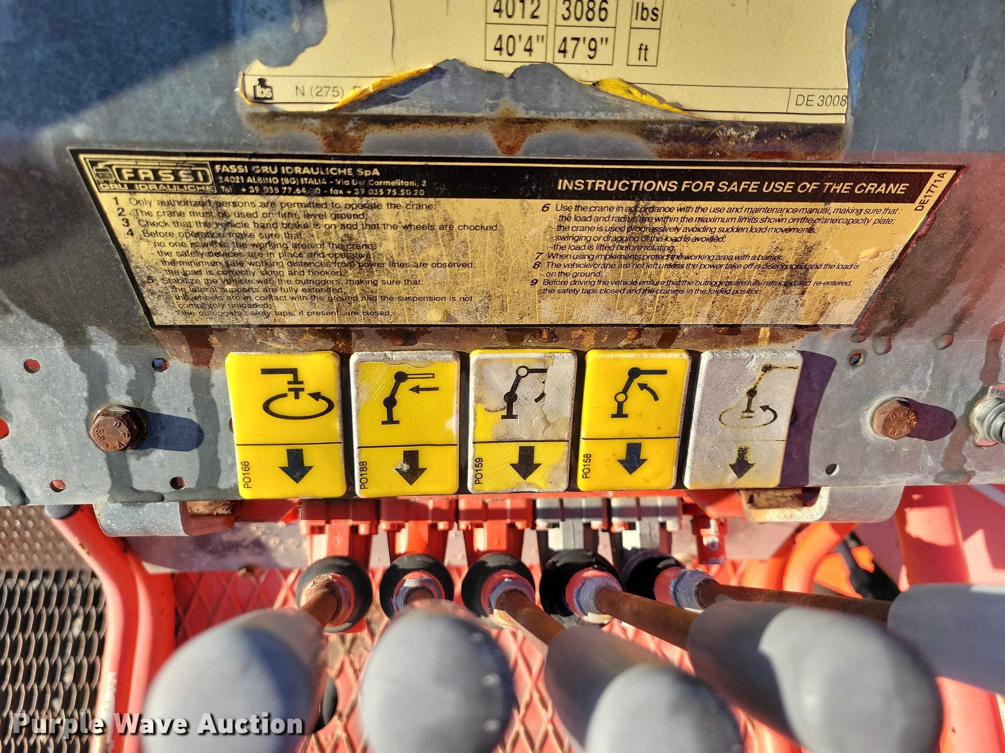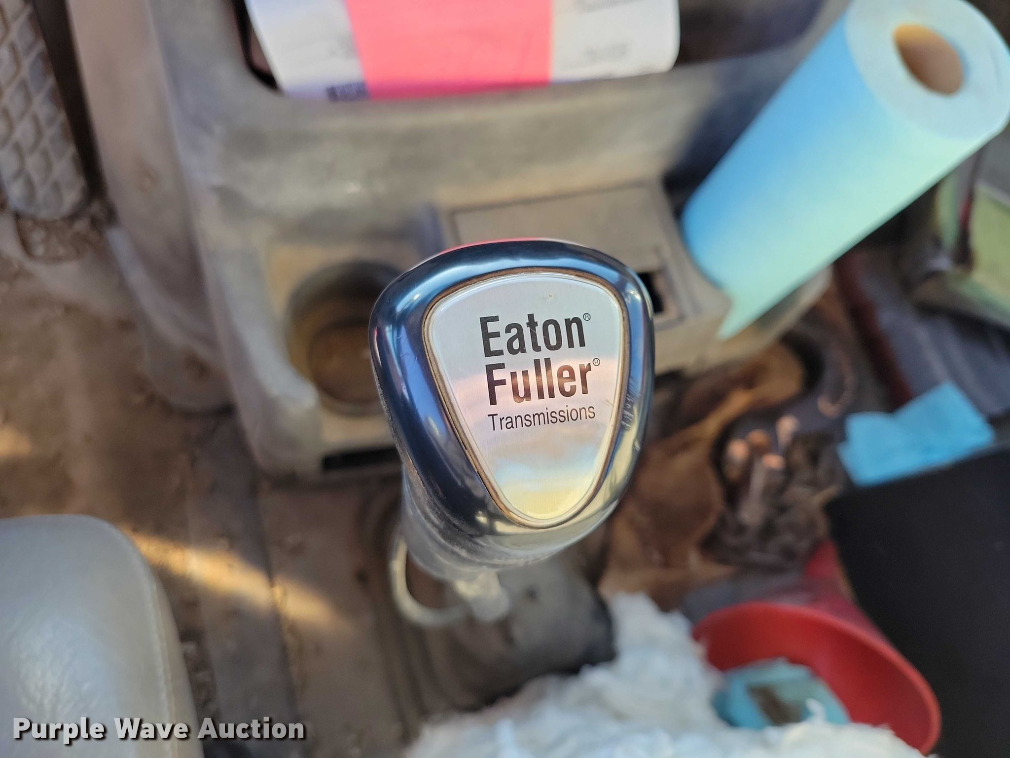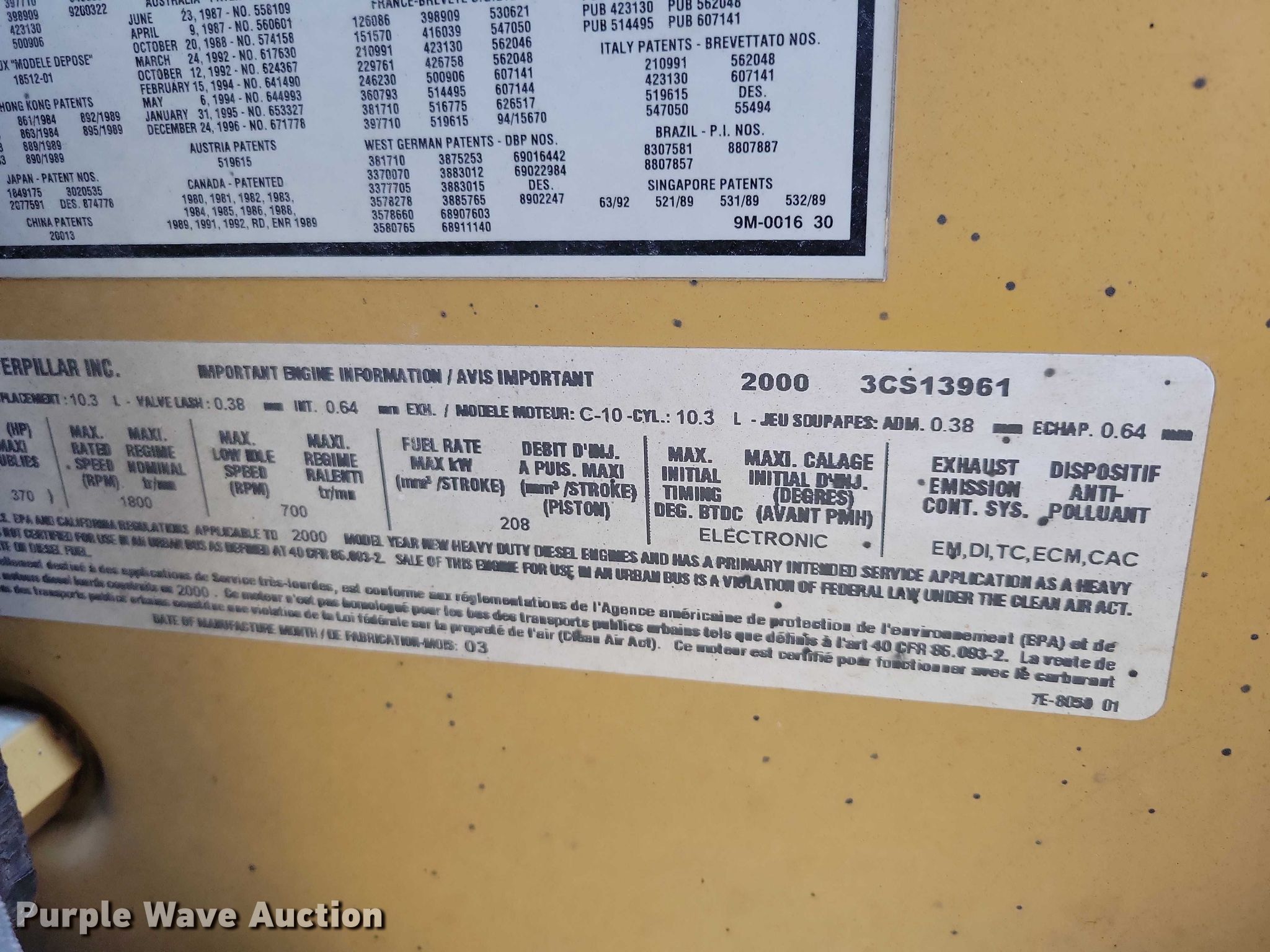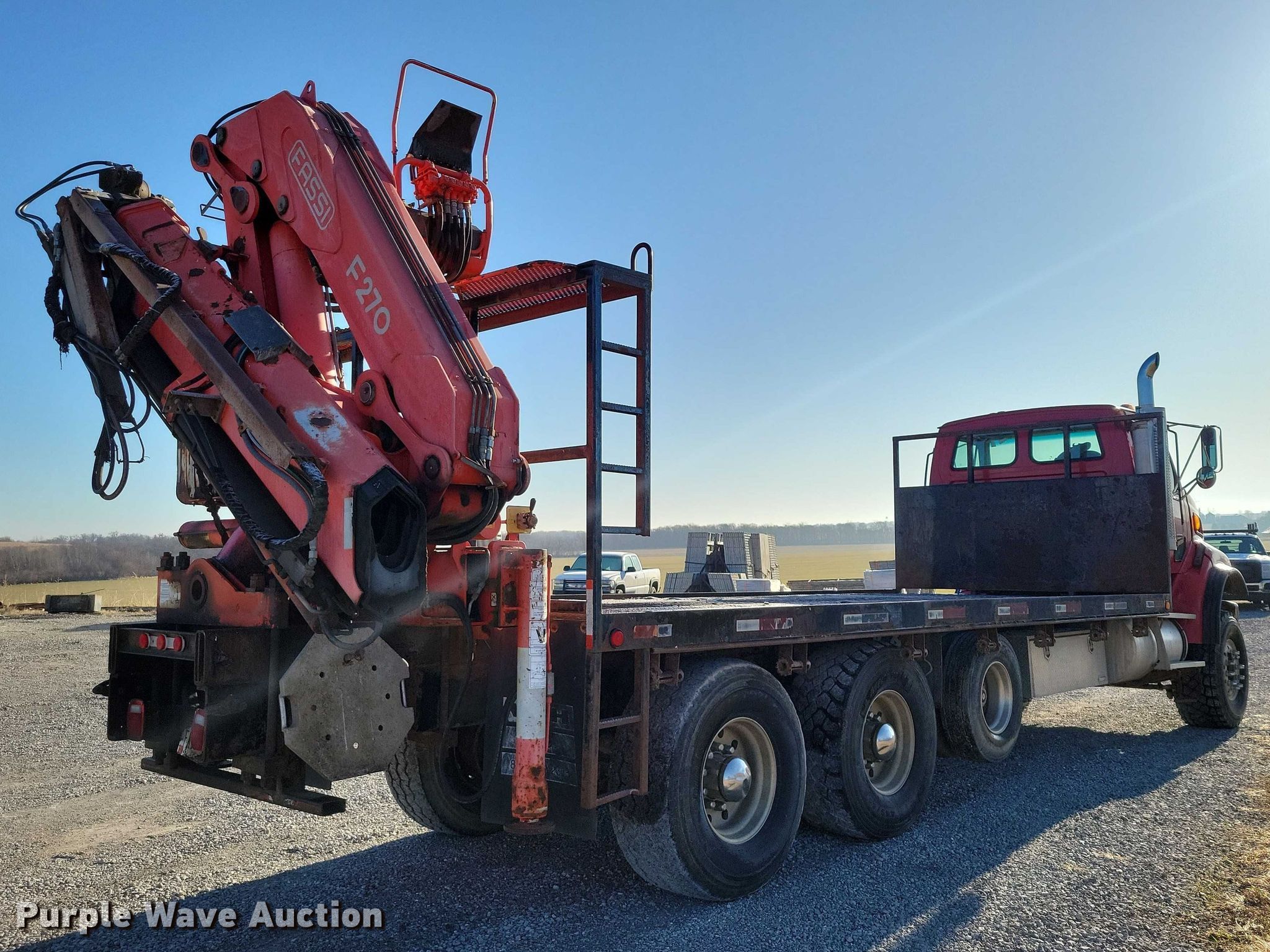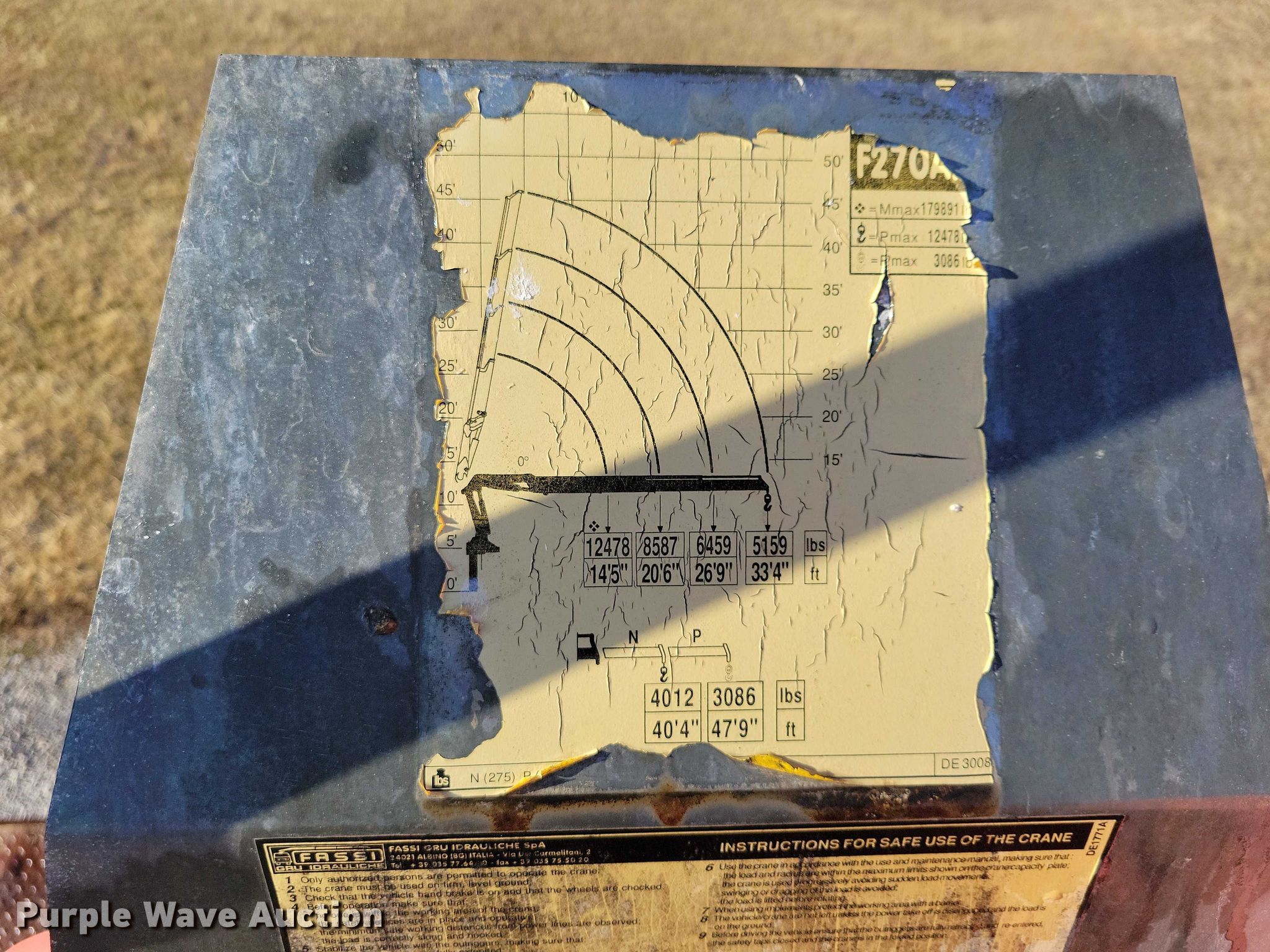 2000 Sterling LT 9500 crane truck. Miles: 66,620 on odometer, VIN: 2FZXEECB9YAF99514. Engine Caterpillar C-10, Serial: 3CS13961, Displacement: 10.3L, Cylinders: 6, Fuel type: Diesel, HP: 370. Transmission Eaton Fuller Roadranger, Manual, Speed: 9. Chassis Four wheel drive, Axles: Triple, Pusher axle, Differential lock: Full, Suspension: Spring over walking beam, Brakes: Air, PTO, GVWR: 64,740 lbs FAWR: 18,740 lbs, IAWR: 23,000 lbs, RAWR: 23,000 lbs. Interior Heat, Cruise control. Features Bed Flatbed, Length: 23', Width: 102", Crane Fassi F270, Boom Telescopic, Knuckle, Maximum boom length: 45' Sections: 5, Maximum lift capacity: 12,478 lbs, Boom controls, Lift chart. Tires Size: 445/65R22.5, Lift axle: 10R17.5. Notes Dash warning indicator: Stop engine, Engine warning, Contents not included, Unknown operating condition of crane. Iowa title. Title distribution may be delayed up to 14 days from verification of funds. Roberts Construction Inc. Victor, IA 52347