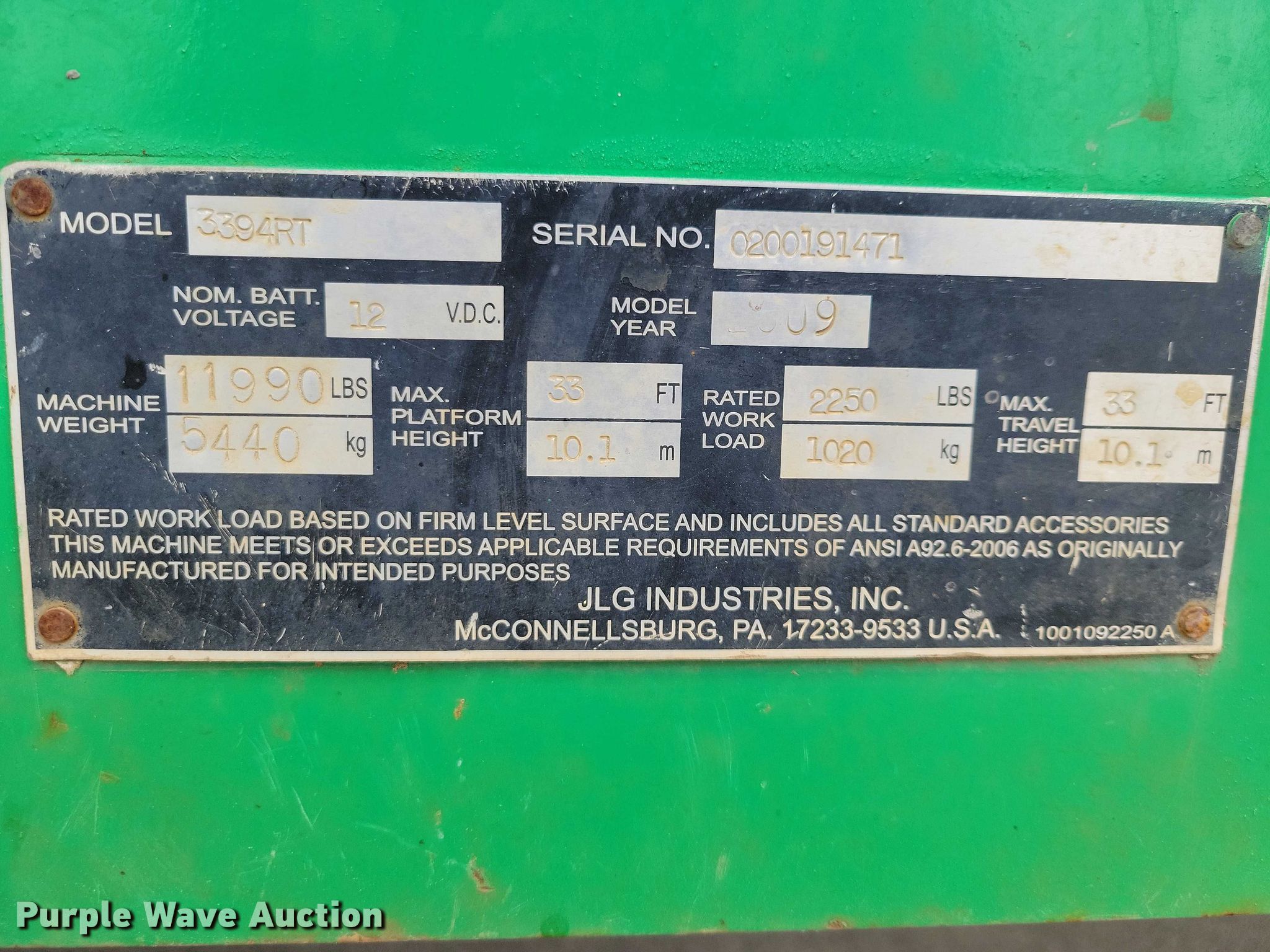 Purple Wave is selling a used Scissor or Vertical Lift in Iowa. This item is a 2009 JLG 3394RT scissor lift with the following: Hours: 1,136 on meter, Serial: 0200191471