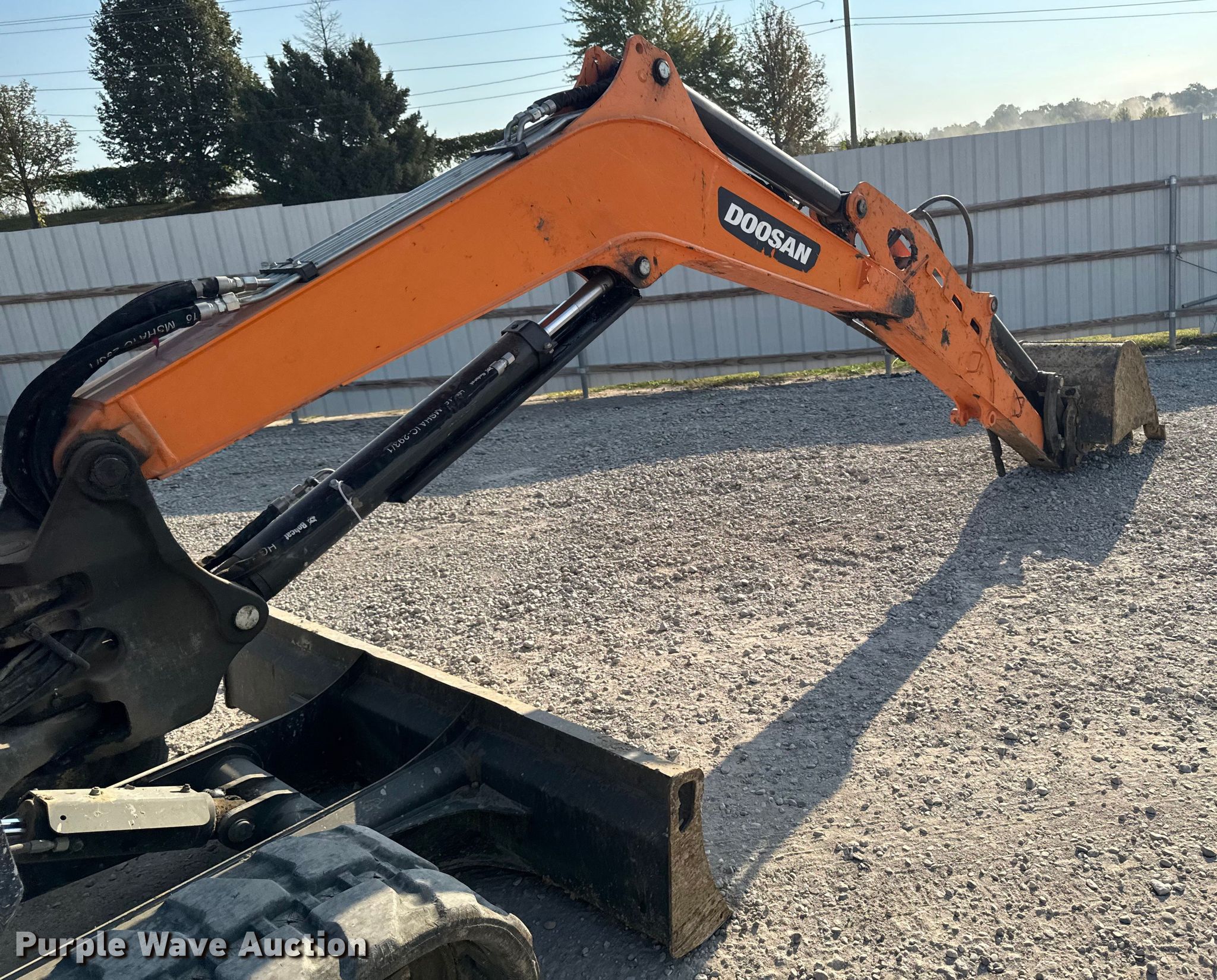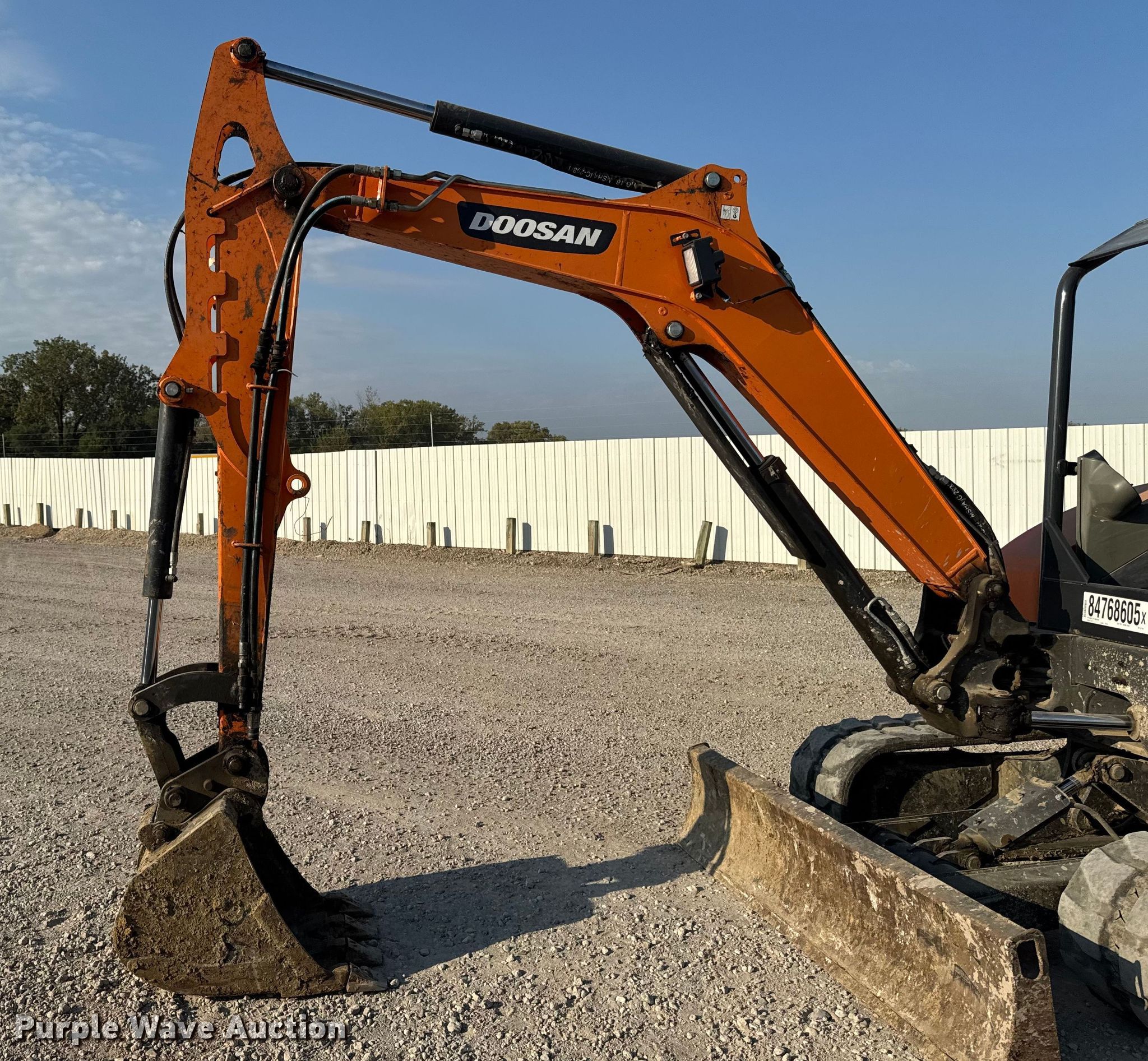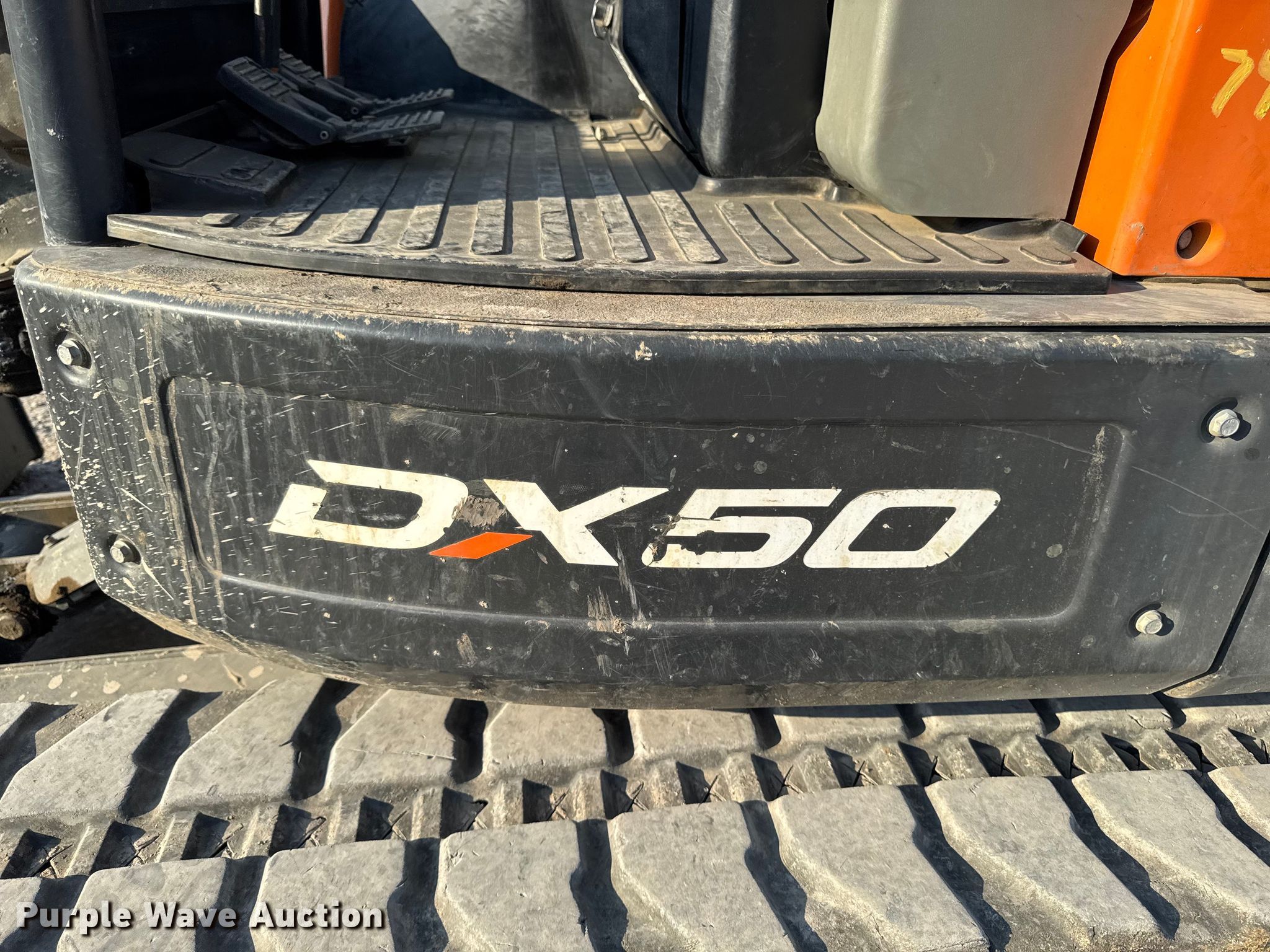 2020 Doosan DX50 mini excavator. Hours: 2,481 on meter, Serial: DBMB4WYJLK0011104, Unit #: 84768605. Engine Doosan, Cylinders: 3, Fuel type: Diesel. Transmission Hydrostatic, Two speed travel. Operators station OROPS, Pattern changer. Features Auxiliary hydraulics Standard, Counter weights, Backfill blade Width: 78", Boom Swing, Stick Stick length: 77", Quick coupler: Mechanical, Bucket Width: 24", Teeth: 4. Tracks Width: 16", Rubber. Repossessed item, stored at a secured facility. Please review REQUIRED REMOVAL INSTRUCTIONS. Lender Owned. Des Moines, IA 50313