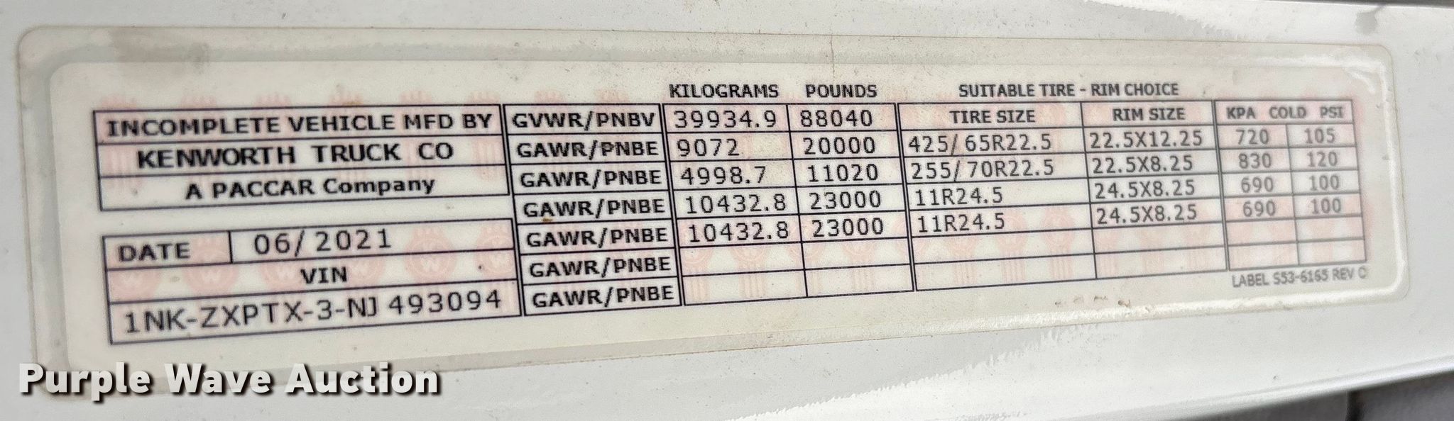 2022 Kenworth T880 dump truck. Miles: 109,879 on odometer, Miles: Actual unknown, VIN: 1NKZXPTX3NJ493094, Unit #: 98814405. Engine Paccar MX-13, Displacement: 12.9L, Cylinders: 6, Fuel type: Diesel, Engine brake. Transmission Allison, Automatic. Chassis Axles: 4, Pusher axle Steerable, Differential lock: Full, Suspension: Air Dump valves, Brakes: Air, PTO, GVWR: 88,040 lbs. Interior AC, Heat, Heated mirrors, Power windows, Cruise control. Features Bed Dump bed, Godwin SCS170480121, Serial: 0048635, Length: 17' 2", Width: 87", Side height: 48", Side board height: 12", Bed type: Steel, Roll tarp, Ram: Single, End gate: Air operated. Tires Front: 425/65R22.5, Rear: 11R24.5, Lift axle: 255/70R22.5. Notes Dash warning indicator: Low voltage disconnect, Broken glass, Rollover damage, Biohazard material may be present, Windshield chipped or cracked, Non-operational unit Unit must be towed or hauled. Buyer responsible for all aspects of loadout and removal. Insurance salvage, stored at a secured facility. Please review REQUIRED REMOVAL INSTRUCTIONS. Titles will be distributed after confirmation of payment and removal. North Carolina salvage title. Mileage has not been verified. Odometer discrepancy will be marked on the title. Title distribution may be delayed up to 30 days from verification of funds. Insurance Salvage. 4019 North Carolina Highway 72. Lumberton, NC 28360