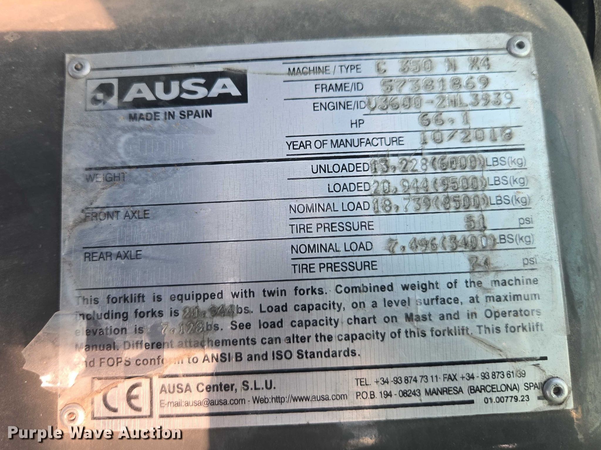 2018 Ausa C350H X4 forklift. Hours: 402 on meter, Serial: 57381869, Unit #: 74478555. Engine Kubota V3600, Displacement: 3.6L, Cylinders: 4, Fuel type: Diesel. Transmission Powershift. Chassis Four wheel drive. Operators station Enclosed cab, Heat. Features Maximum lift capacity: 3,233 lbs, Maximum lift height: 128", Collapsed mast height: 105", Mast stages: 2, Mast tilt, Fork length: 48". Tires Front: 16/70-20, Rear: 10/75-15.3. Notes Jump start required during on-site data collection. Copart fleet inventory reduction, stored at a secured facility. Please review REQUIRED REMOVAL INSTRUCTIONS. Copart Fleet Inventory Reduction. Eight Mile, AL 36613