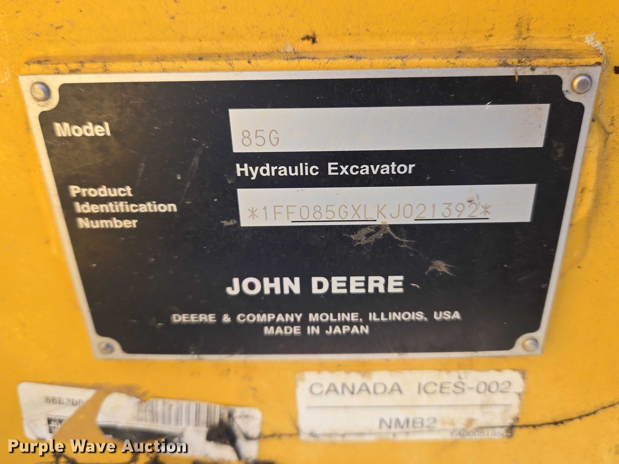 Purple Wave is selling a used Mini Excavator in Indiana. This item is a 2019 John Deere 85G mini excavator with the following: Hours: Unknown, Serial: 1FF085GXLKJ021392, Unit #: 74231515