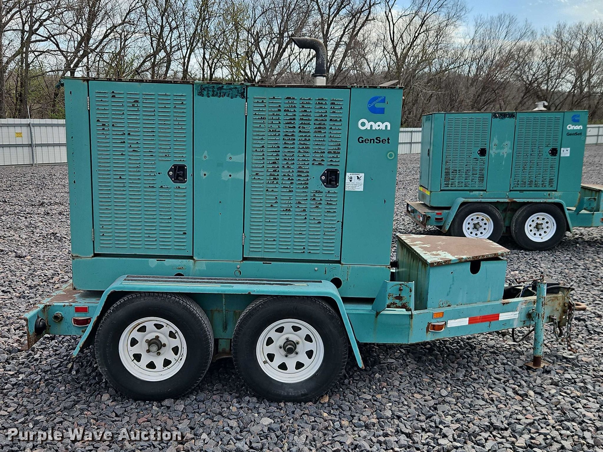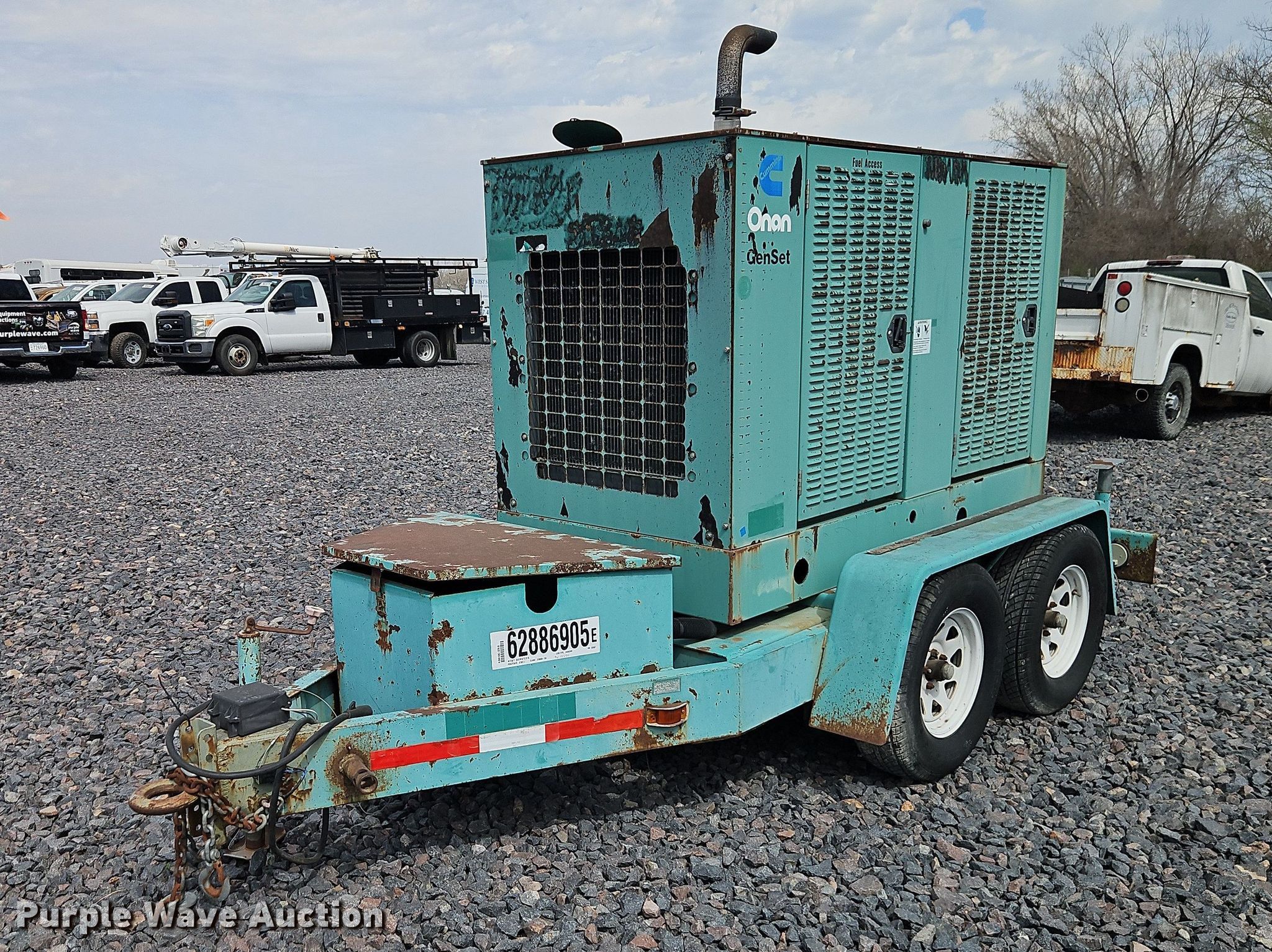 1999 Onan DGBC-3378898 generator. Hours: 808 on meter, Serial: J990006443, Unit #: 62886905. Engine Cummins 4B3.9-G2, Serial: 45904513, Displacement: 3.9L, Cylinders: 4, Fuel type: Diesel. Features Generator kVA: 40, kW: 40, Phase: Single, Three, Electric start, Fuel tank. Trailer 12' L x 72" W, Hitch: Pintle, Suspension: Spring, Brakes: Electric, Axles: Tandem, Tire size: 225/75R15. Notes Jump start required during on-site data collection. Telecom fleet inventory reduction, stored at a secured facility. Please review REQUIRED REMOVAL INSTRUCTIONS. This is worksite support equipment and will not come with a title. Transfer of ownership documentation will be a bill of sale. Telecom Fleet Inventory Reduction. 6211 Kansas Avenue. Kansas City, KS 66111