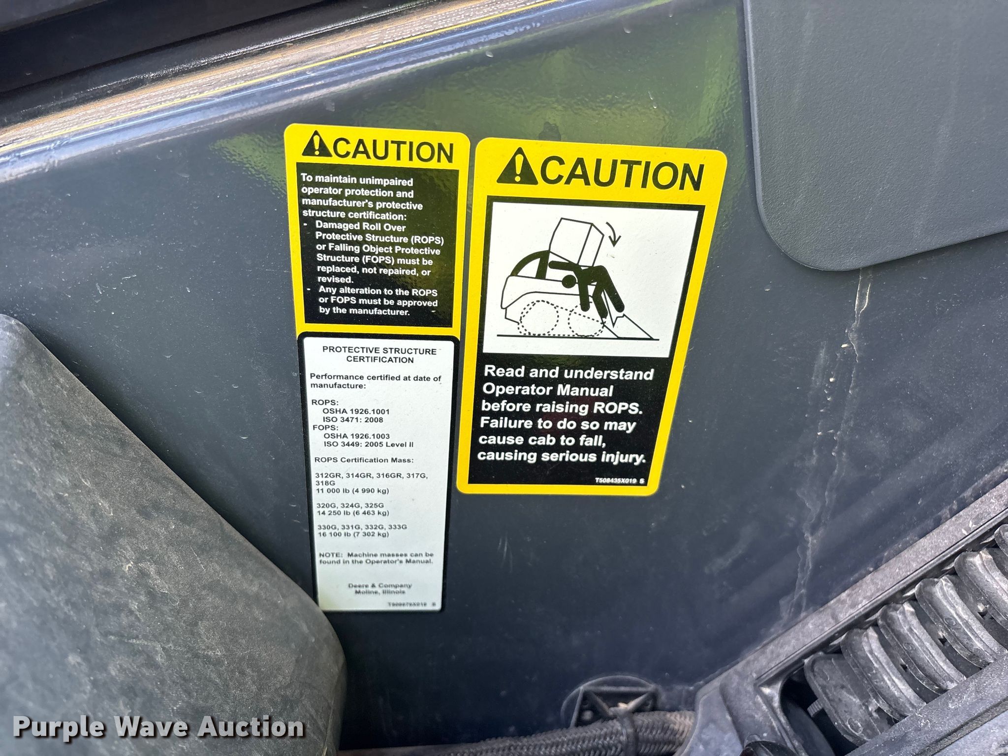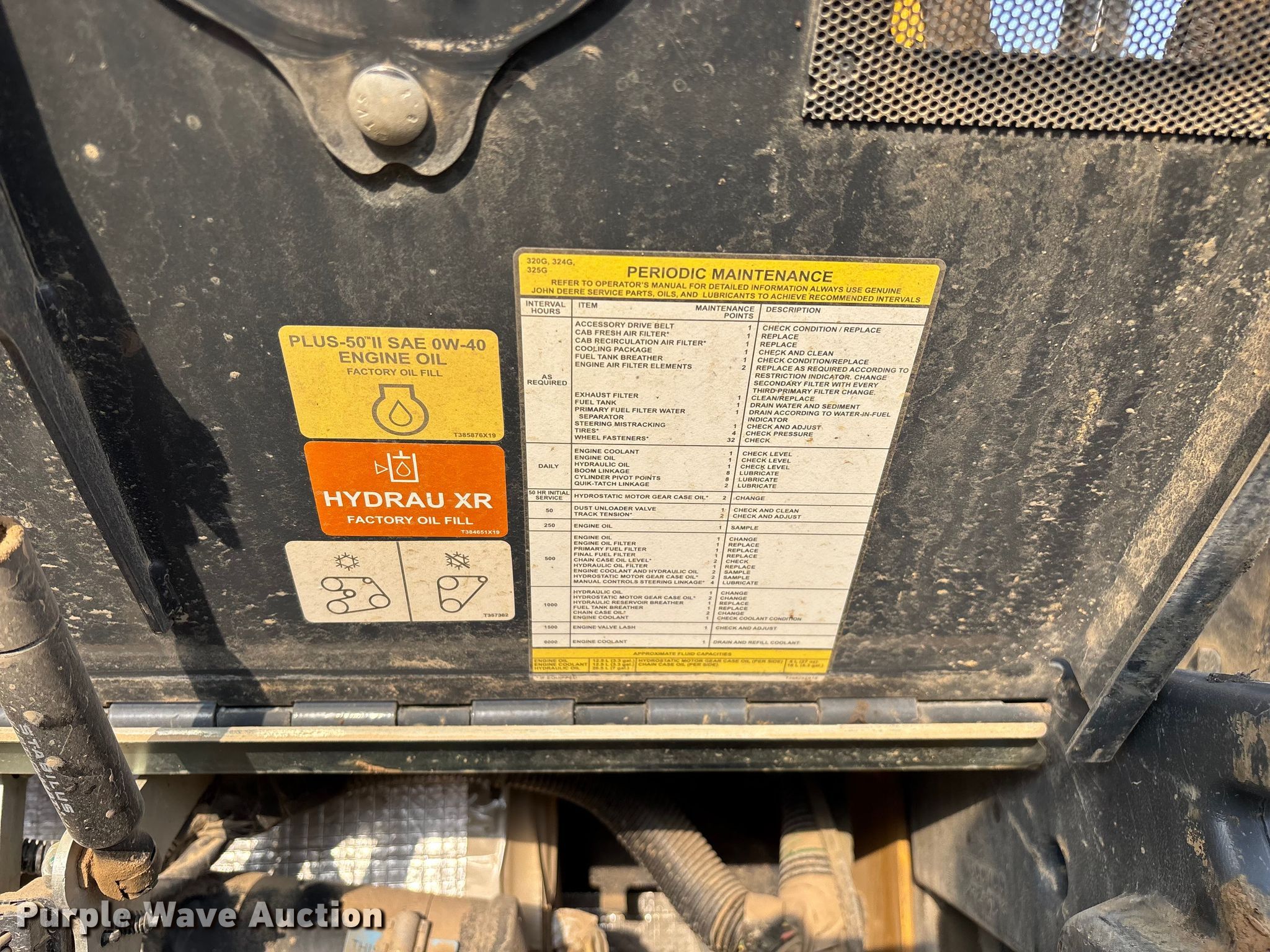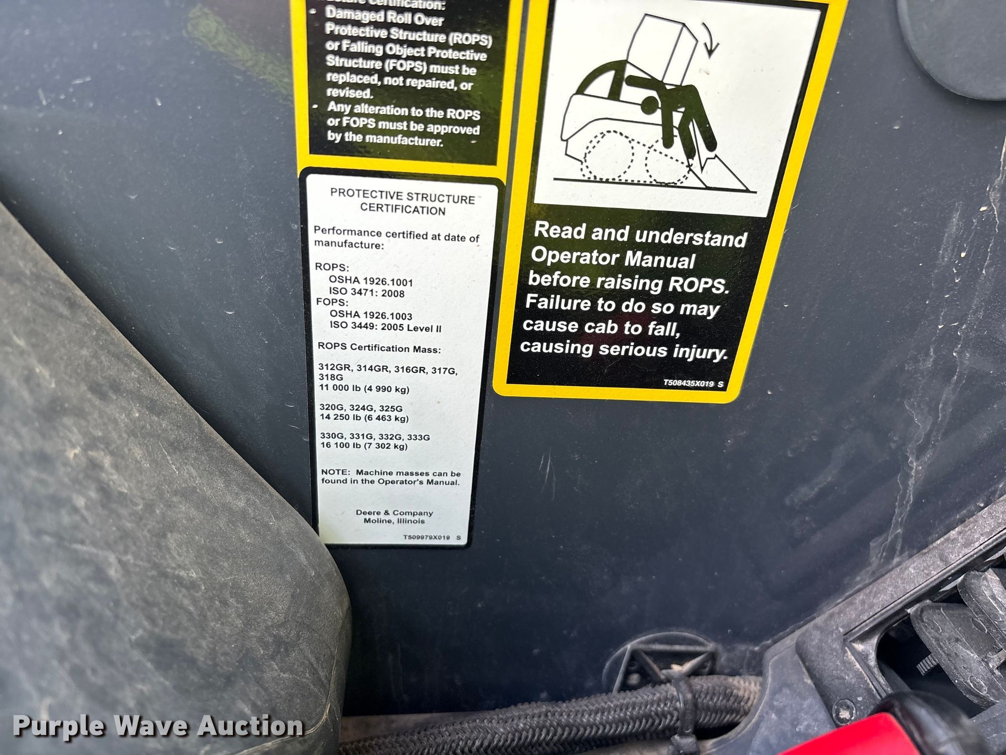 2025 John Deere 325G tracked skid steer loader. Hours: 422 on meter, Serial: 1T0325GKCSJ473979, Unit #: 46101086. Engine Yanmar 4TTNACJ, Displacement: 3.319L, Cylinders: 4, Fuel type: Diesel. Transmission Hydrostatic, Two speed travel. Operators station Enclosed cab, AC, Heat, Backup camera, Bucket control: Hand, Pattern changer. Features Auxiliary hydraulics, Auxiliary electrical outlet, Quick coupler: Hydraulic, Bucket John Deere C78, Capacity: 0.71 cu.yd., Width: 78", Cutting edge: Bolt-on. Tracks Width: 16". Notes Collision damage. Buyer responsible for all aspects of loadout and removal. Insurance salvage, stored at a secured facility. Please review REQUIRED REMOVAL INSTRUCTIONS. Insurance Salvage. Indianapolis, IN 46254