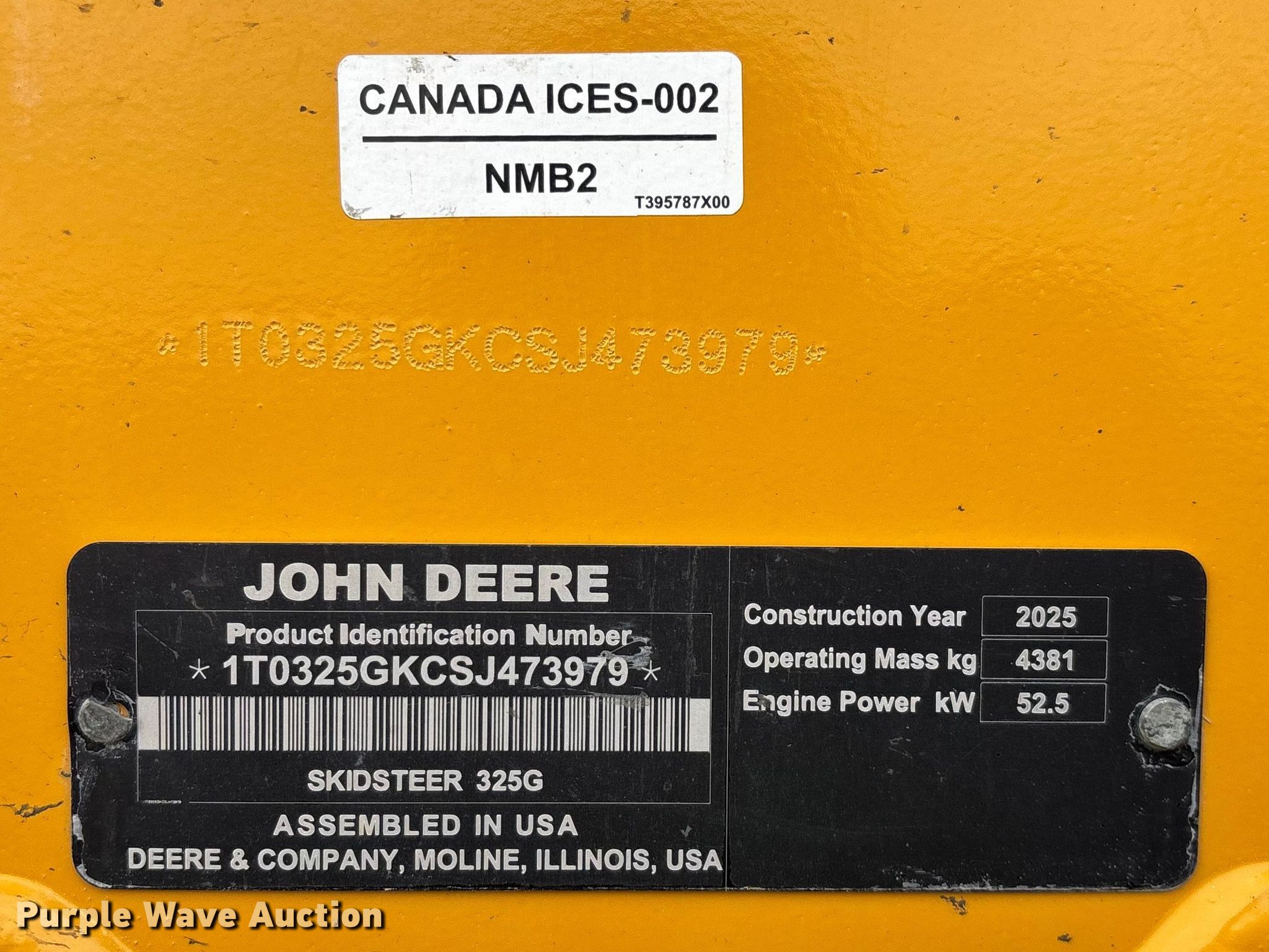 Purple Wave is selling a used Tracked Skid Steer Loader in Indiana. This item is a 2025 John Deere 325G tracked skid steer loader with the following: Hours: 422 on meter, Serial: 1T0325GKCSJ473979, Unit #: 46101086