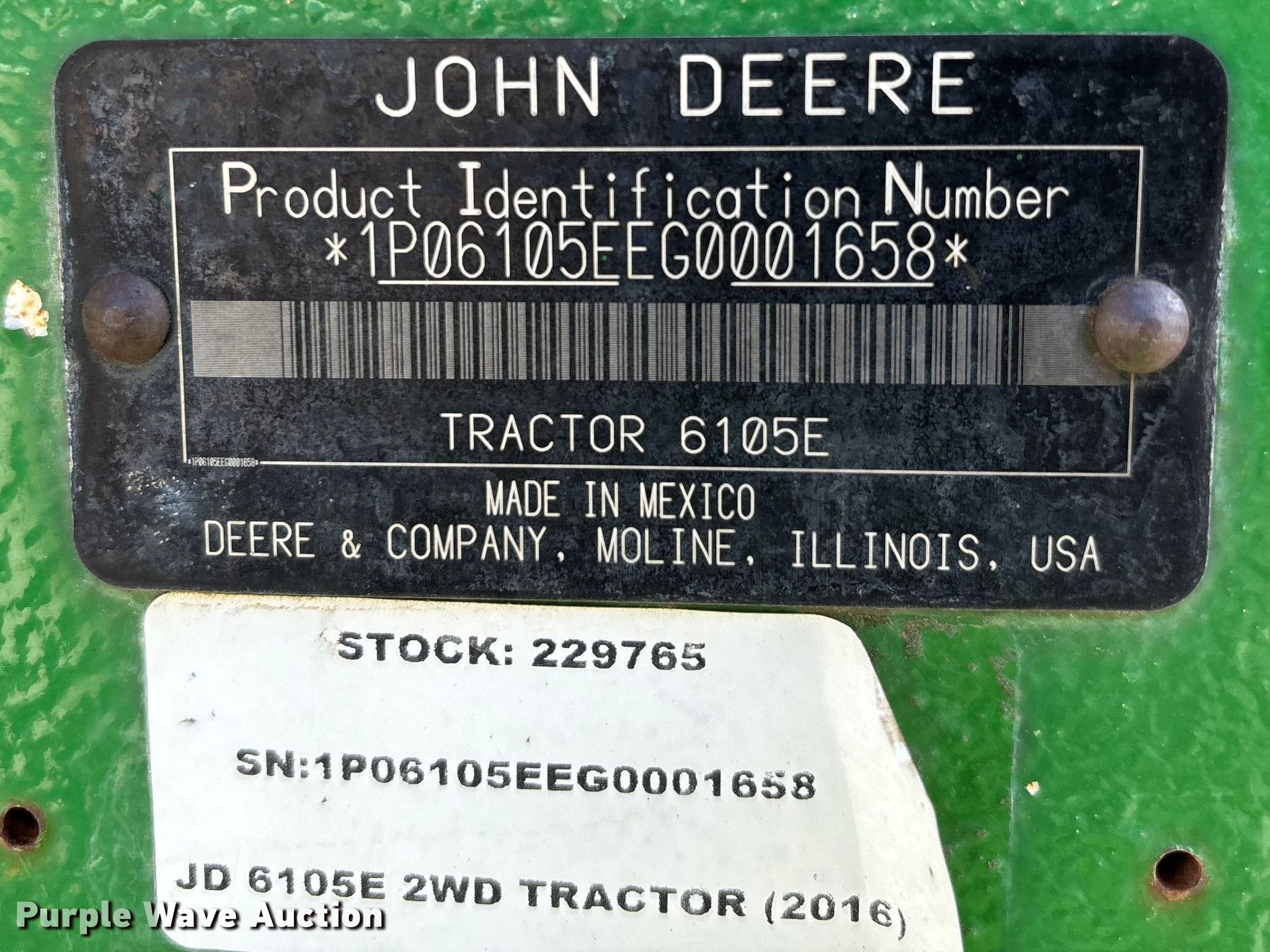 Purple Wave is selling a used Tractor in Kentucky. This item is a 2014 John Deere 6105E tractor with the following: Hours: 4,258 on meter, Miles or hours may vary, unit still in use, Serial: 1P06105EEG0001658