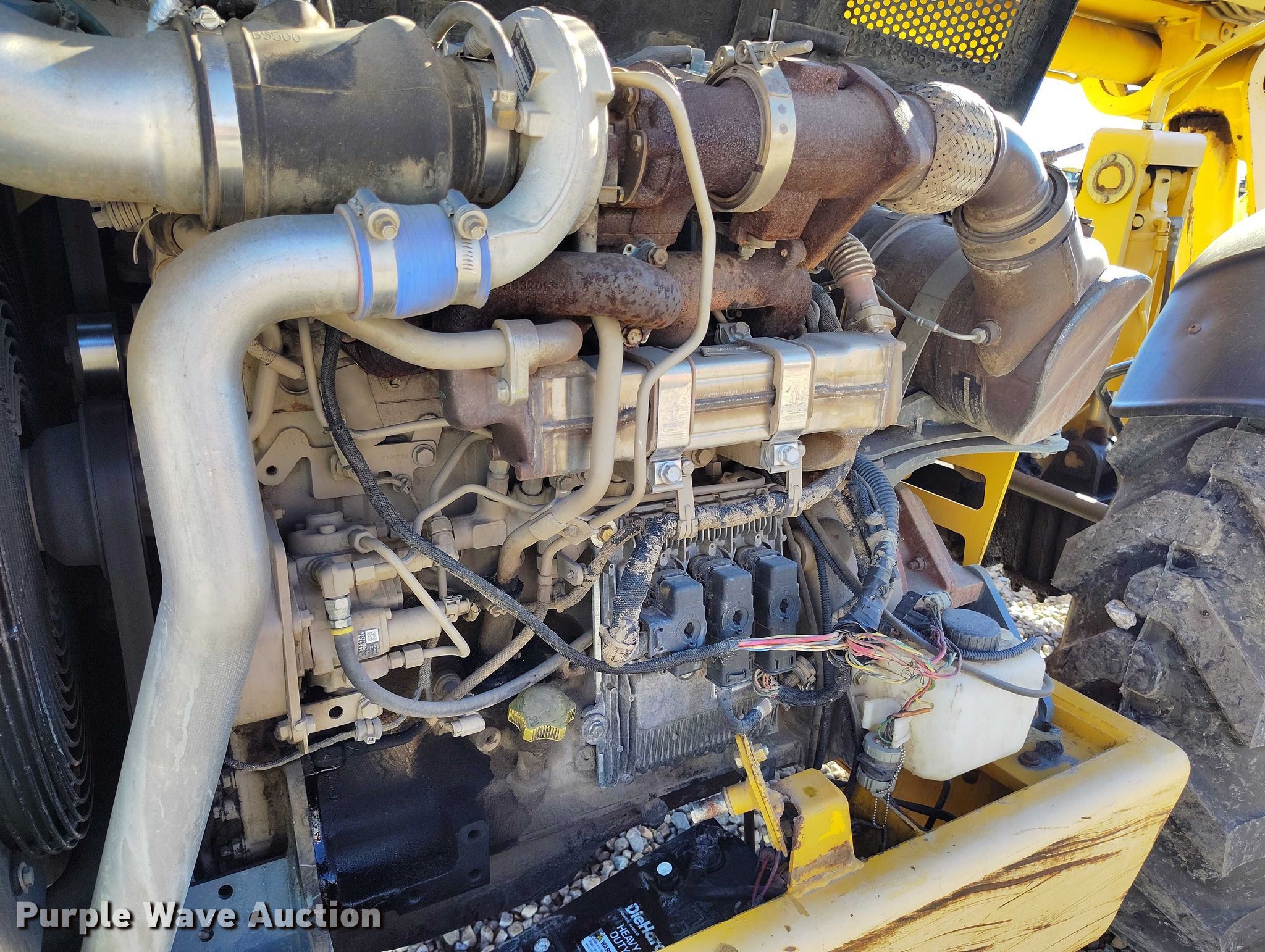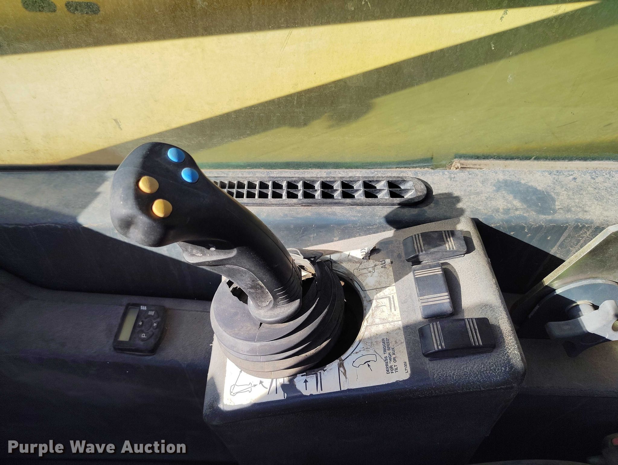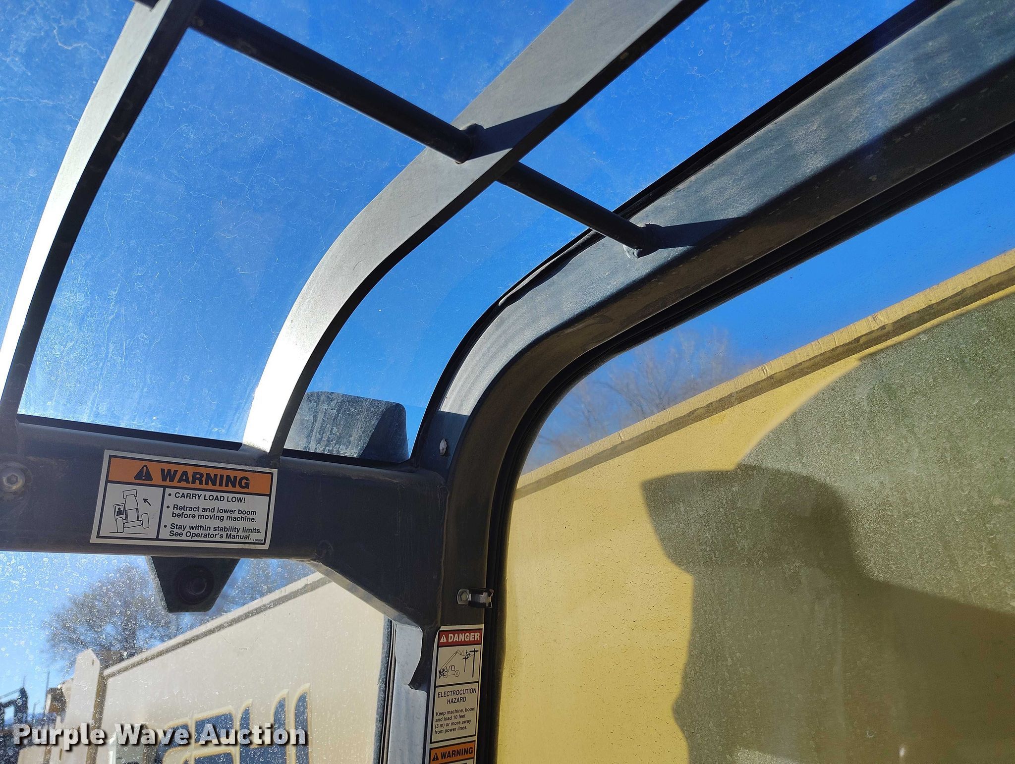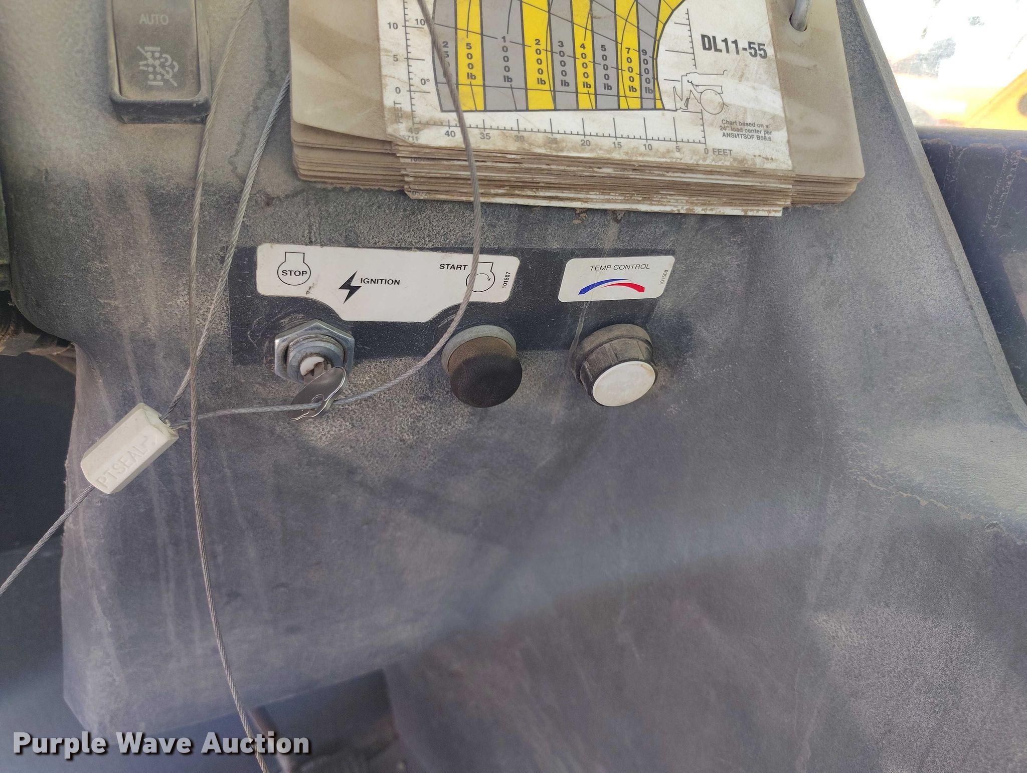 Gehl DL11-55 telehandler. Hours: Unknown, Serial: DL1155HJE0841627. Engine John Deere, Cylinders: 4, Fuel type: Diesel. Transmission Powershift, 4F - 4R, Four wheel drive. Operators station Enclosed cab, AC, Heat, Steering: Crab, Four wheel. Features Maximum lift capacity: 11,000 lbs, Maximum lift height: 55', Boom stages: 3, Fork length: 72", Auxiliary hydraulics, Hydraulic outriggers, Hydraulic leveling, Quick attach: Hydraulic. Tires Size: 14.00-24. Notes Non-operational hour meter, Electrical issues, drains battery, unknown oppcon of AC, Non-operational fork tilt, Hydraulic outrigger issues, leaks, Possible coolant issues. Grand Park. Commerce City, CO 80022
