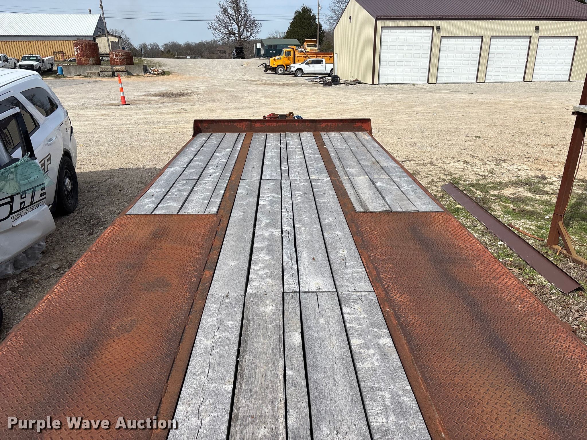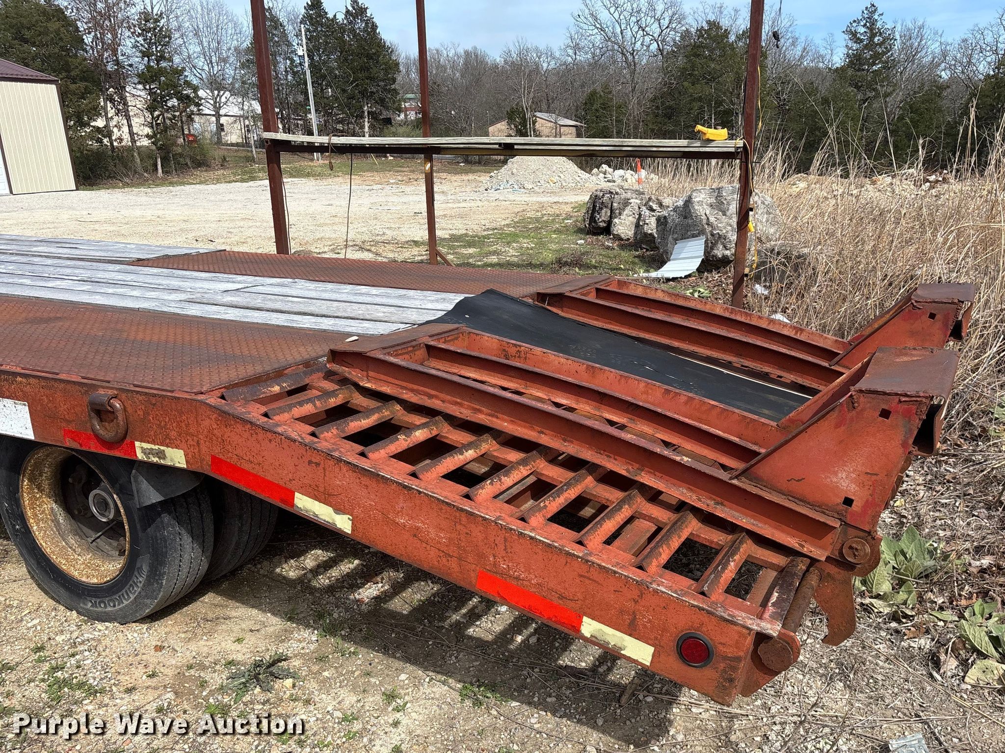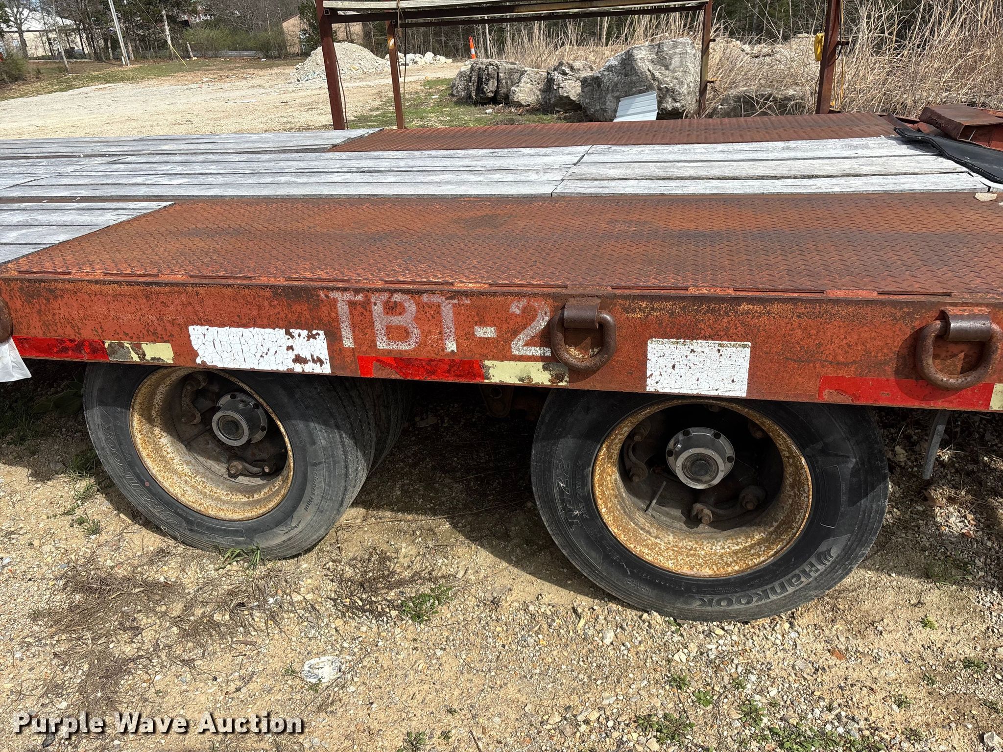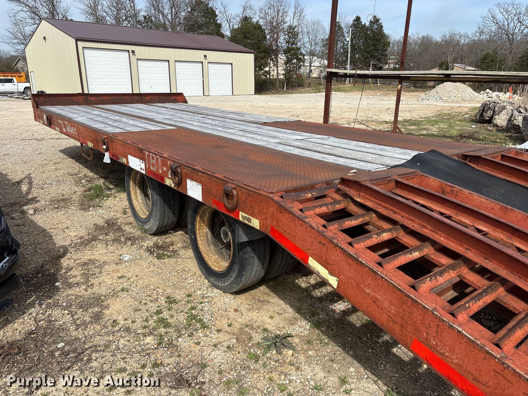 1995 Talbert equipment trailer. VIN: 40FR03026T5013589, Unit #: 71. Dimensions Overall Length: 30' 4", Width: 105", Deck Length: 18' 9", Width: 101", Deck height: 34", Tail length: 63", Ramps: Manual Length: 59". Features Deck type: Wood. Chassis Hitch: Pintle, Landing gear: Single, Suspension: Spring, Brakes: Air, Axles: Tandem, GVWR: 49,000 lbs, GAWR: 18,160 lbs. Tires Steel wheels, Size: 215/75R17.5. Notes Decals will be removed prior to auction, Brake issues. Missouri title. Title distribution may be delayed up to 14 days from verification of funds. Taney County, MO. Kissee Mills, MO 65680