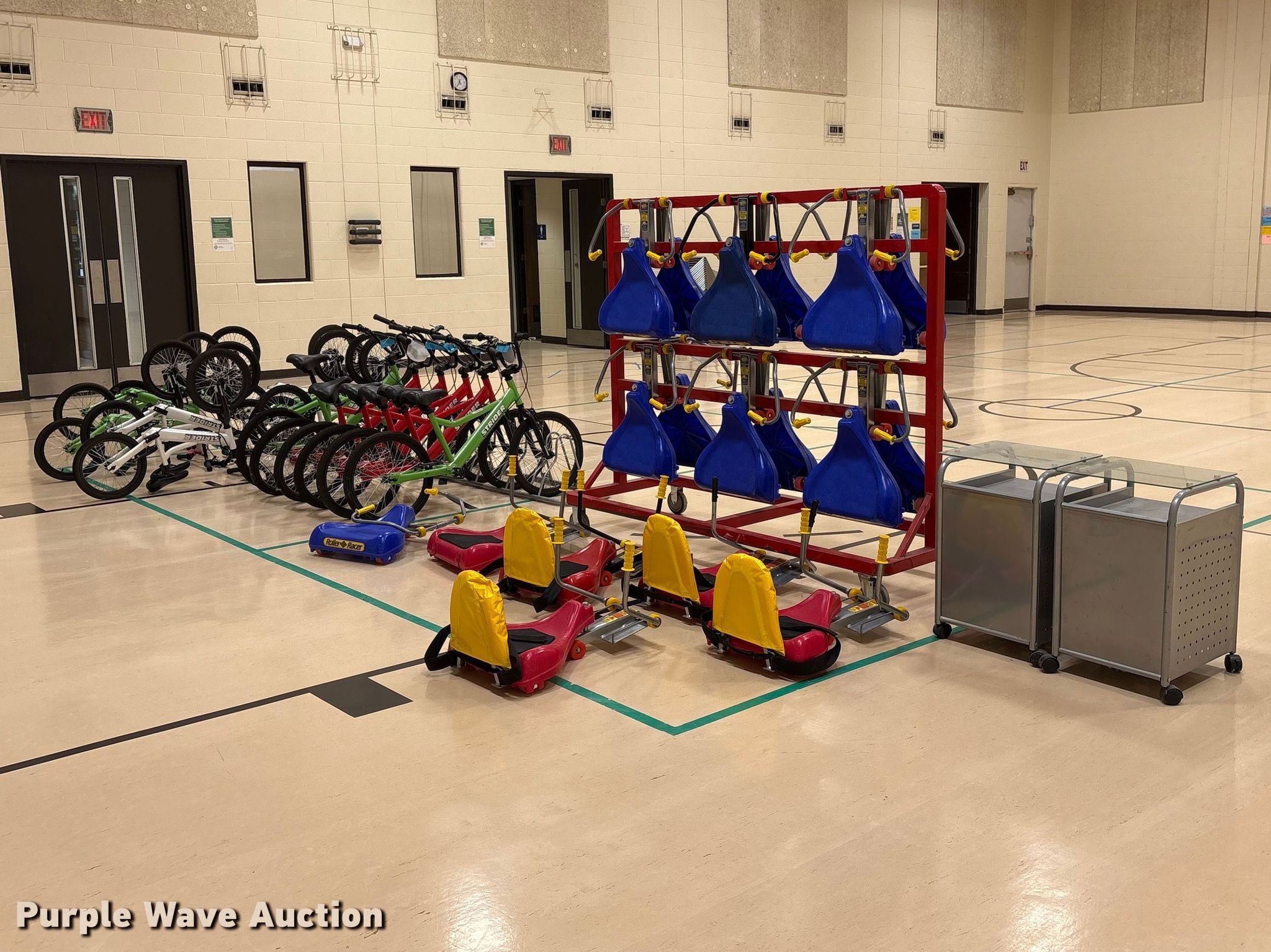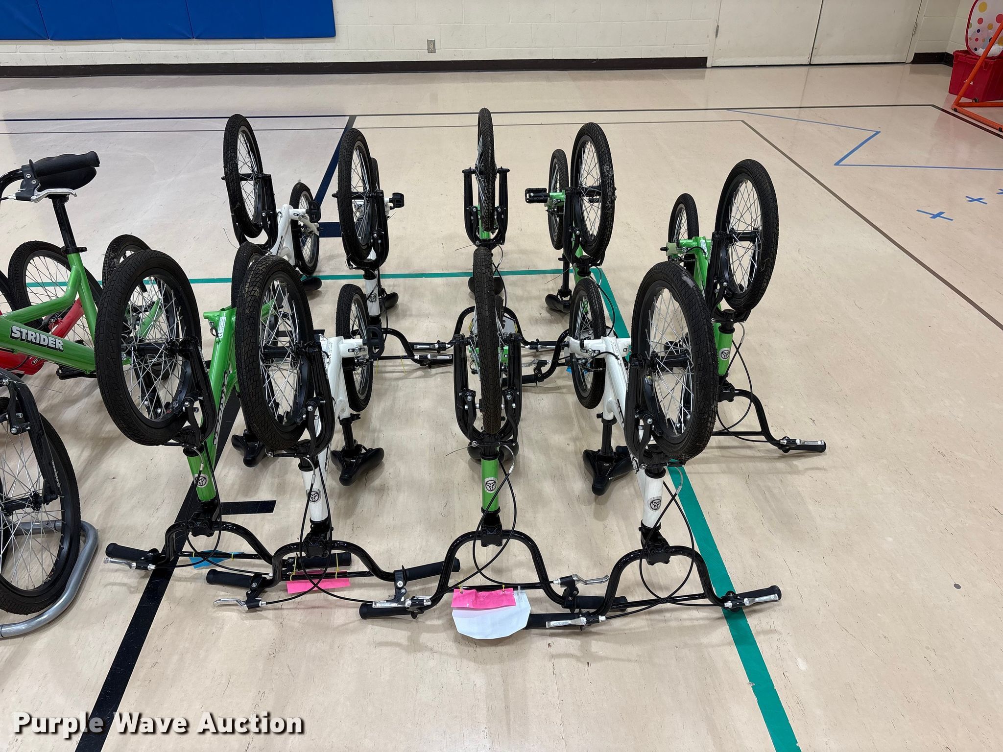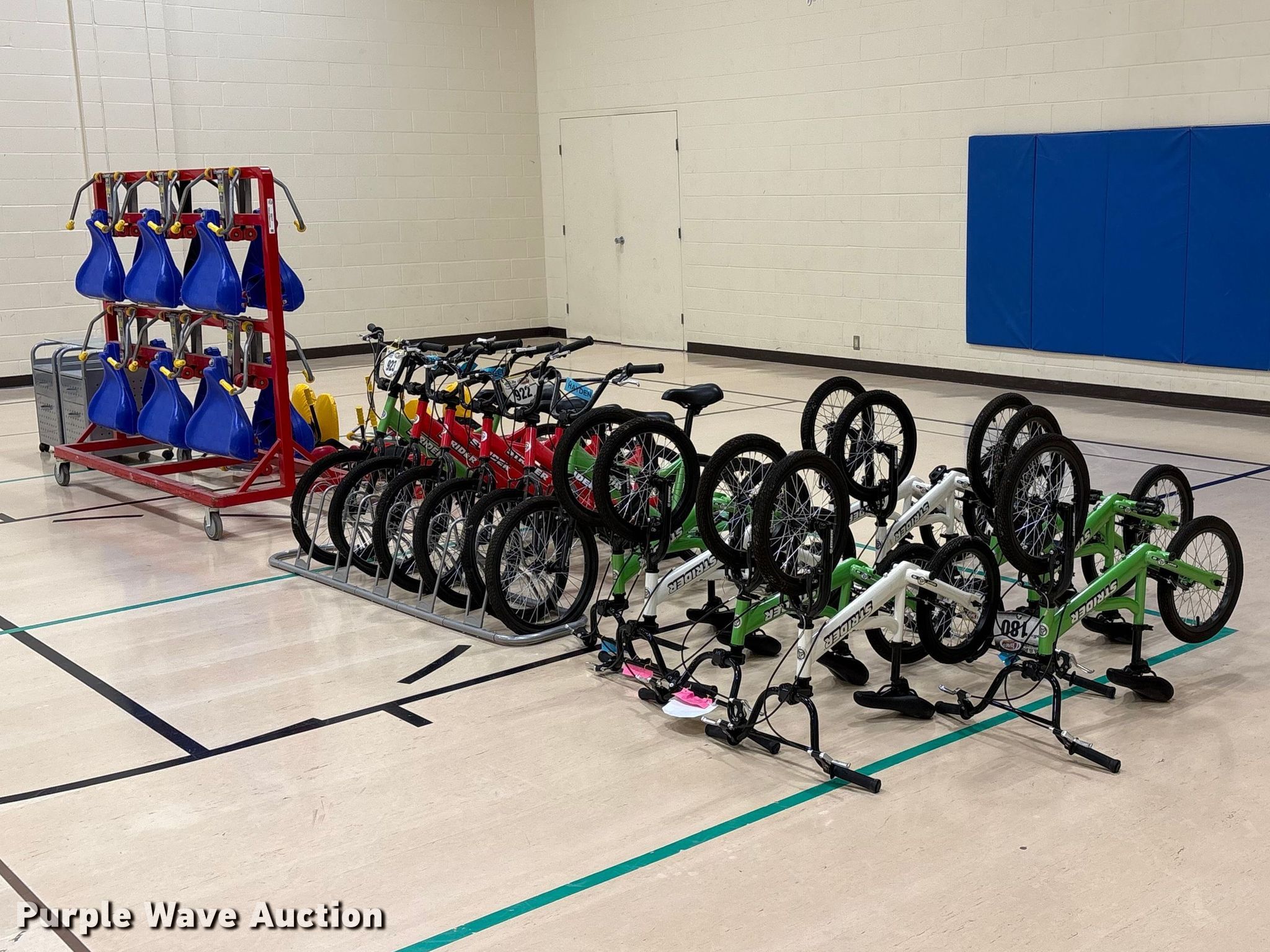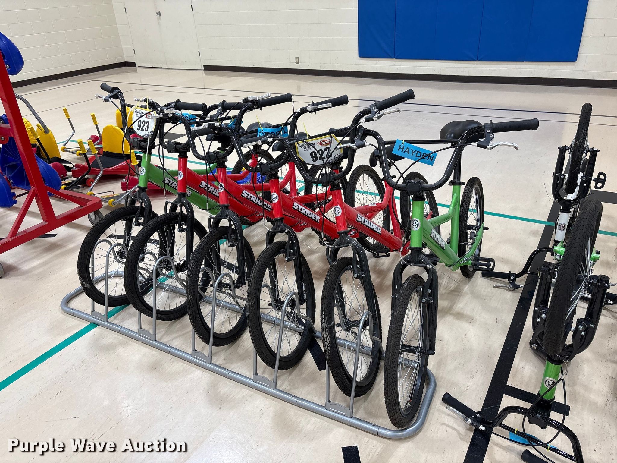 Purple Wave is selling a used Sporting Goods in Nebraska. This item is a Sporting goods with the following: (15) Strider sport balance bicycles, (6) SR-S1 20", (9) SS-S2 16", Bike rack, (18) Roller Racer Institutional scooters, Rack: 78" x 28" x 64", (2) 27" x 18" x 16" glass top rolling cabinets
