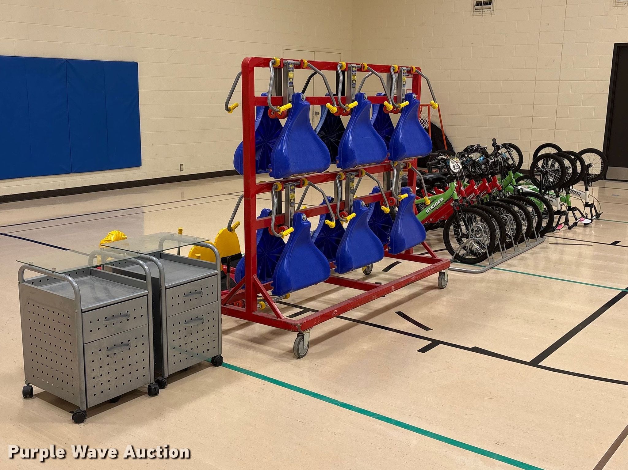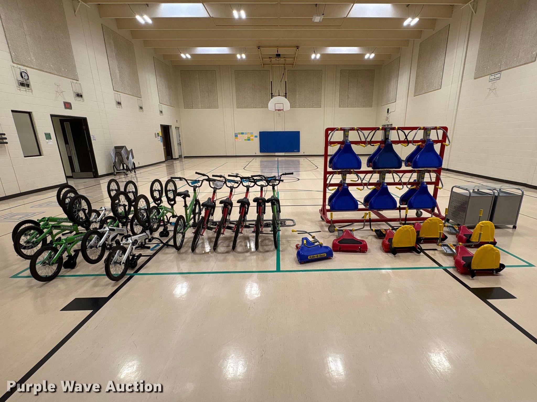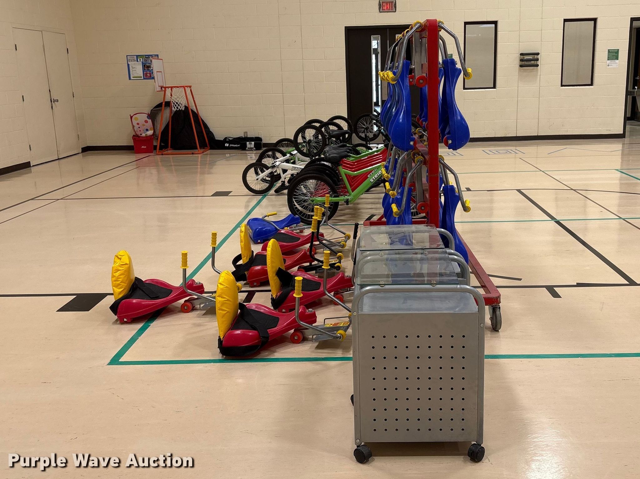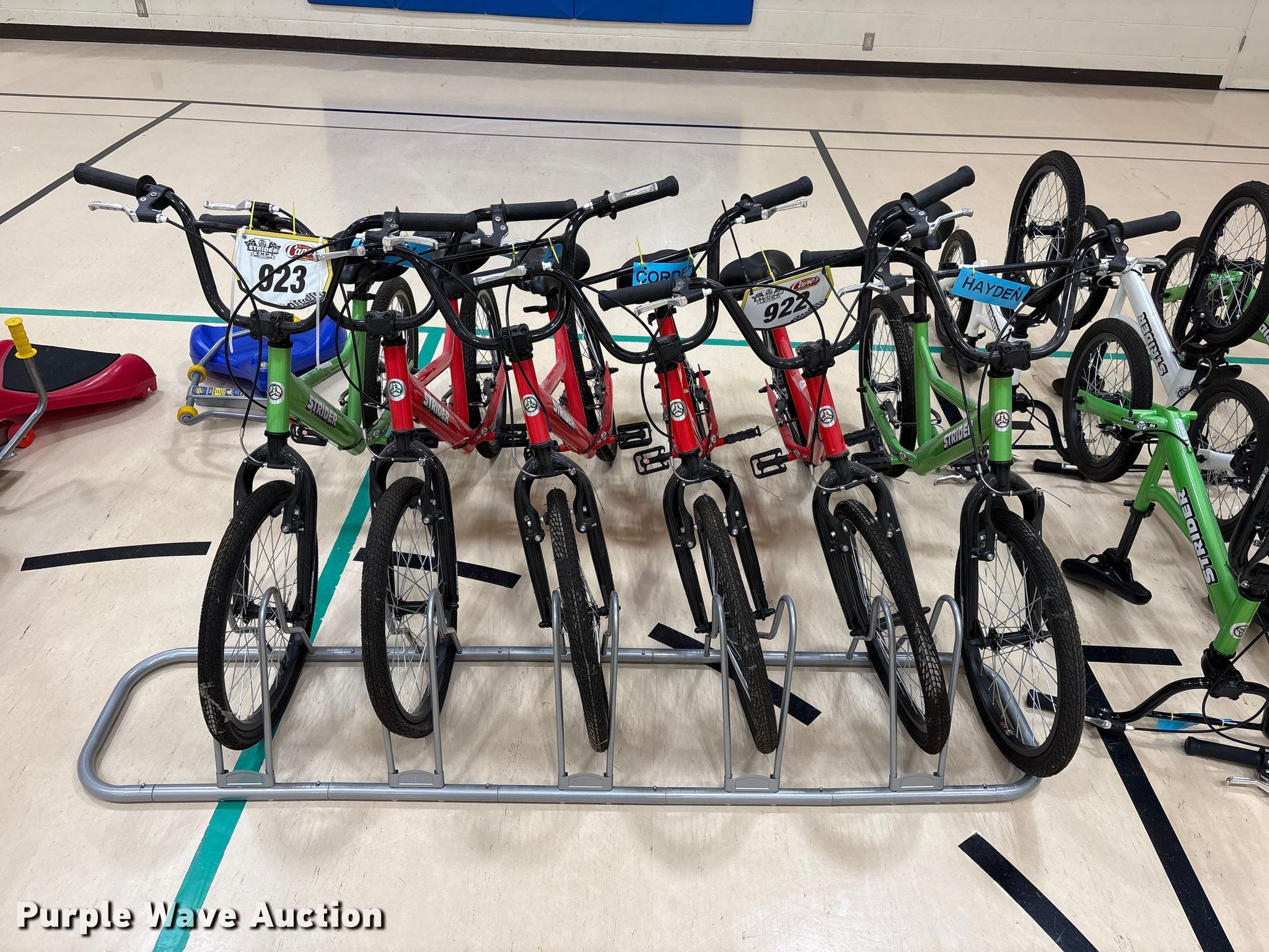 Purple Wave is selling a used Sporting Goods in Nebraska. This item is a Sporting goods with the following: (15) Strider sport balance bicycles, (6) SR-S1 20", (9) SS-S2 16", Bike rack, (18) Roller Racer Institutional scooters, Rack: 78" x 28" x 64", (2) 27" x 18" x 16" glass top rolling cabinets
