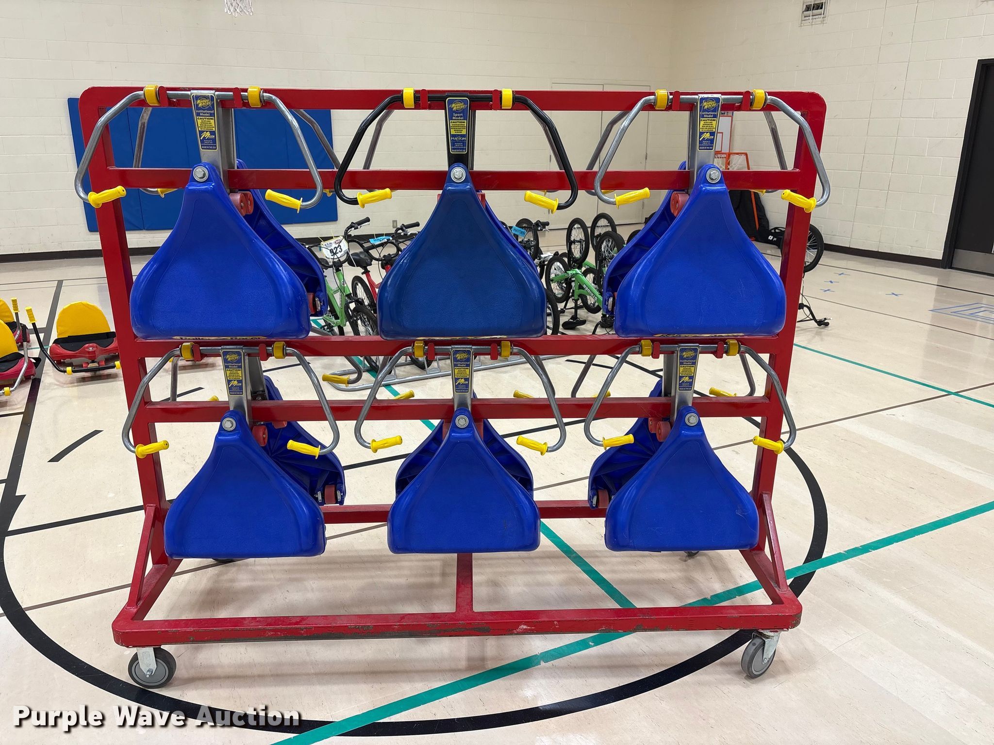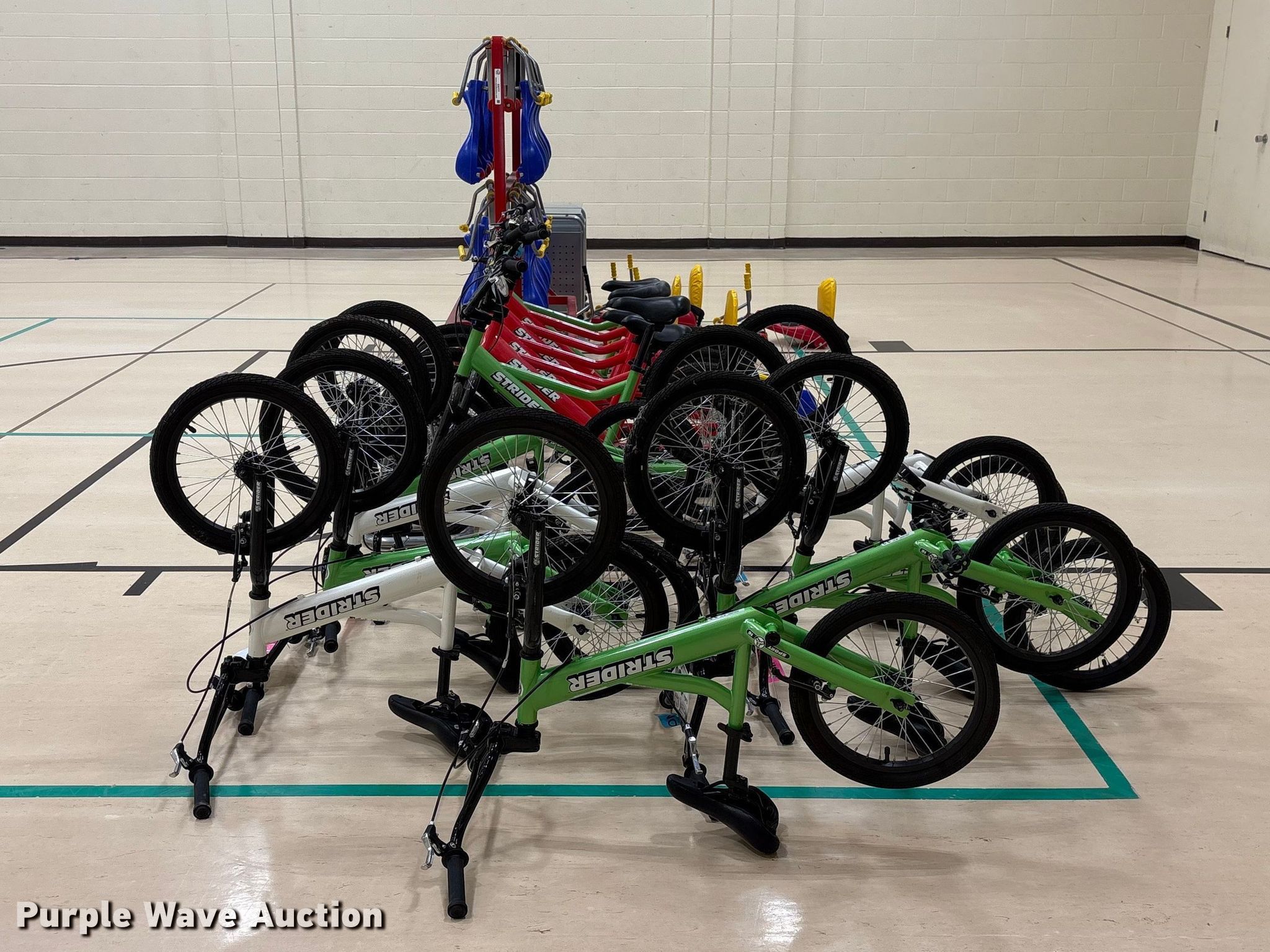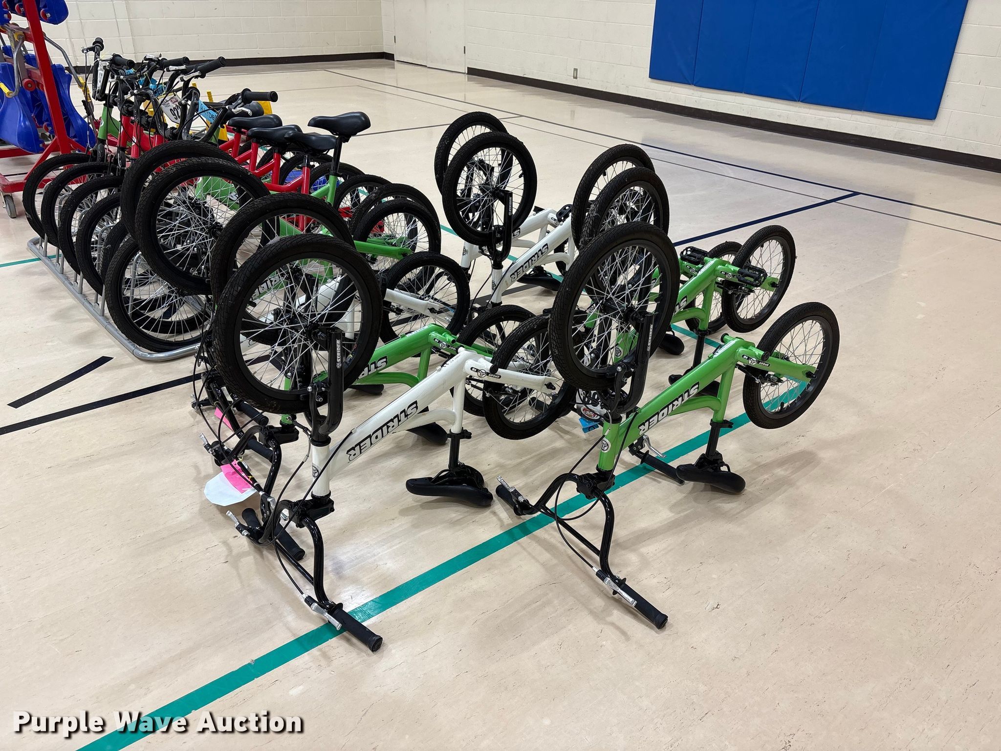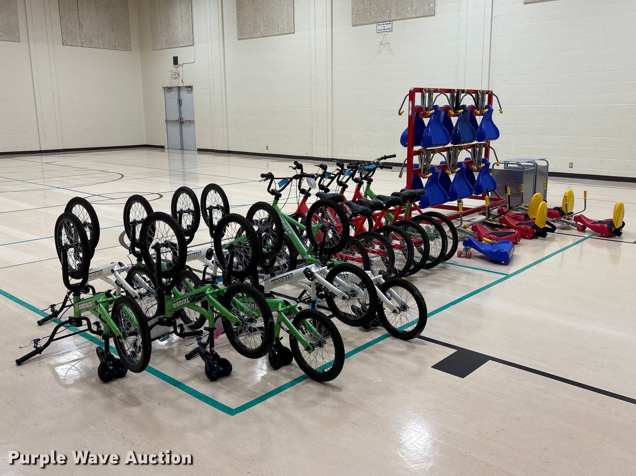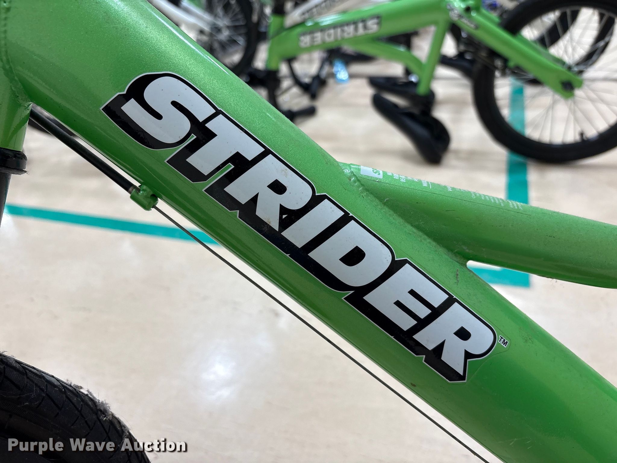 Purple Wave is selling a used Sporting Goods in Nebraska. This item is a Sporting goods with the following: (15) Strider sport balance bicycles, (6) SR-S1 20", (9) SS-S2 16", Bike rack, (18) Roller Racer Institutional scooters, Rack: 78" x 28" x 64", (2) 27" x 18" x 16" glass top rolling cabinets