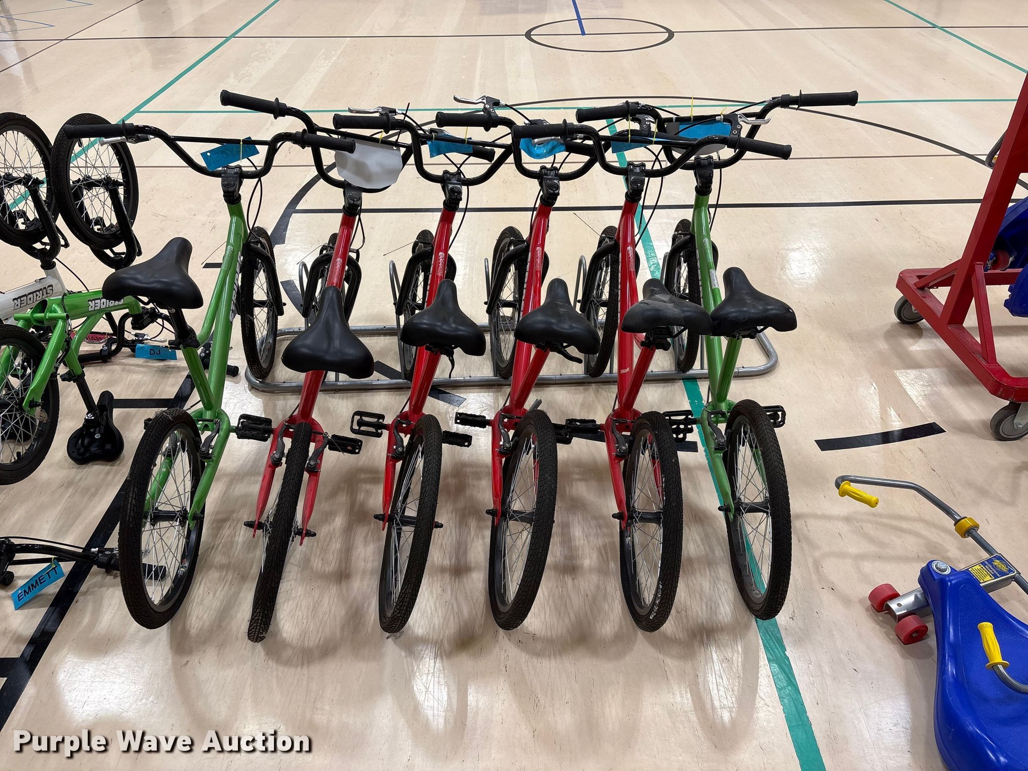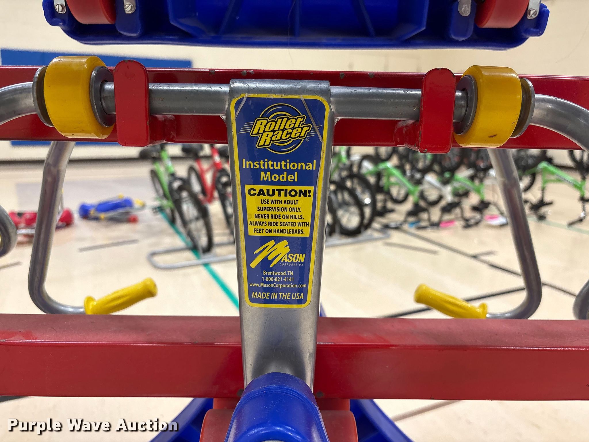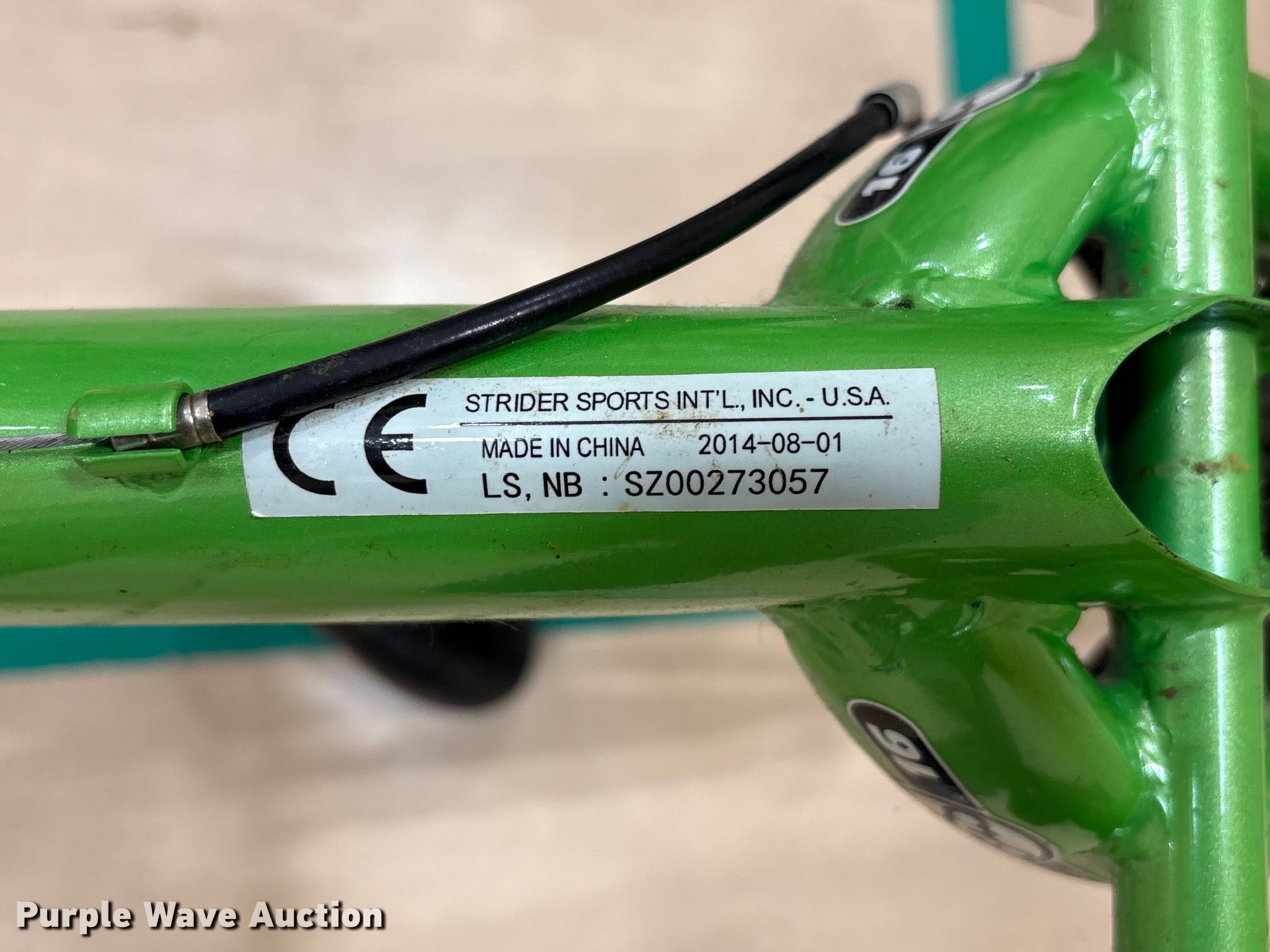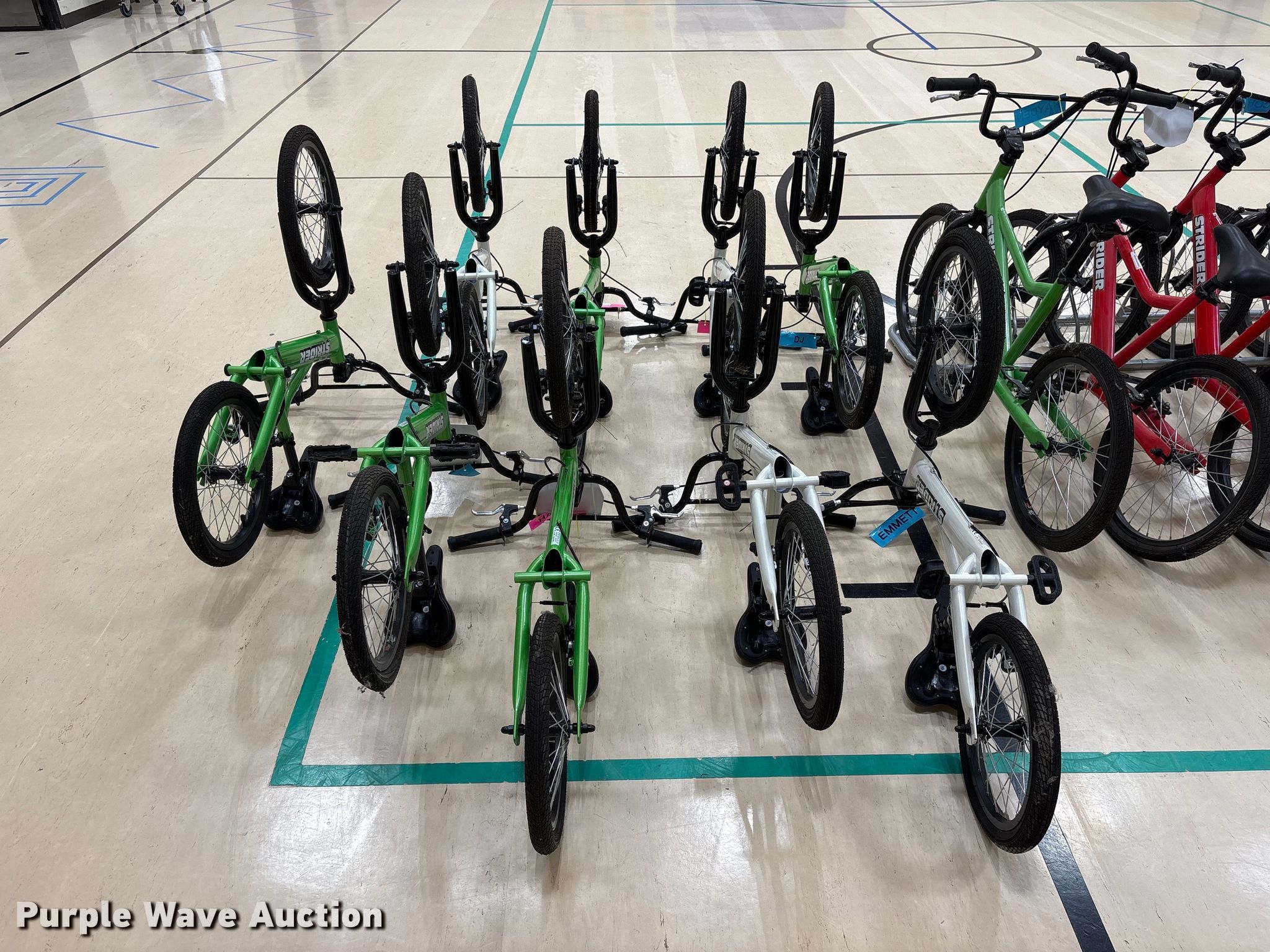 Purple Wave is selling a used Sporting Goods in Nebraska. This item is a Sporting goods with the following: (15) Strider sport balance bicycles, (6) SR-S1 20", (9) SS-S2 16", Bike rack, (18) Roller Racer Institutional scooters, Rack: 78" x 28" x 64", (2) 27" x 18" x 16" glass top rolling cabinets