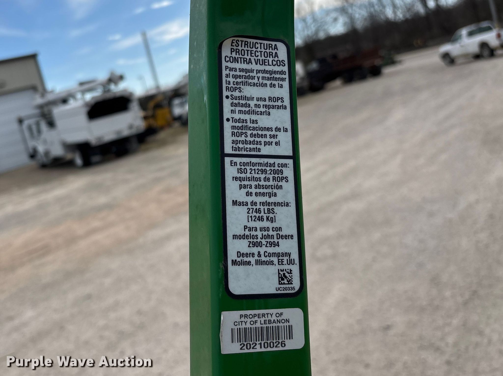 2020 John Deere Z960M ZTR lawn mower. Hours: 653 on meter, Cutting width: 60", Serial: 1TC960MCKLT090152, Unit #: 10026. Engine Kawasaki, Displacement: 999 cc, Cylinders: 2, Fuel type: Gas. Transmission Hydrostatic. Operators station OROPS. Features Mower deck John Deere 7 Iron Pro 60. Tires Front: 13x6.50-6/4.50. Notes Battery issues, needs replaced, Deck pulley issues, throws belts when engaged, OROPS welded in upright position, Dead battery, Jump start required during on-site data collection. Public Works City of Lebanon. Lebanon, MO 65536