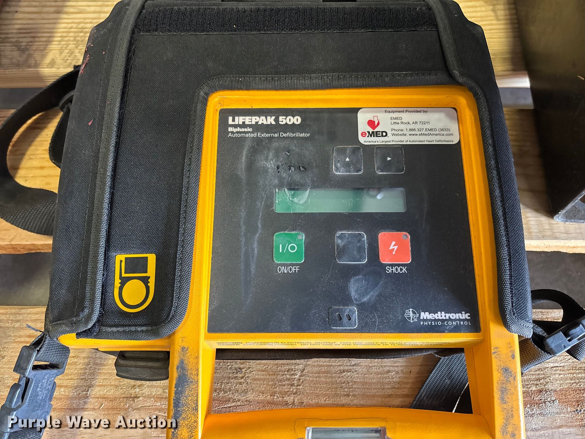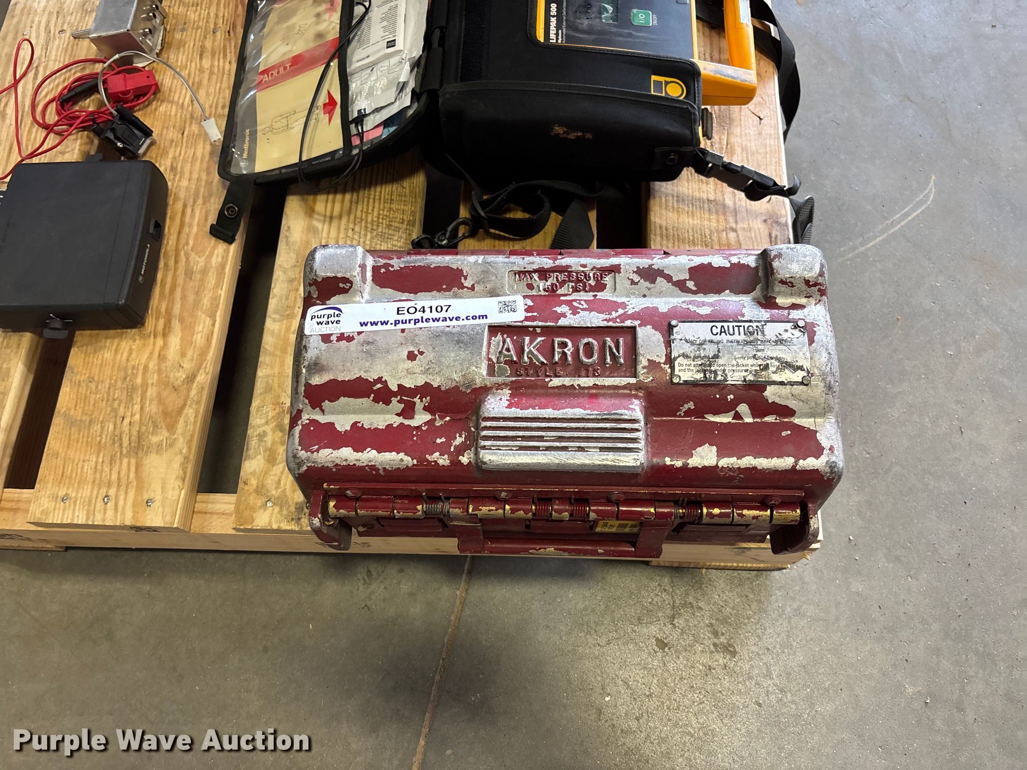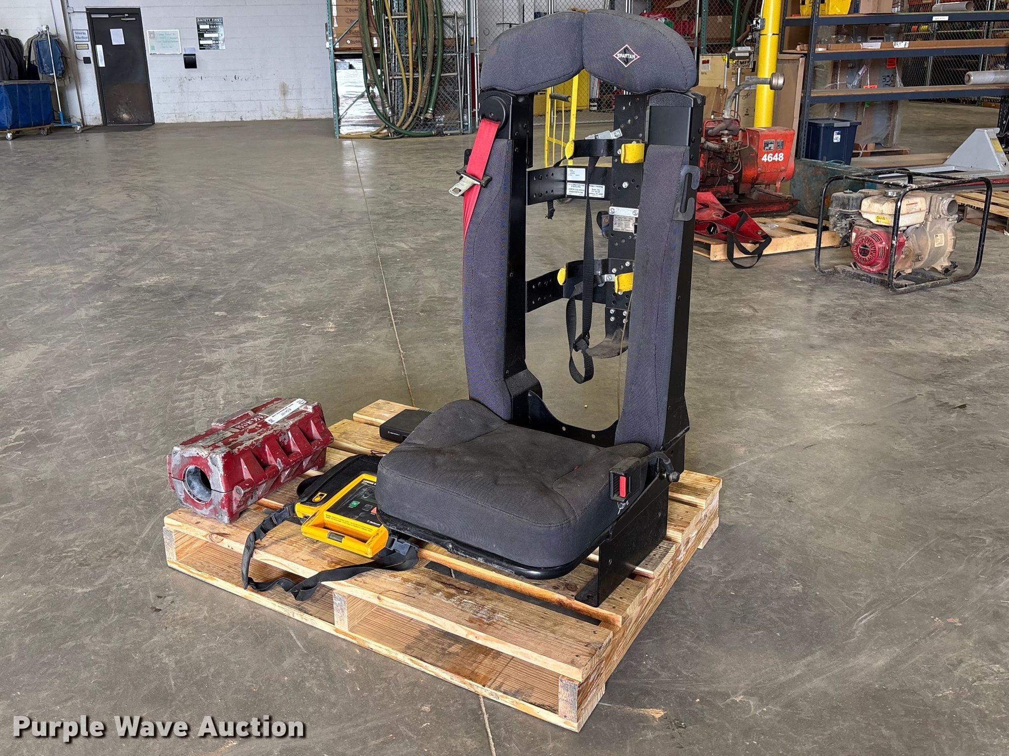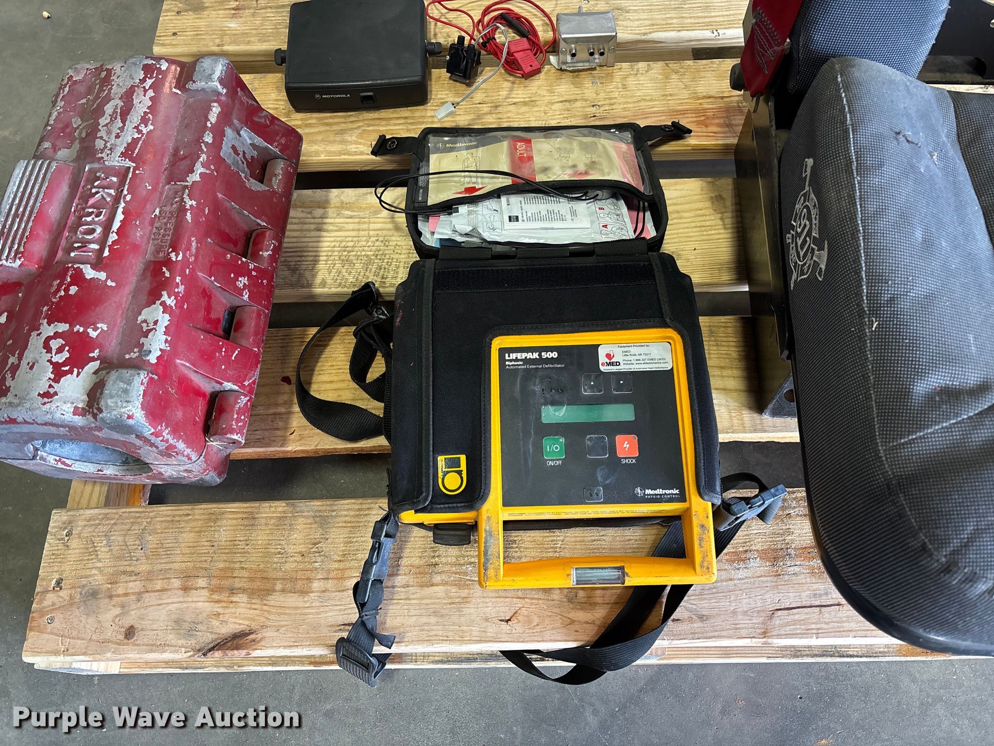 Purple Wave is selling a used Automotive Parts or Acces. in Missouri. This item is a Fire truck parts with the following: 911 fire truck seat, Akron 773 hose jacket, Lifepak 500 defibrillator