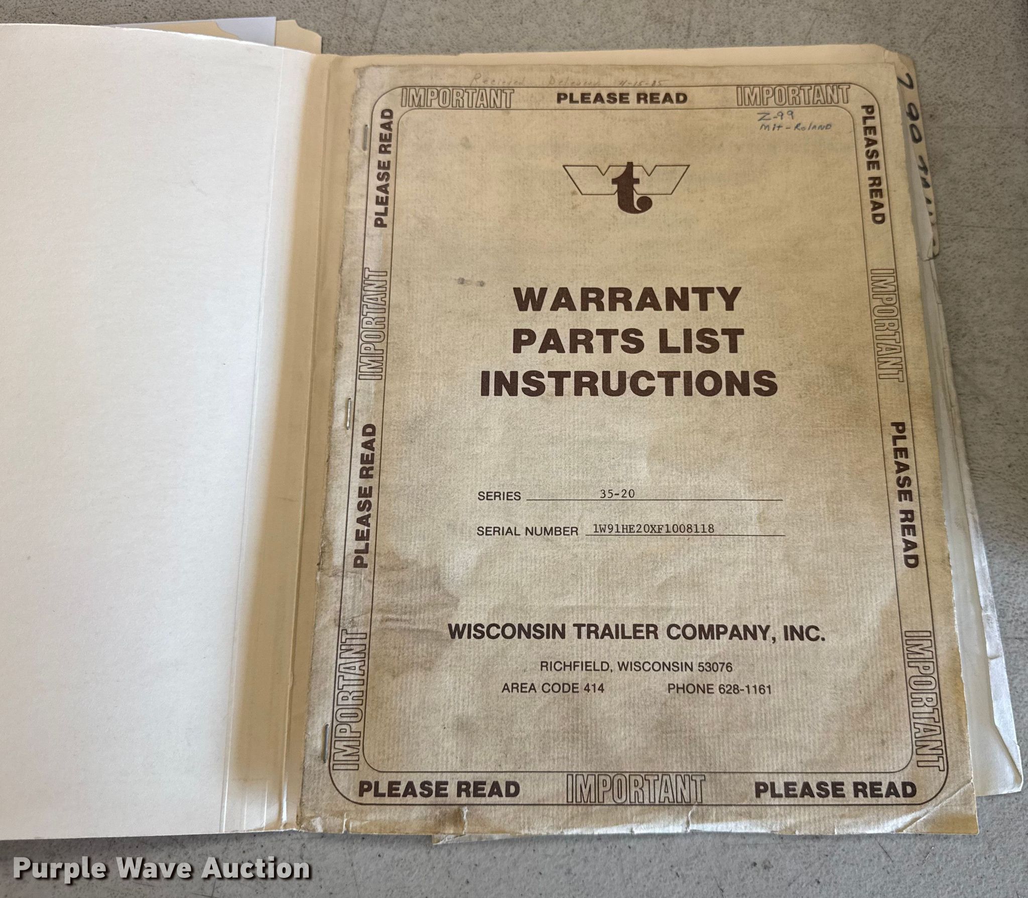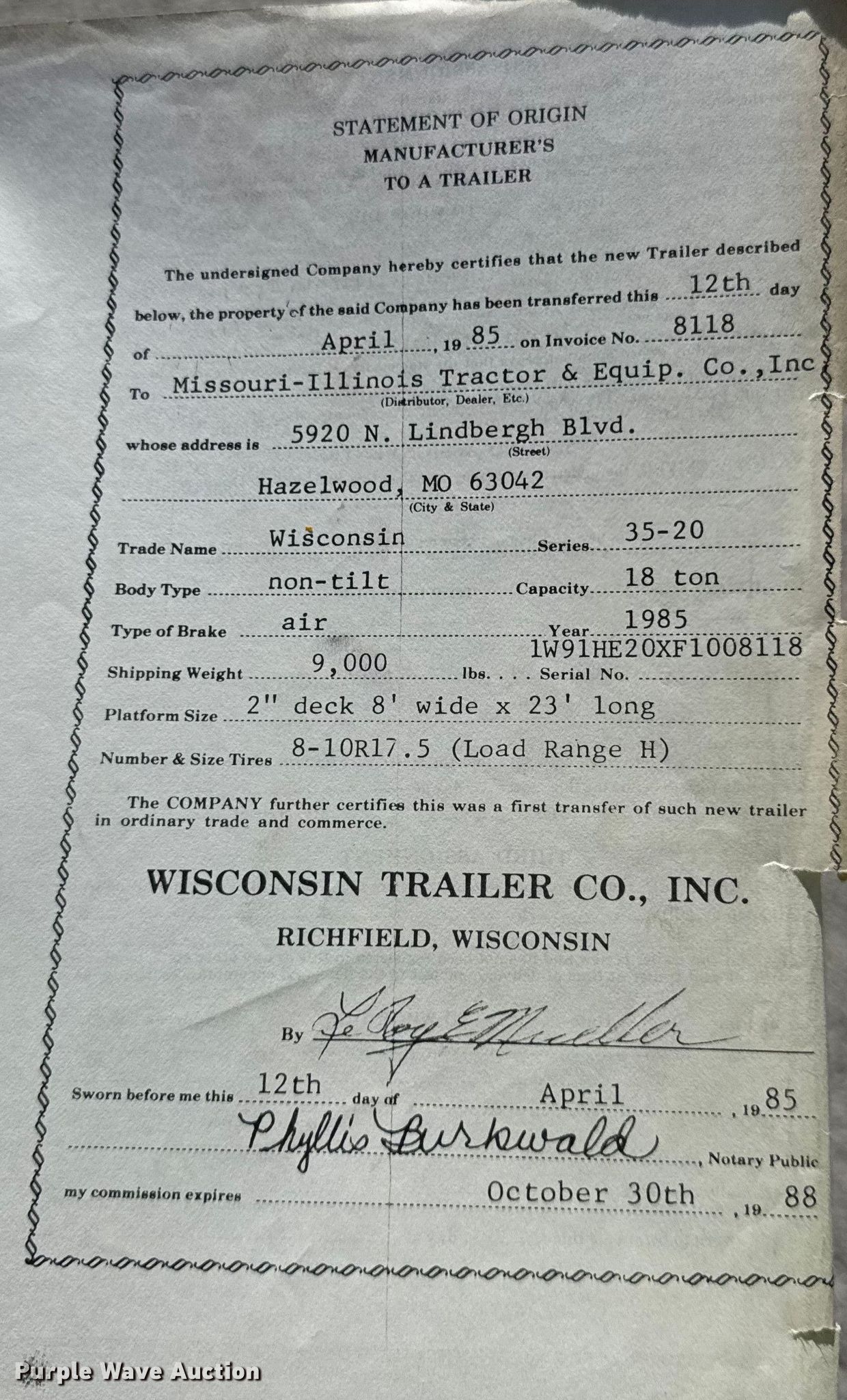 1985 Wisconsin 35-20 equipment trailer. VIN: 1W91HE20XF1008118, Unit still in use. Dimensions Overall Length: 30', Width: 96", Deck Length: 18', Width: 96", Deck height: 36", Tail length: 5', Ramps: Manual Length: 60". Features Deck type: Wood. Chassis Hitch: Pintle, Landing gear: Single, Suspension: Walking beam, Brakes: Air, Axles: Tandem, GVWR: 44,000 lbs, GAWR: 17,992 lbs. Tires Steel wheels, Size: 10R17.5. Notes Spare included. Illinois title. Seller is a government entity who will be assigning and distributing the title. Please contact the seller for distribution questions. Adams County Highway Dept.. Quincy, IL 62305
