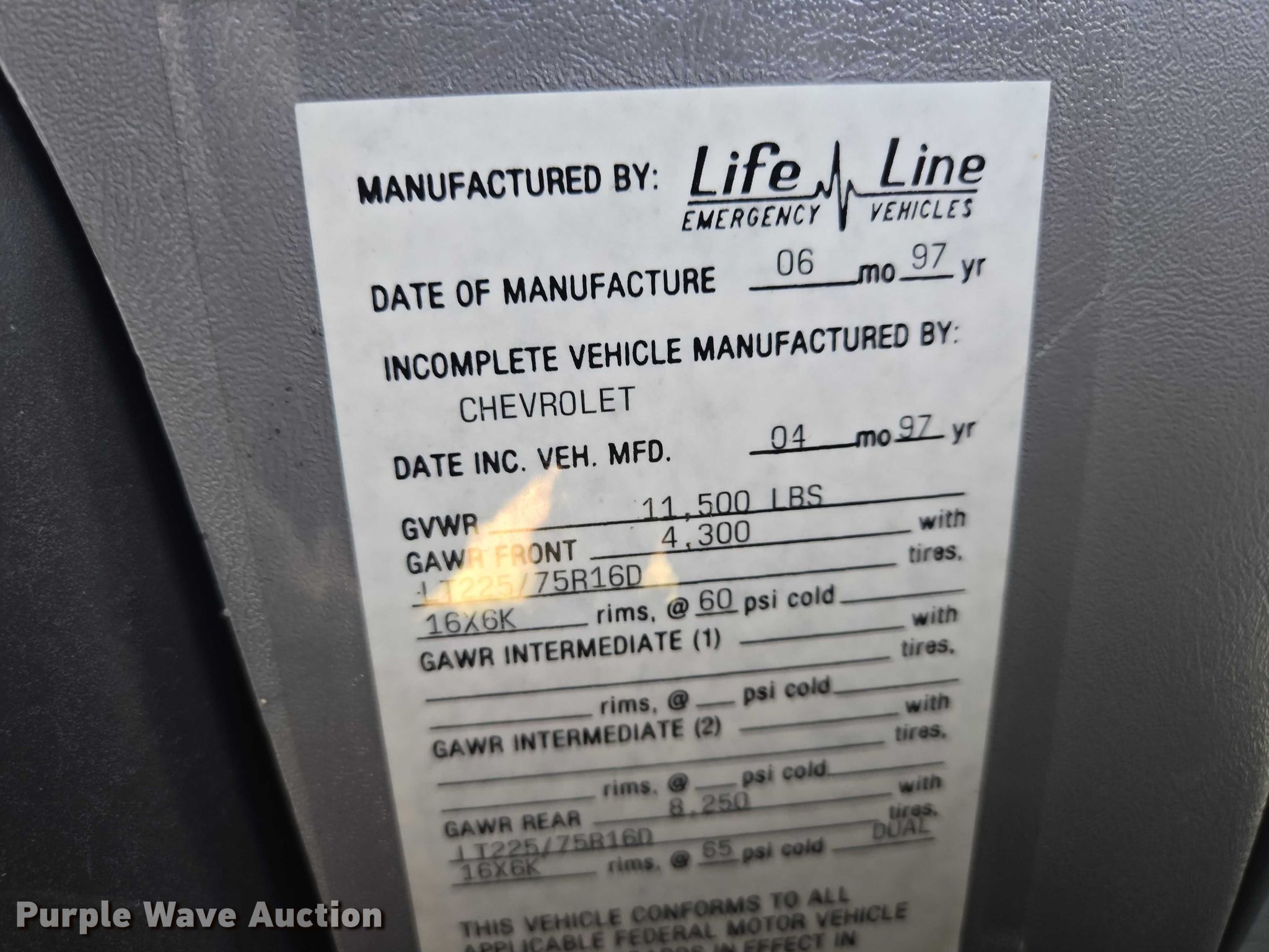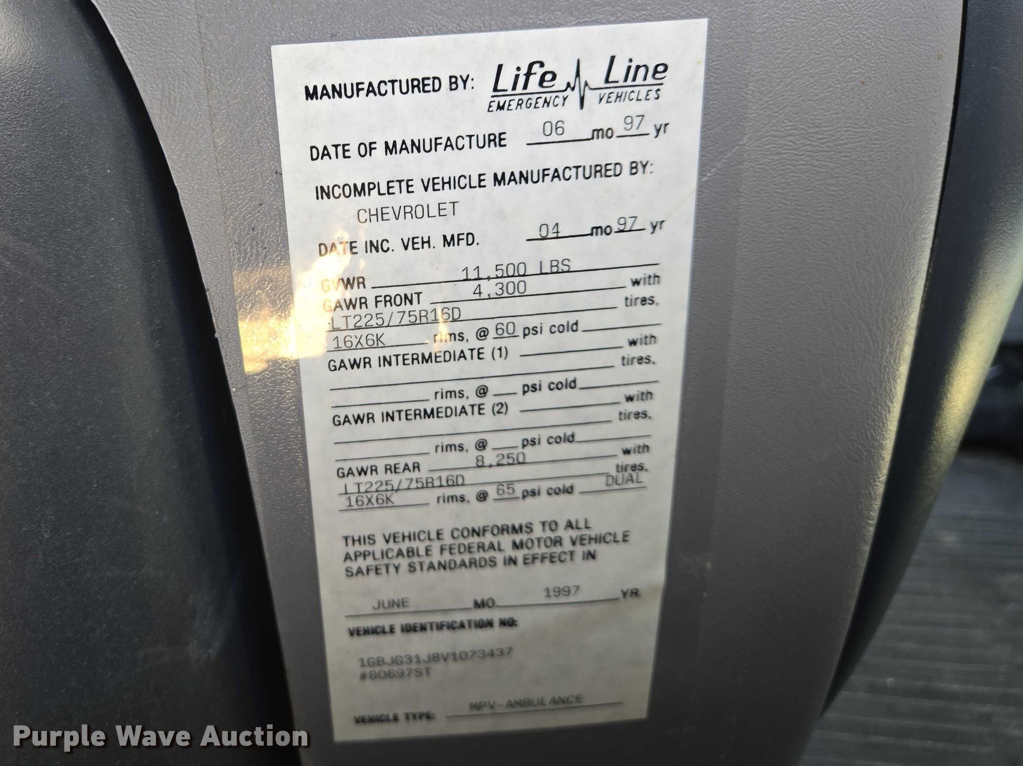 1997 Chevrolet Lifeline Express 3500 ambulance. Miles: 52,881 on odometer, VIN: 1GBJG31J8V1073437. Engine Displacement: 7.4L, Cylinders: 8, Fuel type: Gas. Transmission Automatic. Chassis Axles: Single, Suspension: Spring, Brakes: Hydraulic. Interior AC, Heat, Power windows, Power locks, Cruise control. Features Ambulance body Life Line, PA/ siren controls. Tires Size: 225/75R16. Notes Windshield chipped or cracked. South Dakota title. Title distribution may be delayed up to 14 days from verification of funds. Tripp County, SD. Winner, SD 57580