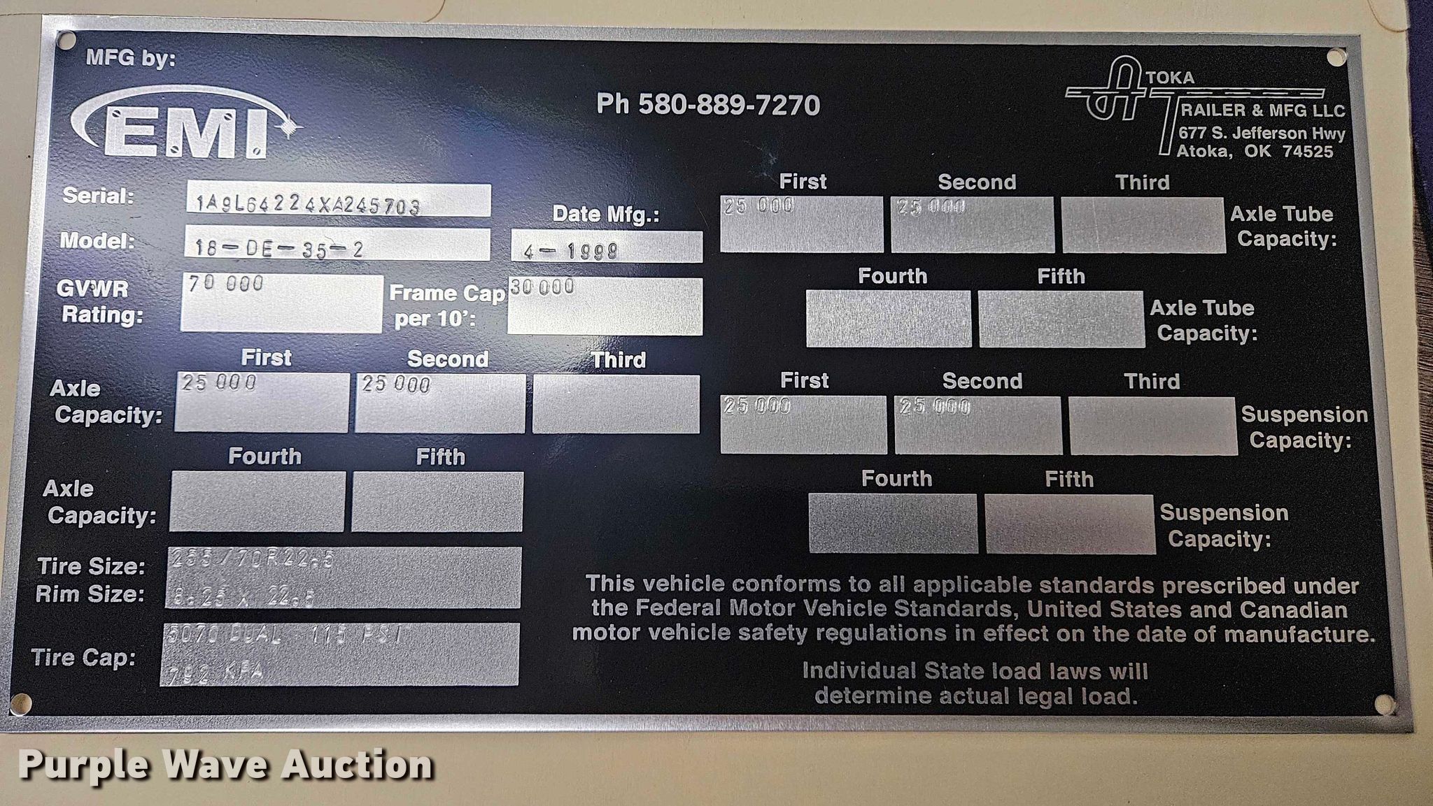 1999 Atoka Trailer Mfg. 18-DE-35-2 drop deck equipment trailer. Dimensions. Overall Length: 43' 9", Width: 8' 6", Deck Length: 28', Width: 8' 6", Top deck length: 8', Tail length: 4' 4", Ramps: Manual Length: 4'. Features Deck type: Wood. Chassis Landing gear: Dual, Suspension: Spring, Brakes: Air, Axles: Tandem, GVWR: 70,000 lbs, GAWR: 25,000 lbs. Tires Steel wheels, Size: 255/70R22.5. Notes Deck boards damaged. Oklahoma title. Title distribution may be delayed up to 30 days from verification of funds. Grady County, OK. 3900 South 4th Street. Chickasha, OK 73018