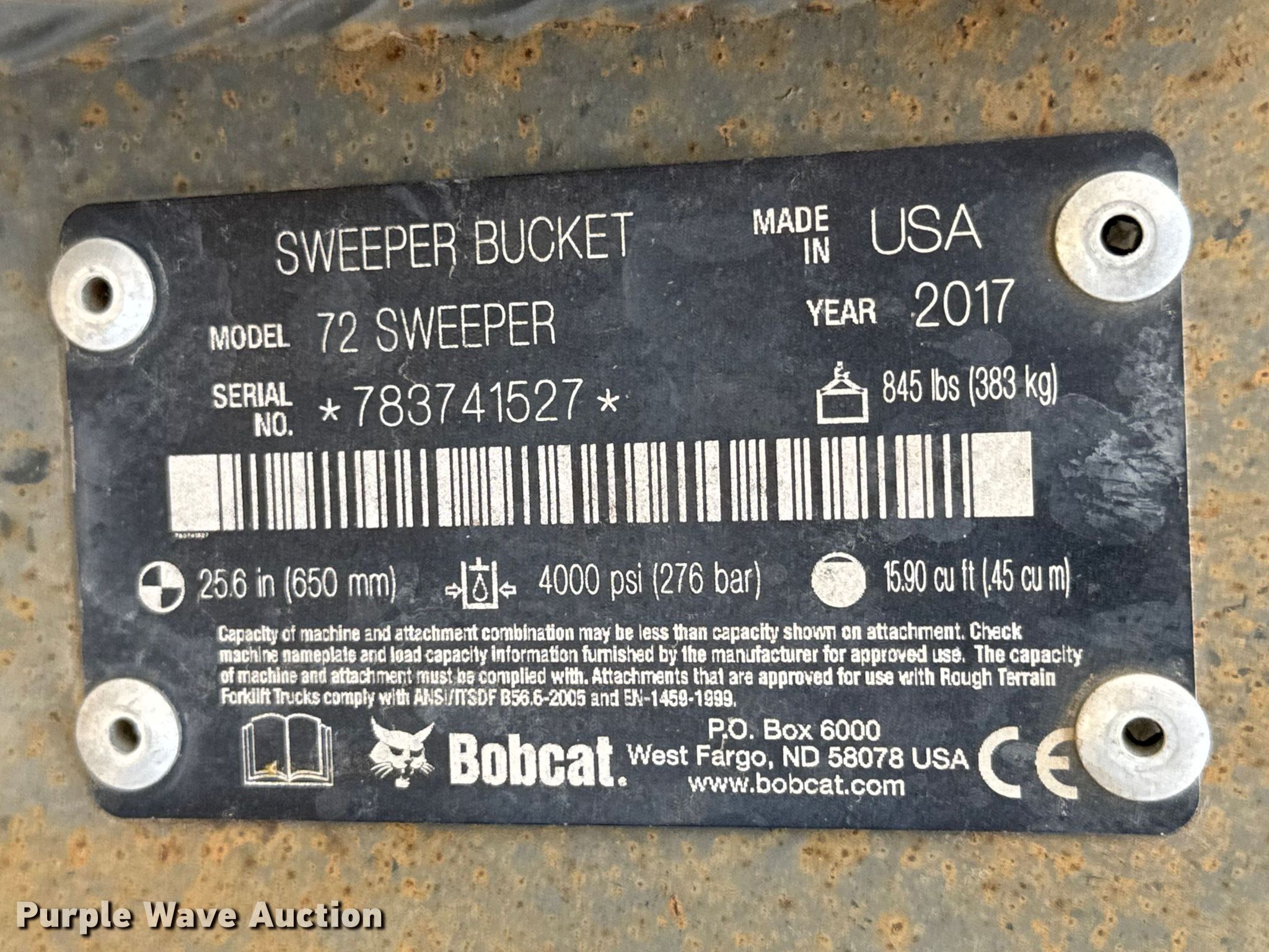 Purple Wave is selling a used Skid Steer Attach. in Kansas. This item is a 2017 Bobcat 72 Sweeper skid steer sweeper with the following: Serial: 783741527, Width: 72"