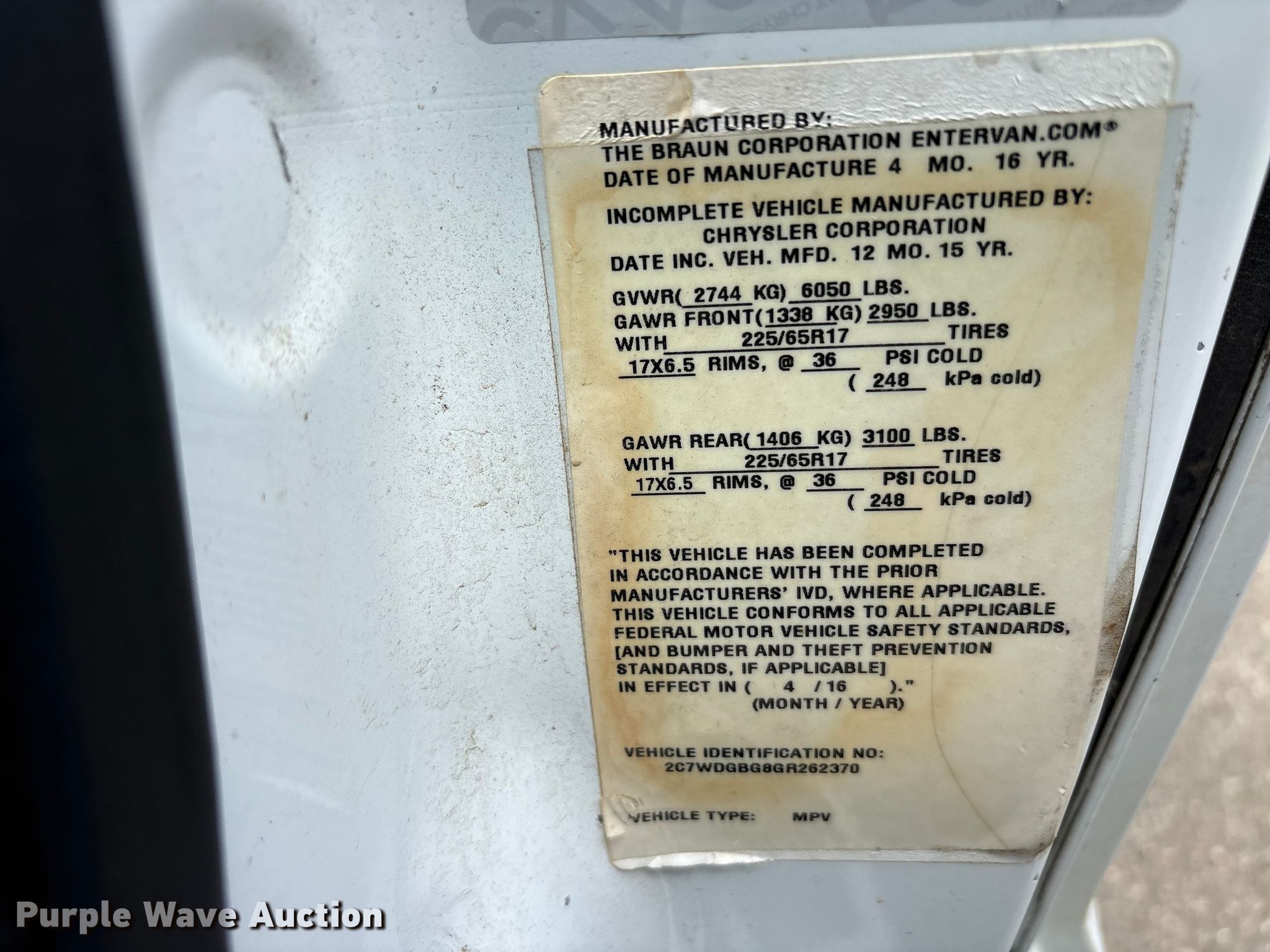 Purple Wave is selling a used Passenger Vehicle in Oklahoma. This item is a 2016 Dodge Grand Caravan handicap accessible van with the following: Miles: 126,957 on odometer, VIN: 2C7WDGBG8GR262370, Unit #: 16522