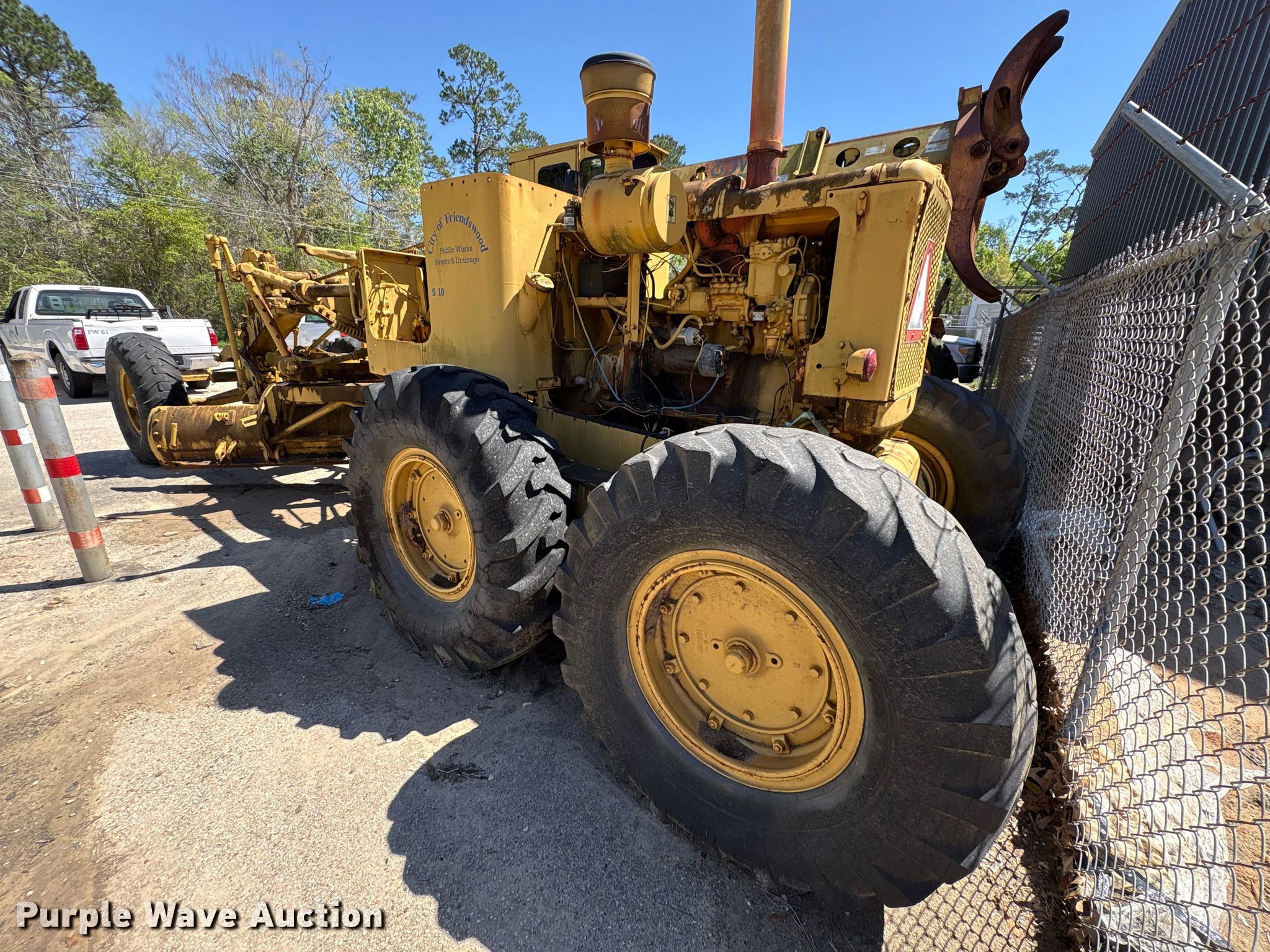 1964 Caterpillar 112F rigid frame motor grader. Serial: 82F692. Engine Cylinders: 4, Fuel type: Diesel. Transmission Direct-drive. Operators station Hydraulic control valves: 6. Features Moldboard: Side shift, Moldboard total width: 12', Scarifier Scarifier type: Mid-mounted Teeth: 9.. Tires Size: 14.00-24. Notes Jump start required during on-site data collection, Unknown operating condition. City of Friendswood. Friendswood, TX 77546