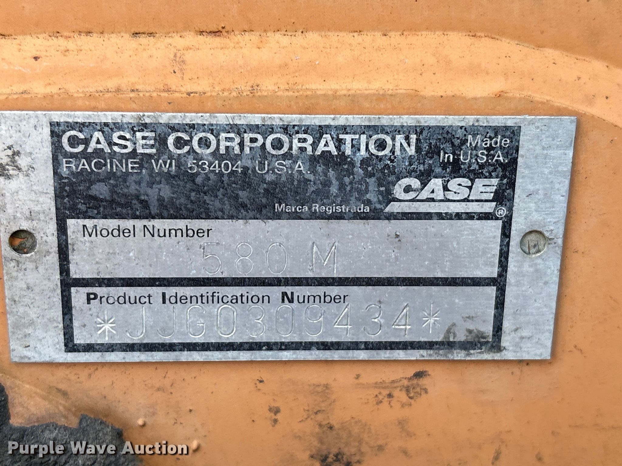2002 Case 580M backhoe. Hours: 7,369 on meter, Serial: JJG0309434. Engine Cylinders: 4, Fuel type: Diesel. Transmission Shuttle shift, 4F - 4R. Operators station Enclosed cab, AC, Heat, Backhoe controls: Four stick. Features Loader Width: 82", Cutting edge: Bolt-on, Backhoe Thumb: Manual, Bucket Width: 24", Teeth: 5.. Tires Front: 11L-16. Notes Jump start required during on-site data collection, Hydraulic issues Stick cylinder leaks, Left outrigger leaks. City of Friendswood. Friendswood, TX 77546