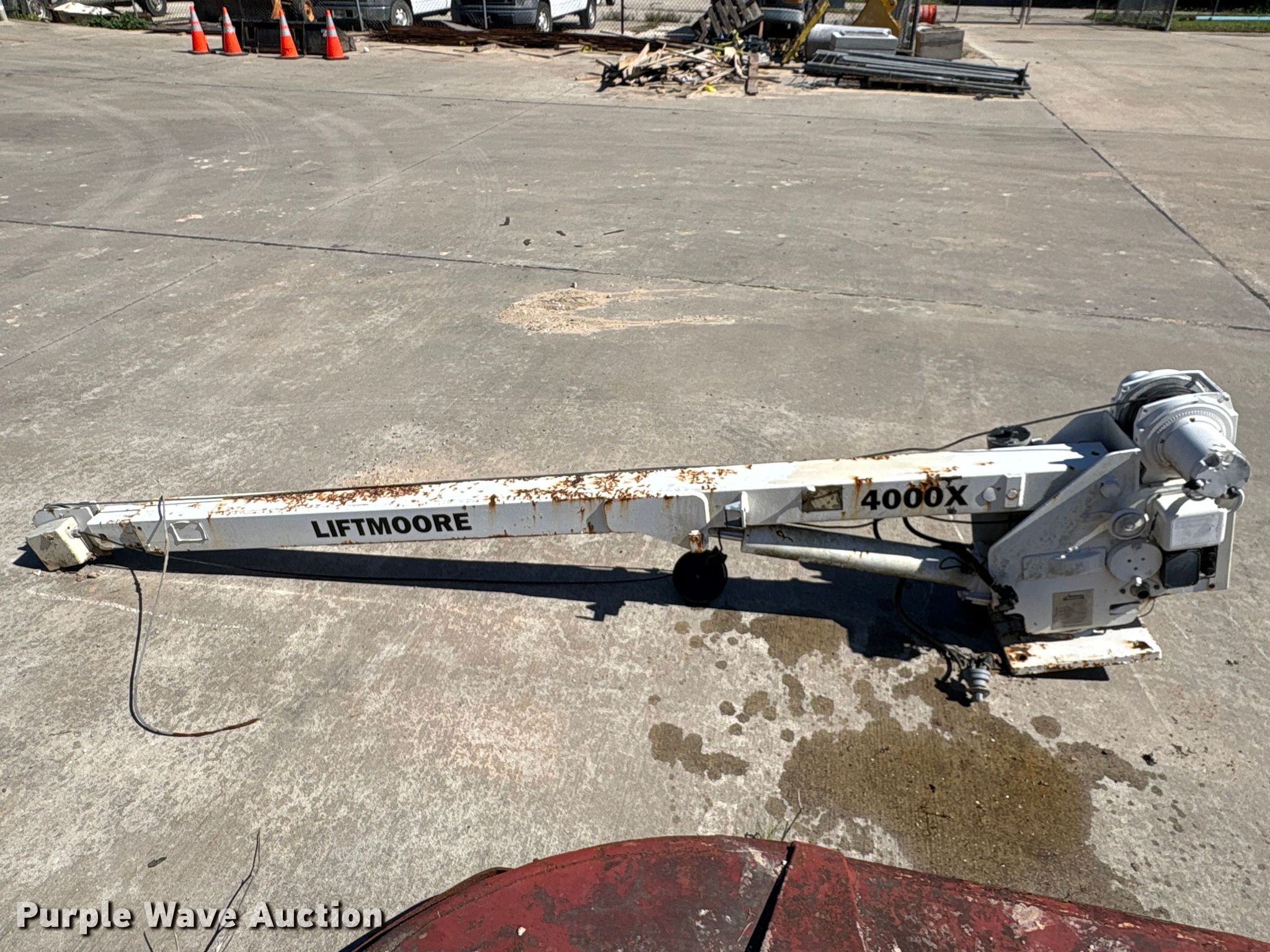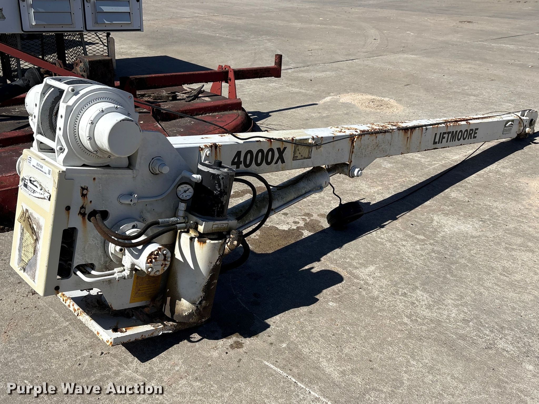 Liftmoore 4000X truck mounted crane. Serial: 15-1201W160. Features Telescopic, Sections: 2. Notes Unknown operating condition. City of Friendswood. Friendswood, TX 77546