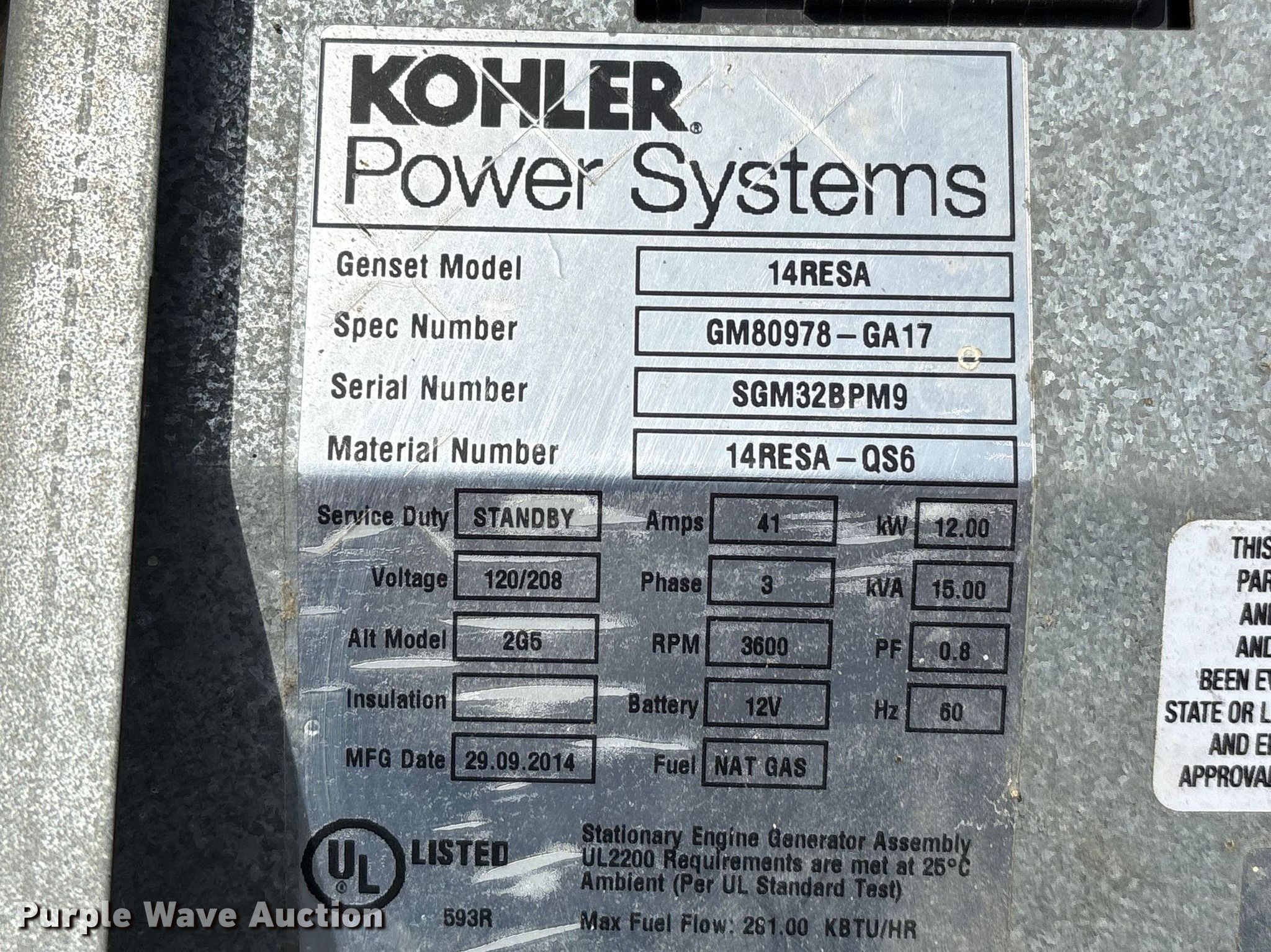 2014 Kohler 14RESA generator. Serial: SGM32BPM9. Engine Kohler CH740EP, Displacement: 725 cc, Cylinders: 2, Fuel type: LPG. Features Generator kVA: 15, kW: 12, Volts: 120/208, Phase: Three, Electric start. Lower Neches Valley River Authority / LNVA. Beaumont, TX 77708