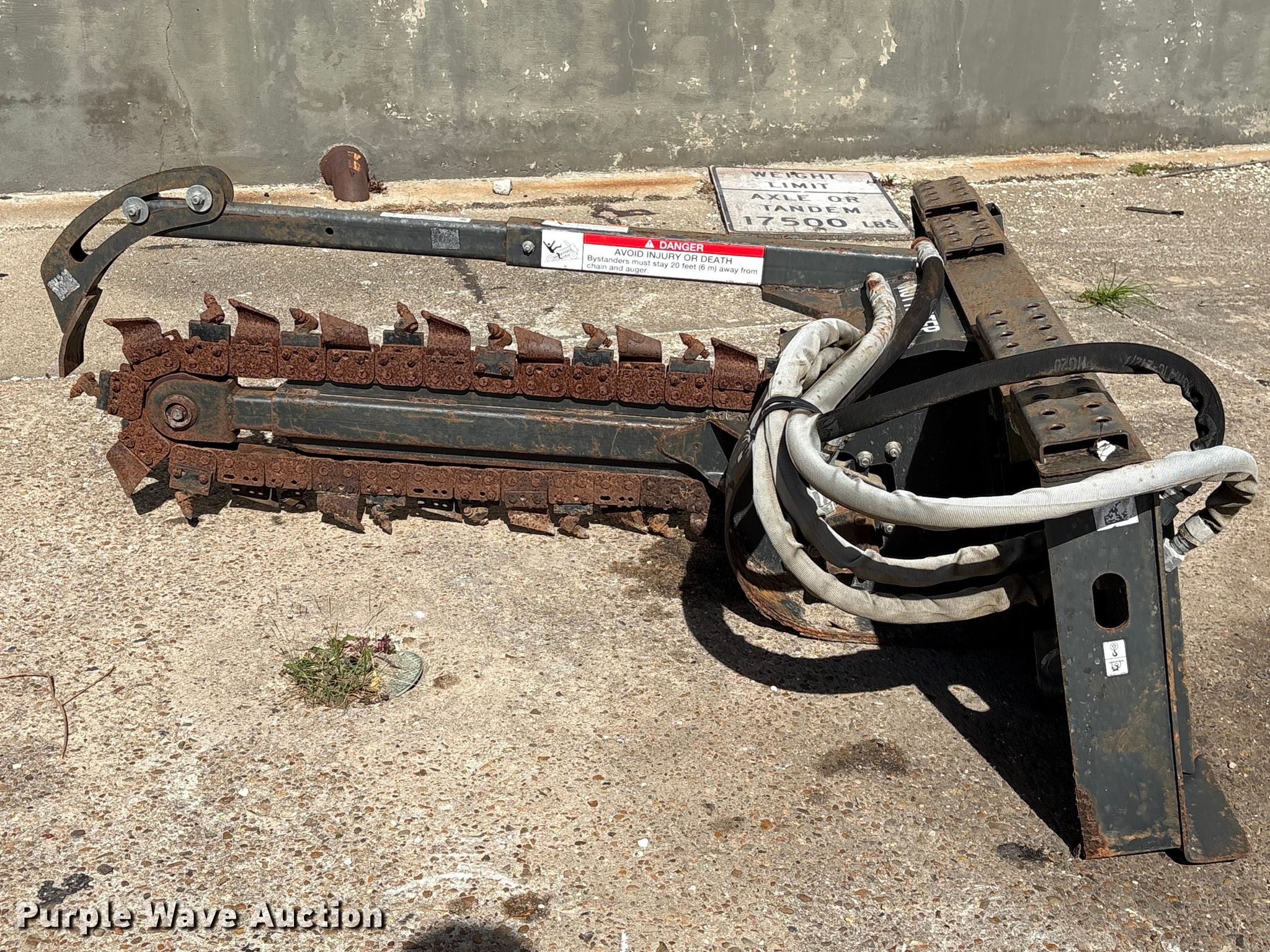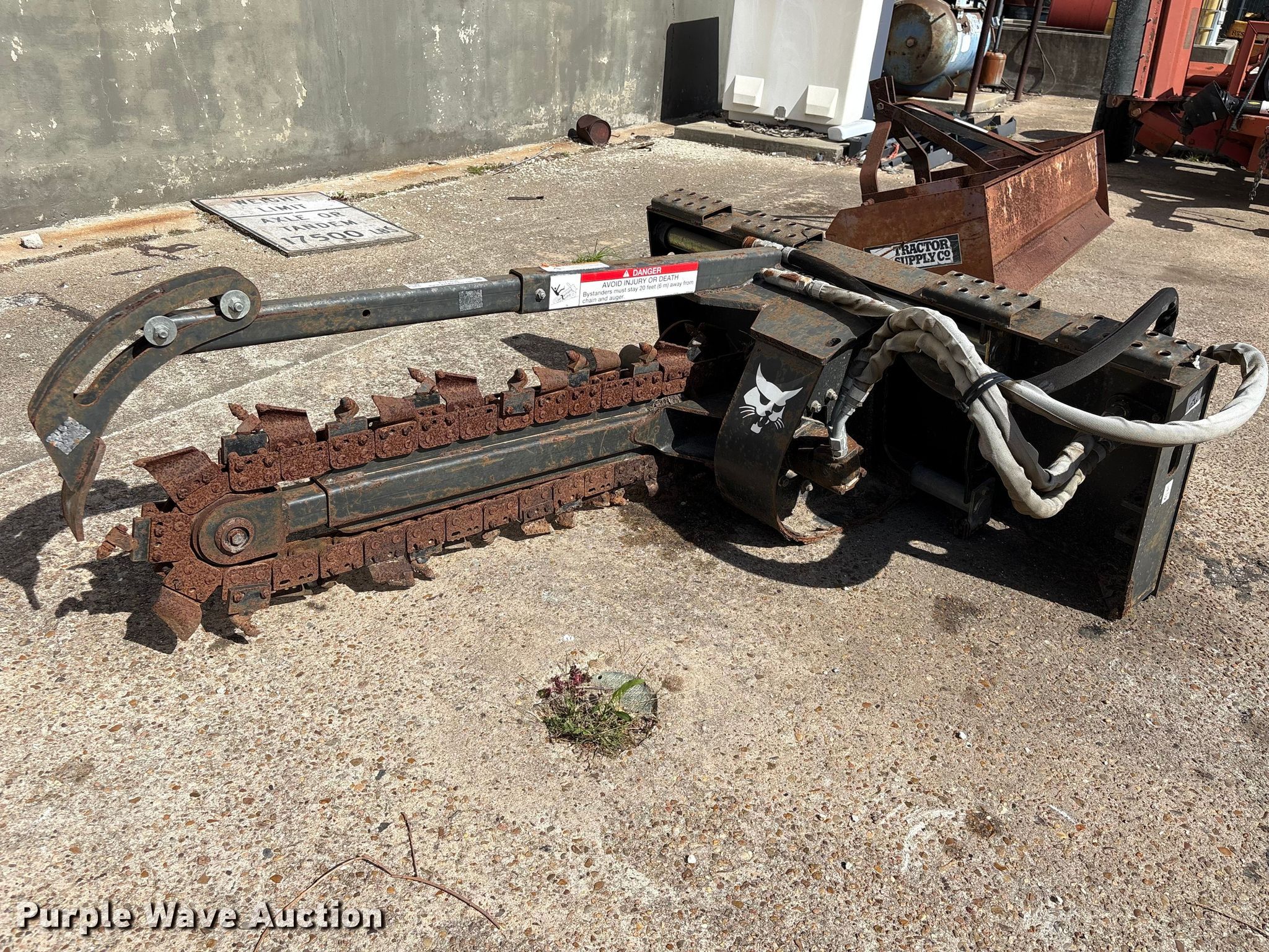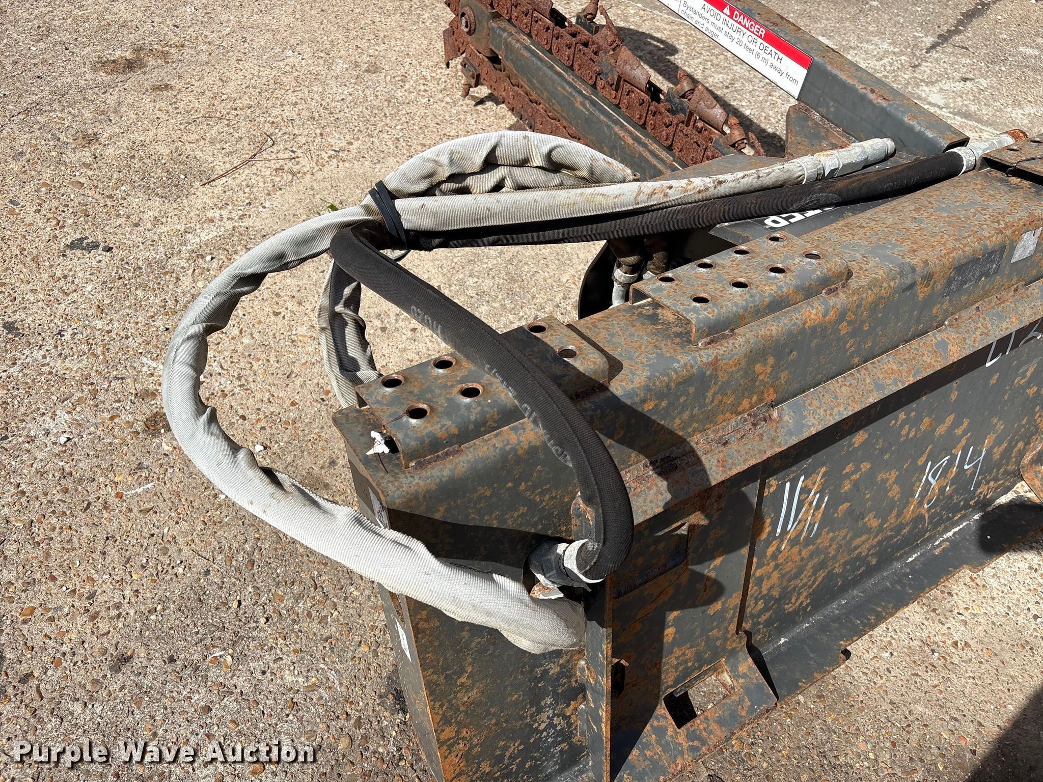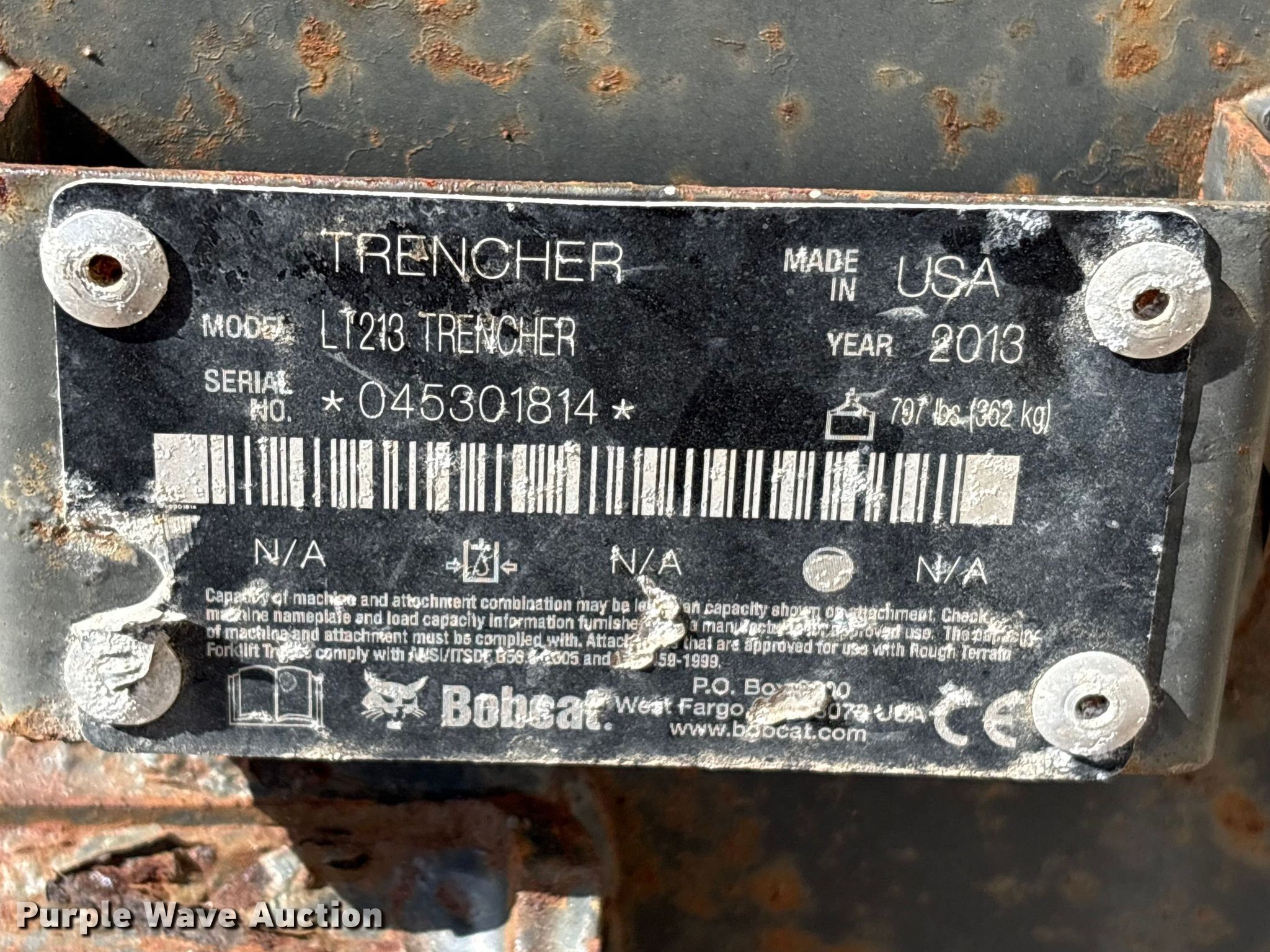 Purple Wave is selling a used Skid Steer Attach. in Texas. This item is a 2013 Bobcat LT213 skid steer trencher with the following: Serial: 045301814, Teeth: Bolt-on, Estimated dig depth: 48", Cutting width: 5", Teeth: Dirt, Manual crumber