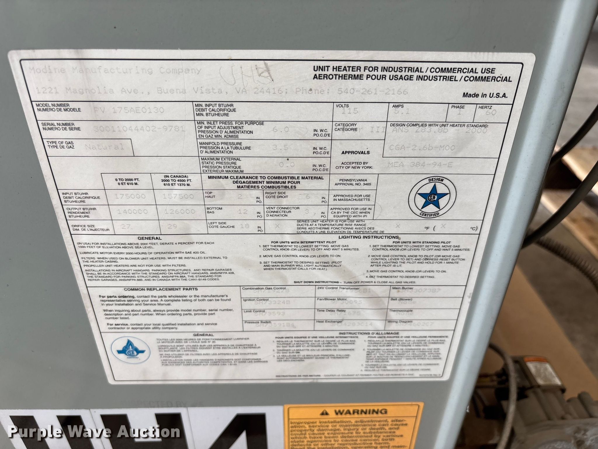 (2) Modine PV 175AE0130 heaters. Unit #: UH4 and UH5. Features Fuel type: Natural gas, Phase: Single, Volts: 115. Topeka, KS 66603