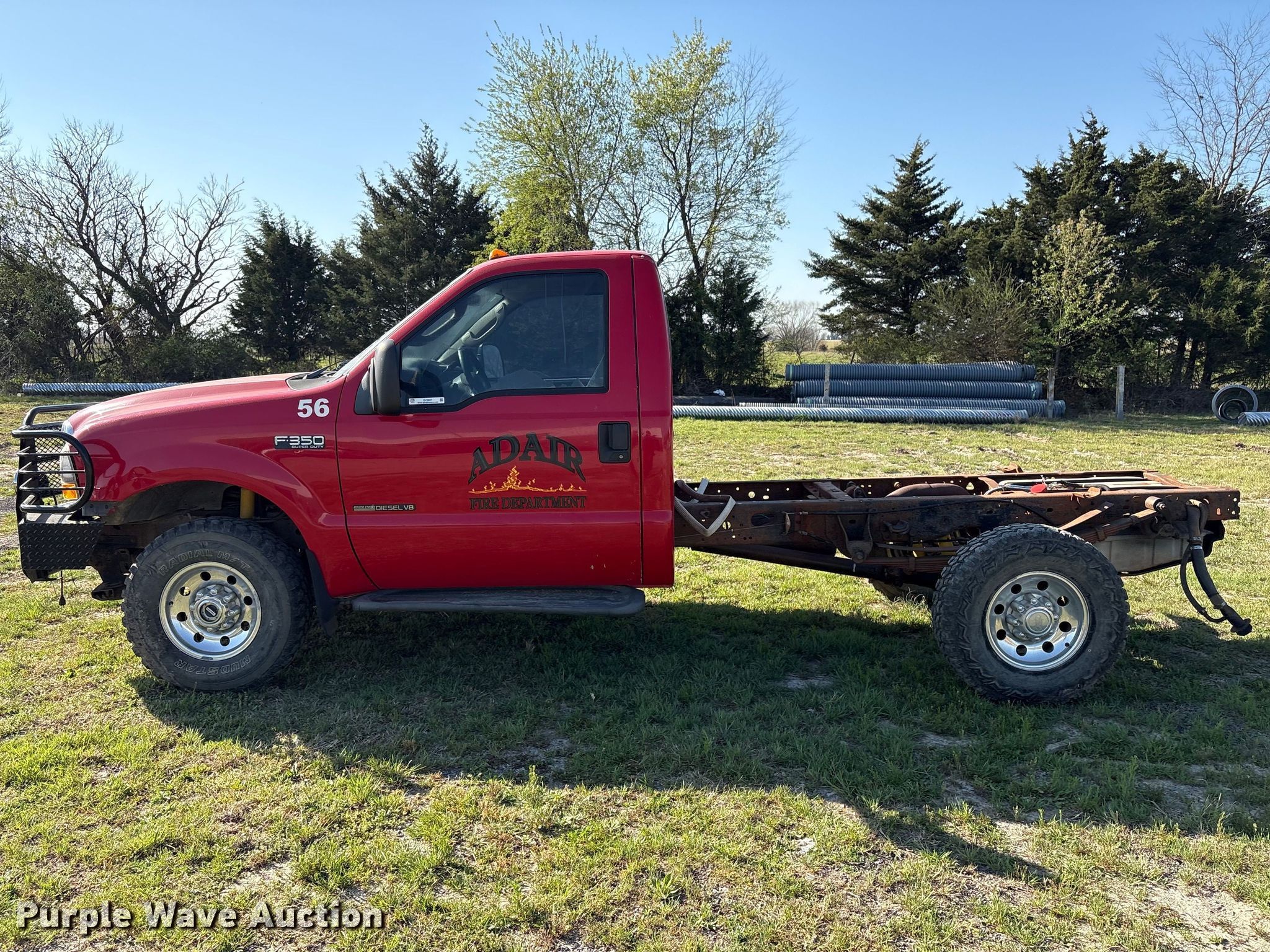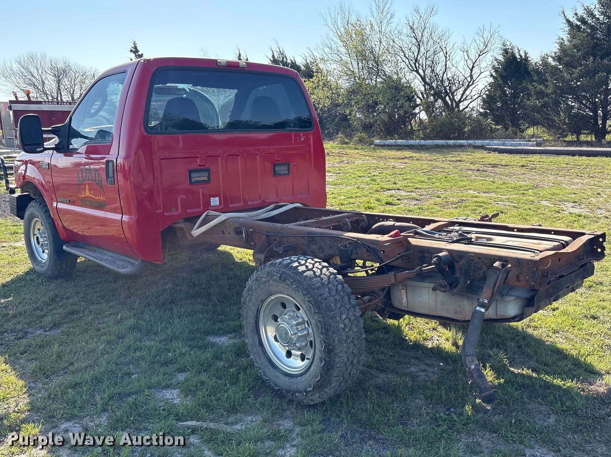 2003 Ford F350 Super Duty pickup truck cab and chassis. Miles: 145,556 on odometer, VIN: 1FDSF35F63EA40558. Engine Displacement: 7.3L, Cylinders: 8, Fuel type: Diesel. Transmission Automatic, Four wheel drive. Interior AC, Heat, Power windows, Power locks, Cruise control. Tires Size: LT265/75R16. Notes Dash warning indicator: ABS, Jump start required during on-site data collection. Oklahoma title. Title distribution may be delayed up to 14 days from verification of funds. Adair Fire Department. Adair, OK 74330