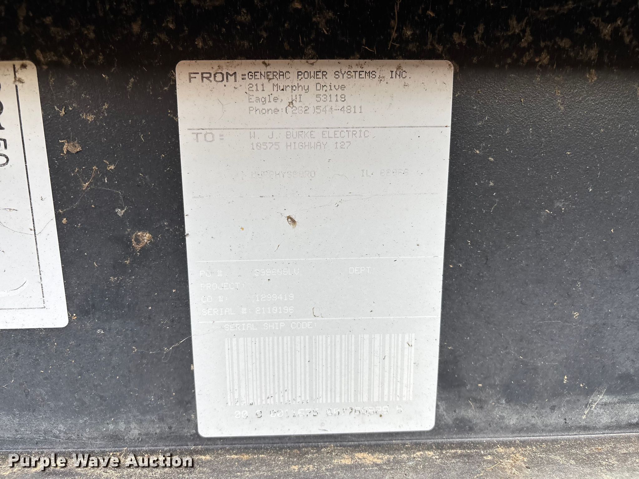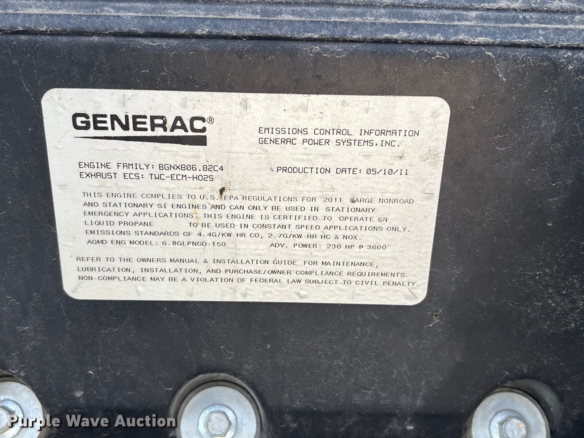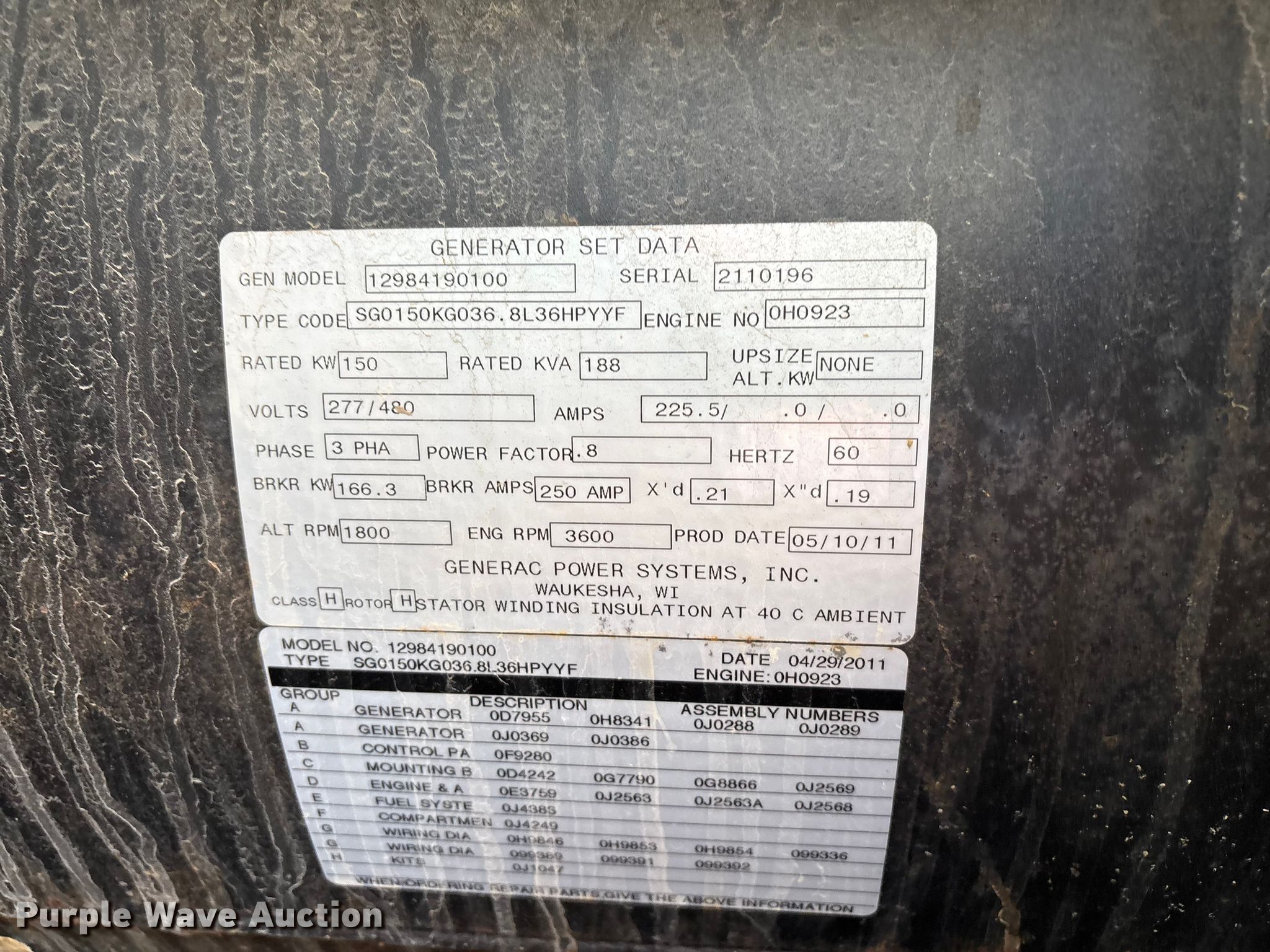 Purple Wave is selling a used Generator Set in Illinois. This item is a 2011 Generac SG150 generator with the following: Hours: 309 on meter, Serial: 2110196