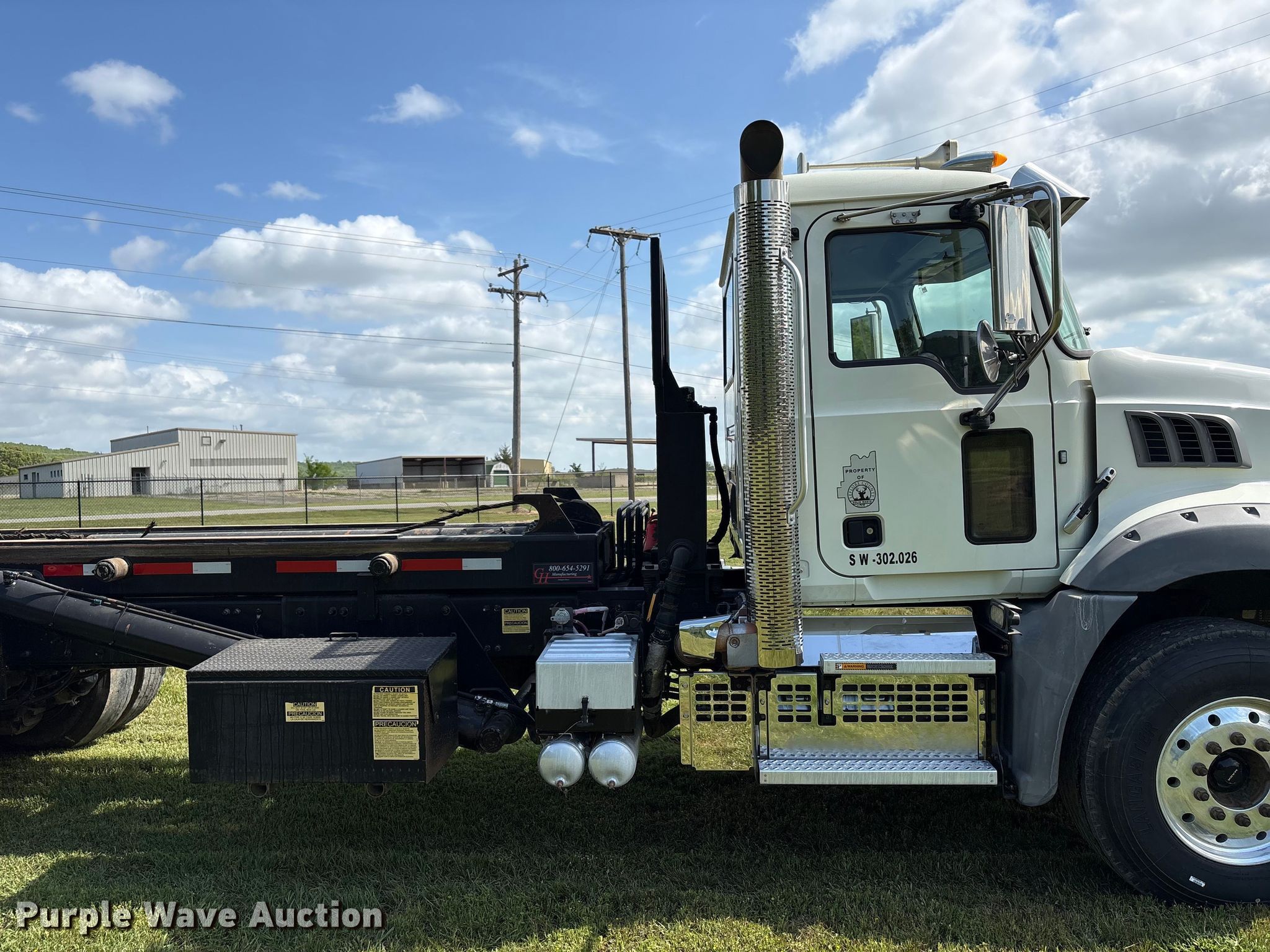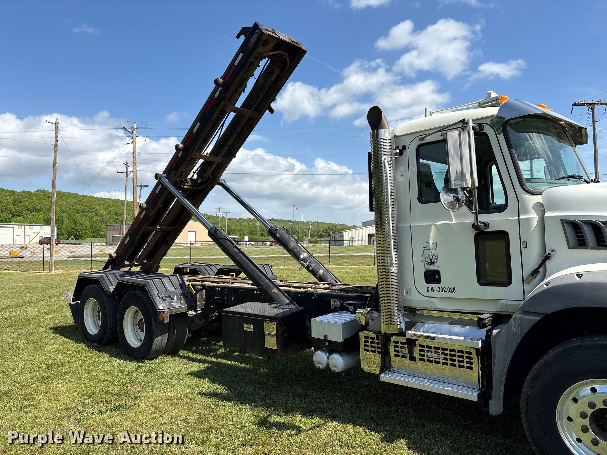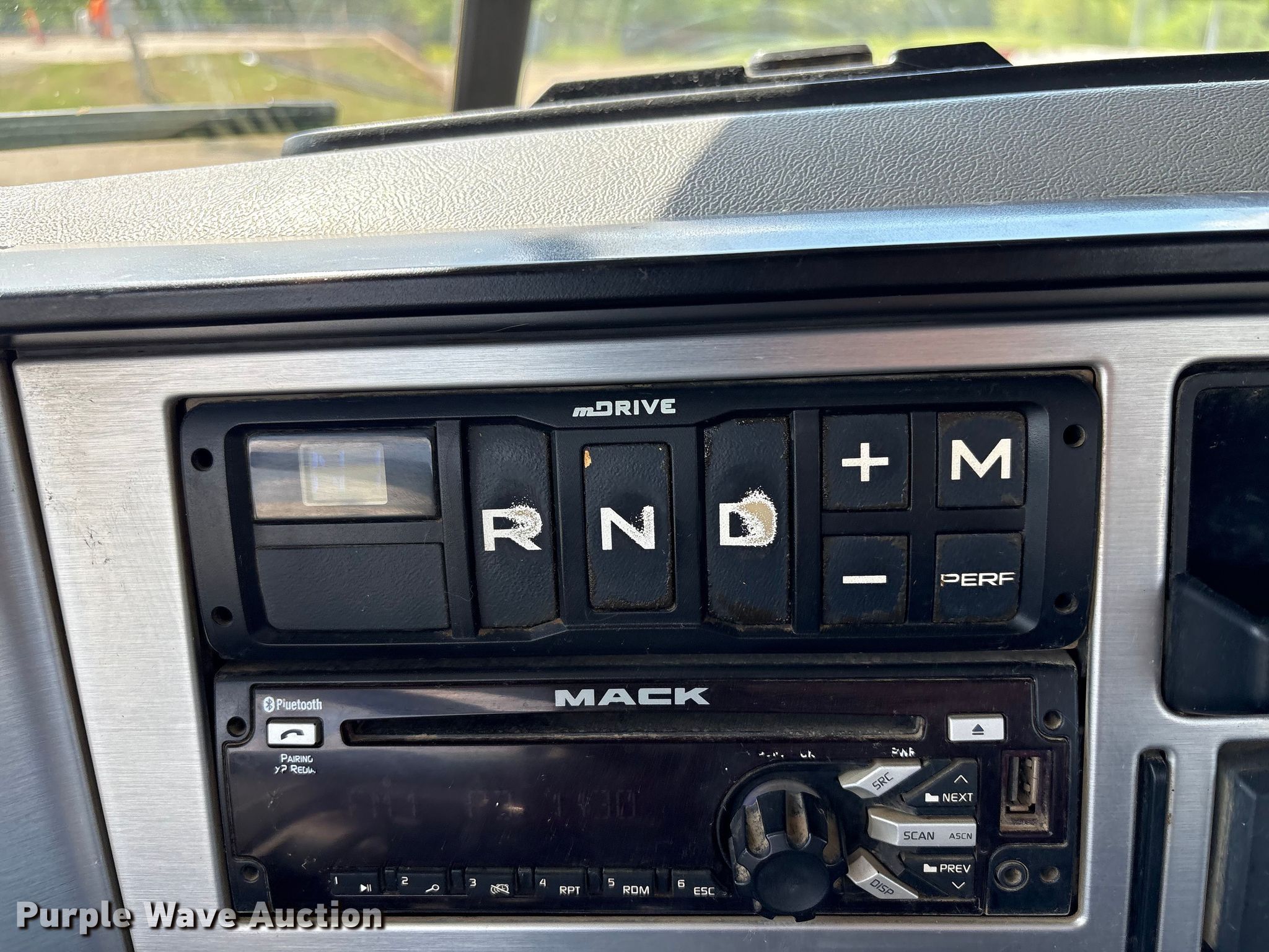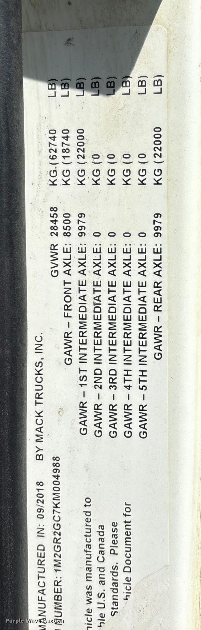 2019 Mack Granite rollback truck. Miles: 289,903 on odometer, Hours: 11,250 on meter, VIN: 1M2GR2GC7KM004988. Engine Mack MP7, Serial: 606502, Displacement: 10.8L, Cylinders: 6, Fuel type: Diesel, HP: 335. Transmission Automatic. Chassis Axles: Tandem, Differential lock: Full, Suspension: Spring, Brakes: Air, PTO, Wet kit, GVWR: 28,458 lbs. Interior AC, Heat, Heated mirrors, Power windows, Power locks, Cruise control, Brake controller. Features Bed Roll-off bed, GH Manufacturing 1575, Serial: 19059265, Length: 23', Width: 33", Ram: Dual, Winch, Rolling tailboard. Tires Front: 385/65R22.5, Rear: 11R22.5. Notes Dash warning indicator: Check engine, Winch cable issues, worn. Oklahoma title. Title distribution may be delayed up to 14 days from verification of funds. LeFlore County Solid Waste. Poteau, OK 74953