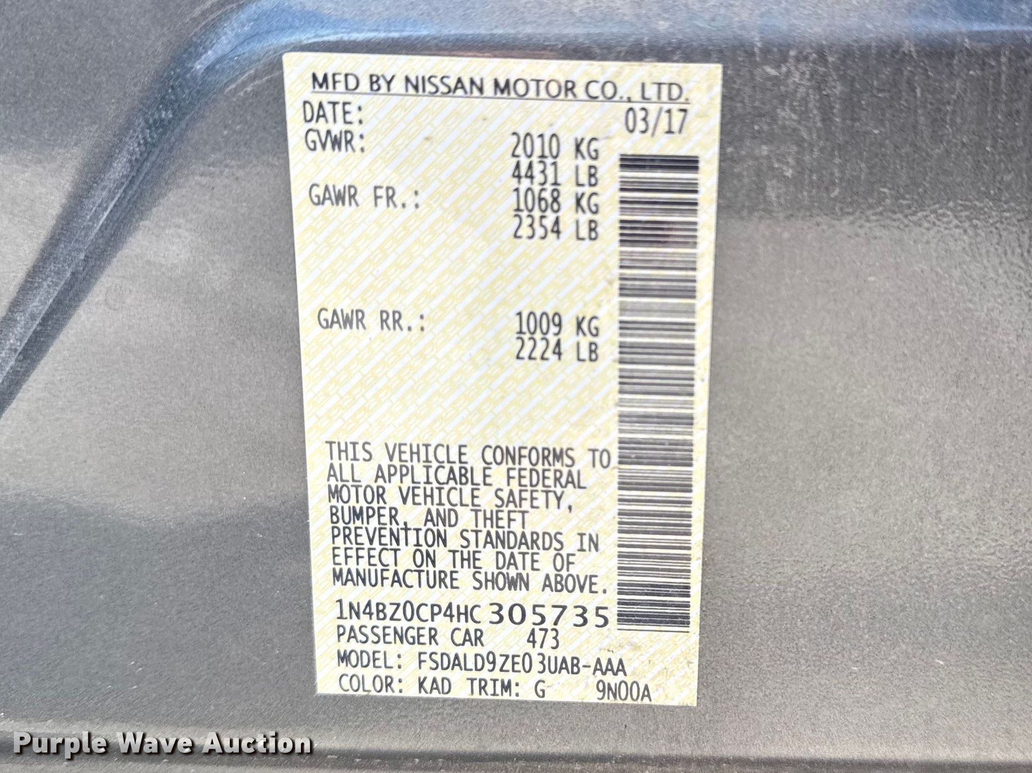 Purple Wave is selling a used Passenger Vehicle in Oklahoma. This item is a 2017 Nissan Leaf with the following: Miles: 16,725 on odometer, VIN: 1N4BZ0CP4HC305735, Unit #: 205