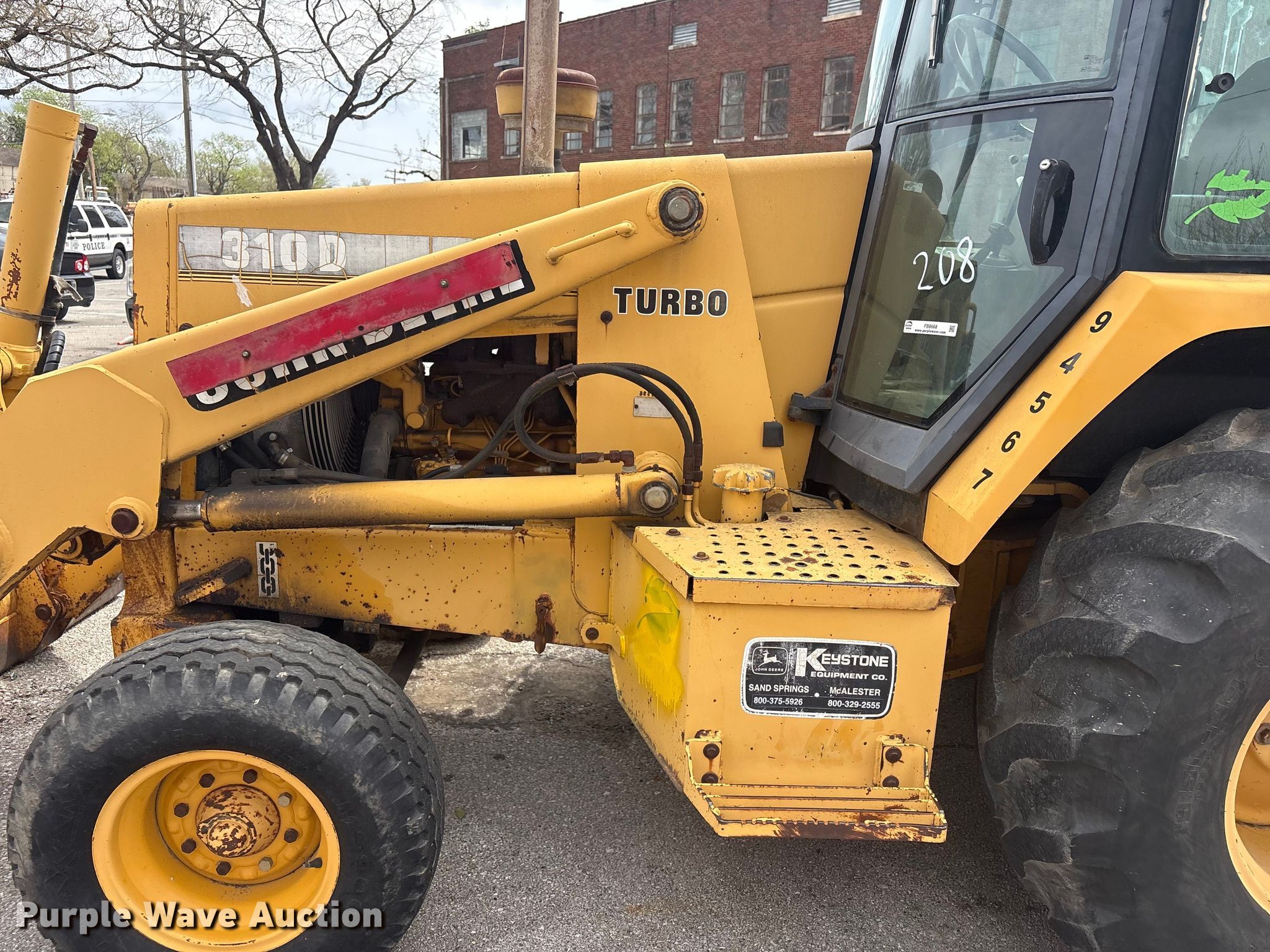 1994 John Deere 310D backhoe. Hours: Unknown, Serial: T0310DB798908, Unit #: 208. Engine John Deere 4039TT003, Serial: T04039T448689, Cylinders: 4, Fuel type: Diesel. Transmission Shuttle shift, 4F - 4R. Operators station Enclosed cab, AC, Heat, Backhoe controls: Wobble stick / two stick. Features Loader Bucket Capacity: 1.3 cu.yd., Width: 91", Cutting edge: Bolt-on, Backhoe Extendable stick, Quick coupler: Manual, Auxiliary hydraulics, Bucket Width: 18", Cutting edge: Weld-on.. Tires Front: 11L-15, Rear: 19.5L-24. Notes Hydraulic leak, Battery missing, will be replaced prior to auction. City of Tulsa. 108 N Trenton Ave. Tulsa, OK 74120