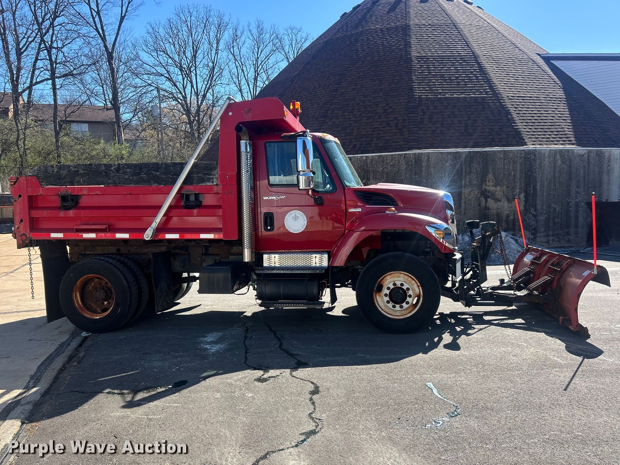 2010 International WorkStar 7400 dump truck. Miles: 27,291 on odometer, Hours: 3,893 on meter, VIN: 1HTWDAAN6AJ262084. Engine International MaxxForce DT, Displacement: 7.6L, Cylinders: 6, Fuel type: Diesel. Transmission Allison, Automatic. Chassis Axles: Single, Suspension: Spring, Brakes: Air, PTO, GVWR: 31,000 lbs. Interior AC, Heat, Heated mirrors, Cruise control. Features Bed Dump bed, Warren U451H-10, Serial: BC59186, Length: 10', Width: 95", Side height: 27", Side board height: 12", Bed type: Steel, Roll tarp, Ram: Single, End gate: Air operated, Plow Western Ultra Finish, Width: 108". Tires Size: 11R22.5. Notes Dash warning indicator: ABS, Traction control. Missouri title. Title distribution may be delayed up to 14 days from verification of funds. City of Creve Coeur, MO. St. Louis, MO 63141