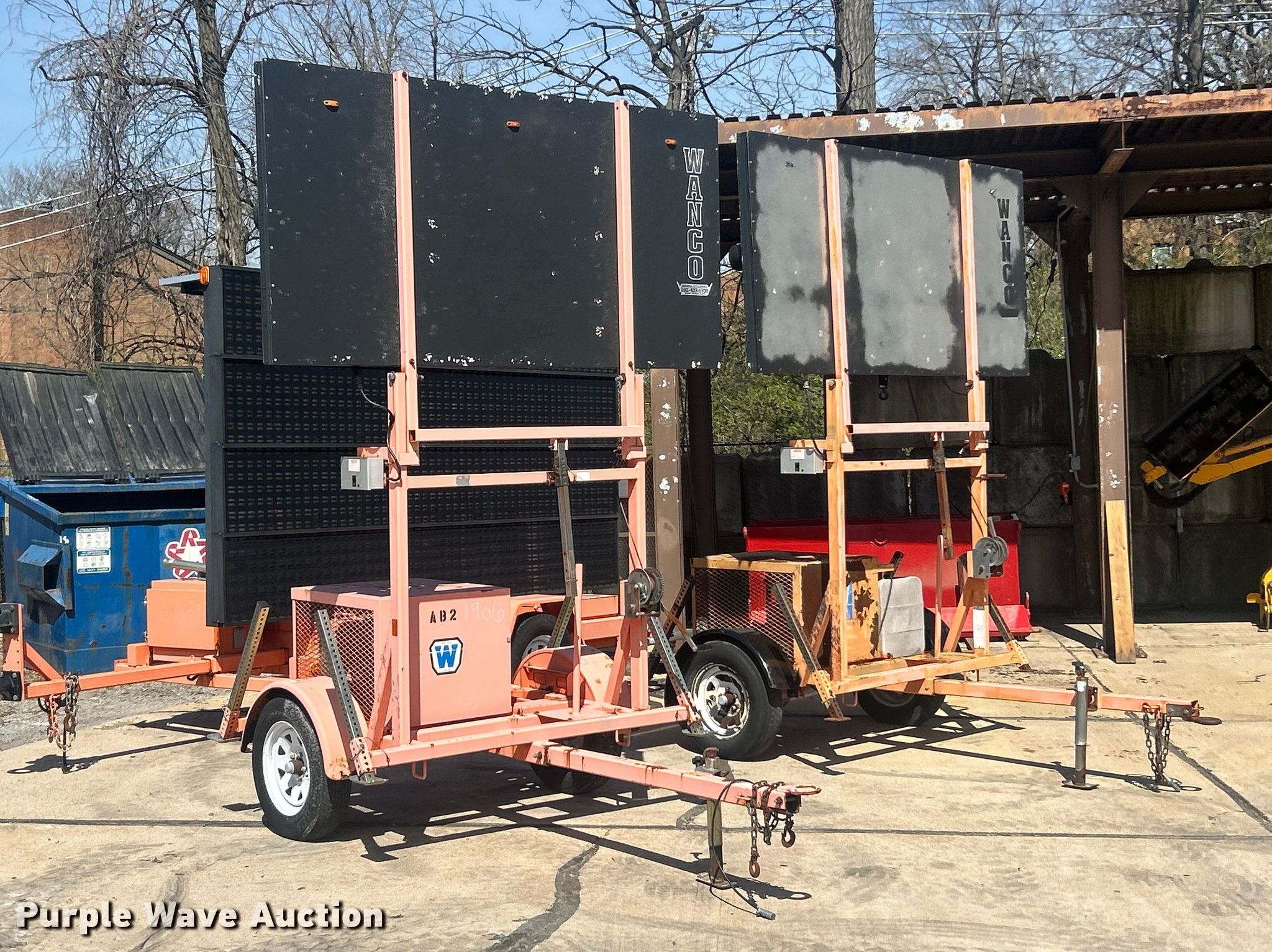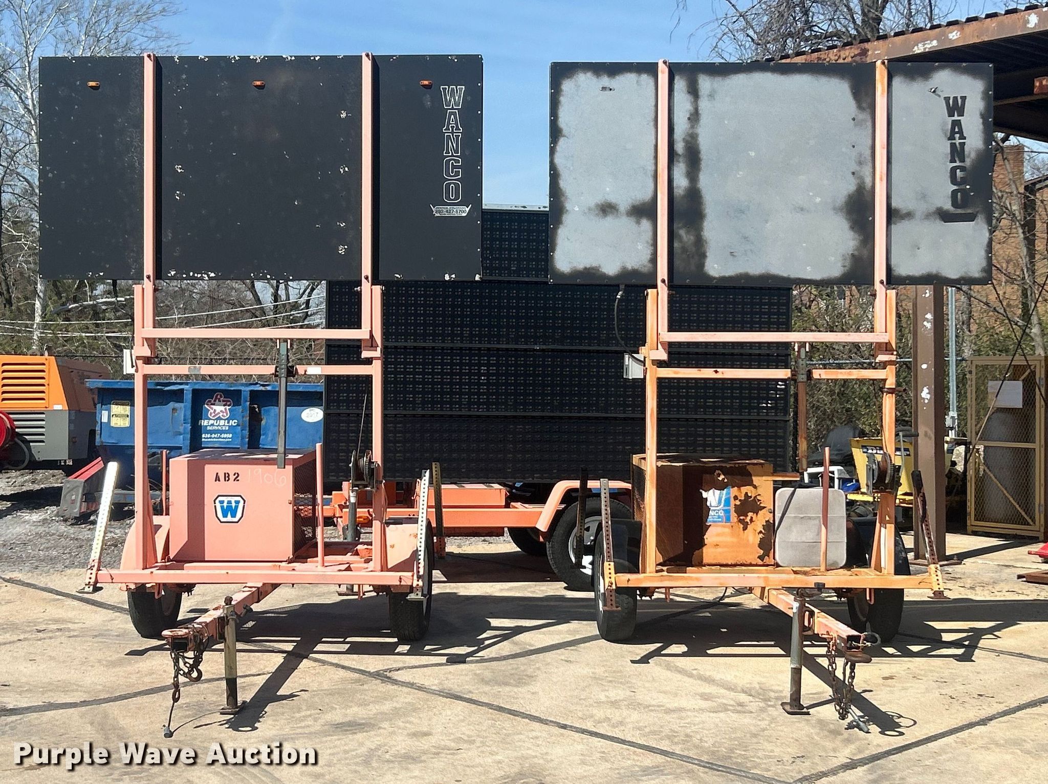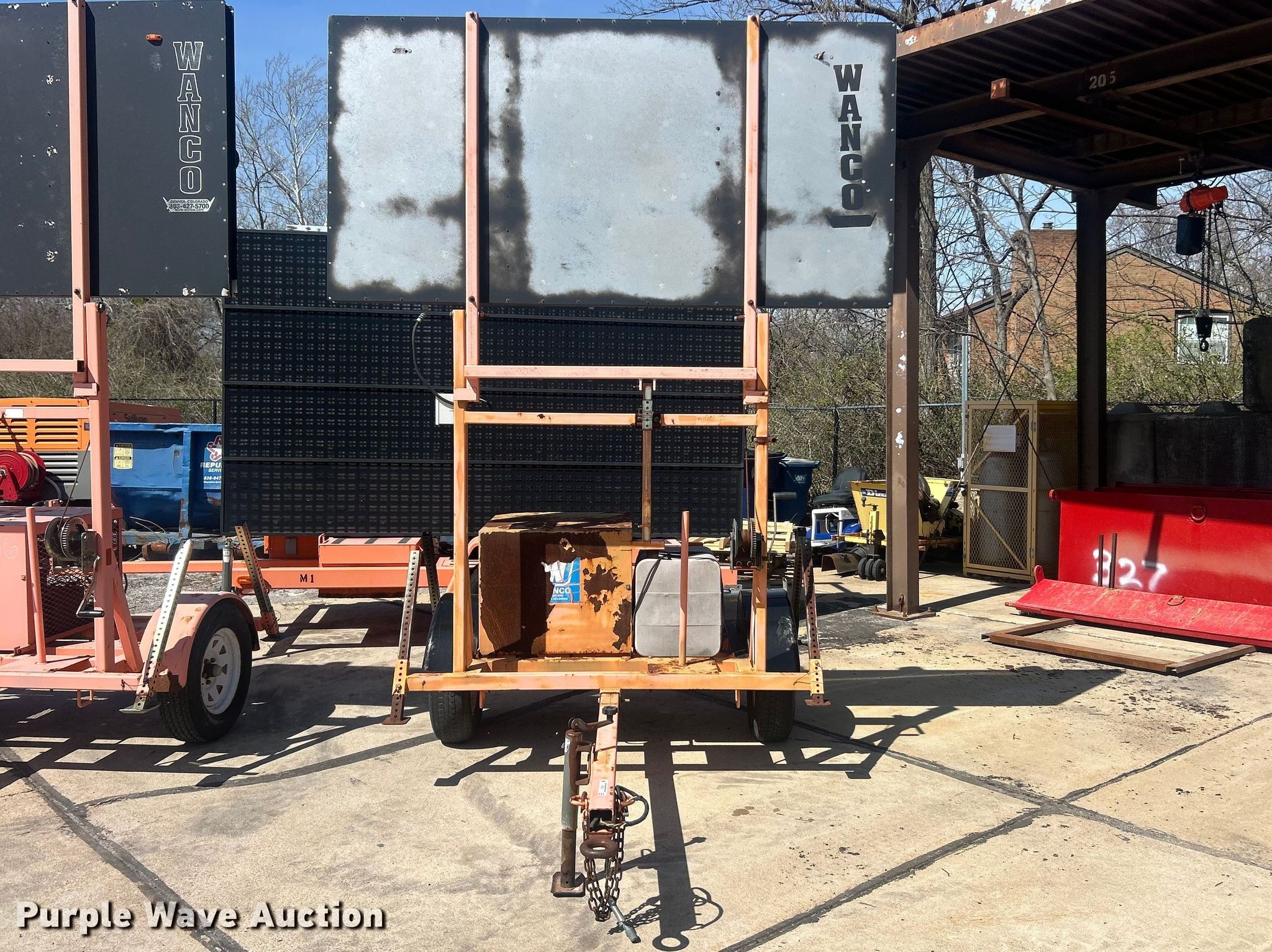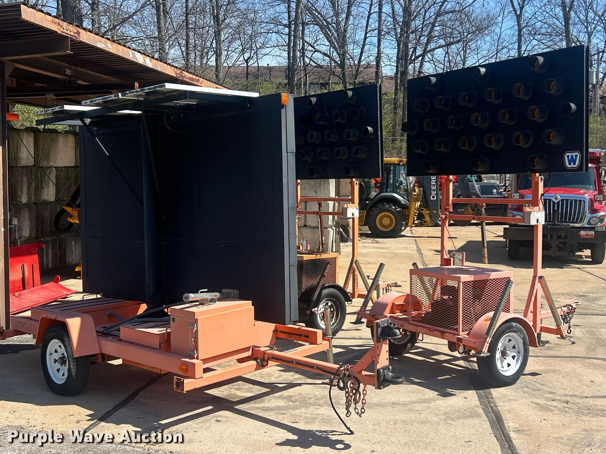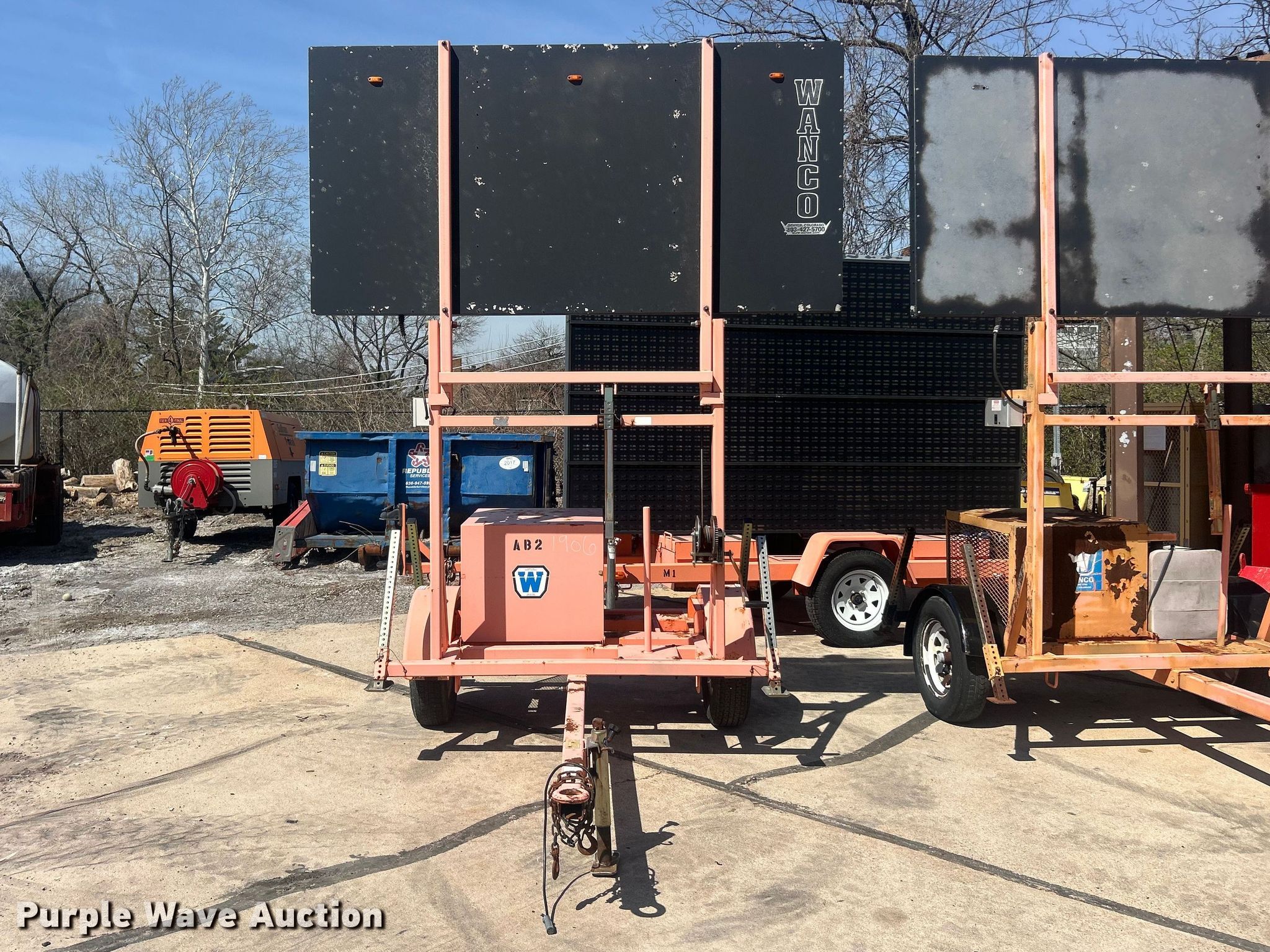 (2) road safety signs. Wanco WTD2B8-SAC arrow board. VIN: 5F11D101011001201. Engine Lombardi, Cylinders: 1, Fuel: Diesel, Hours: 3085. Features Hitch: Pintle, Landing gear: Single, Spring suspension, GVWR: 2100, GAWR: 2000. Tires Size: 205/75D15, Steel wheels. Wanco WTD3B8-SA arrow board VIN: 5F11D101471000299. Engine Predator, Cylinders: 1 cylinder, Fuel: Gas, Features , Hitch: Pintle, Landing gear: Single, Suspension: Spring, GVWR: 2100, GAWR: 2000. Tires Size: 205/75D15, Steel wheels. American Signal message board Features Overall dimensions: 15'L x 80"W x 9'H, Board Dimensions: 11'6"W x 79"H, Solar panels. Tires Size: 205/75D15, Steel wheels. Notes Non-operational. This is worksite support equipment and will not come with a title. Transfer of ownership documentation will be a bill of sale. City of Creve Coeur, MO. St. Louis, MO 63141