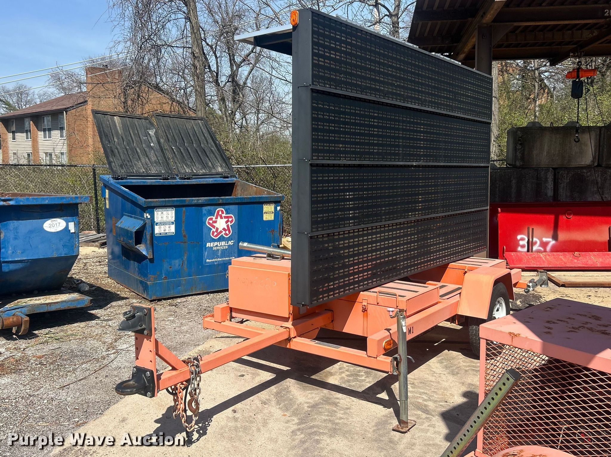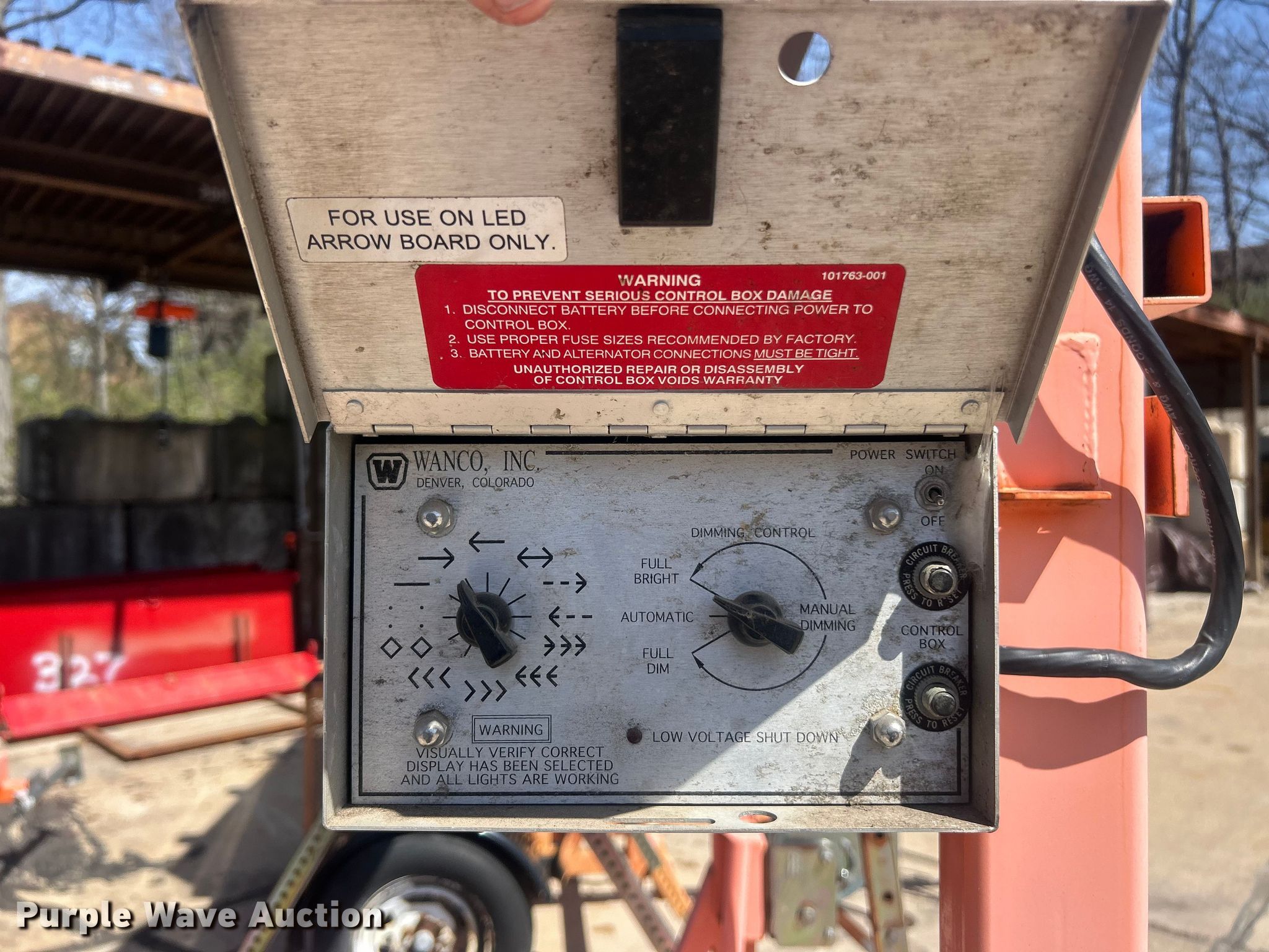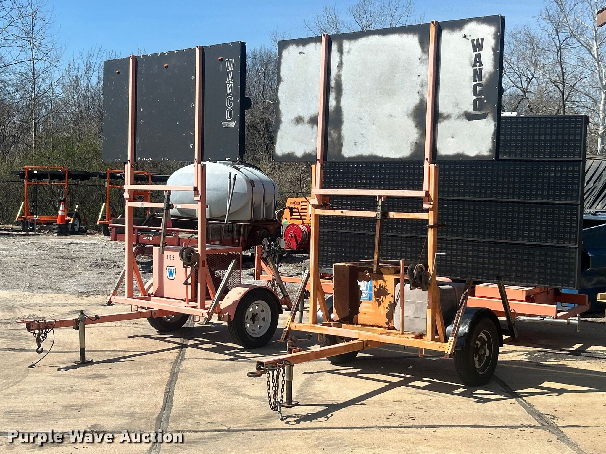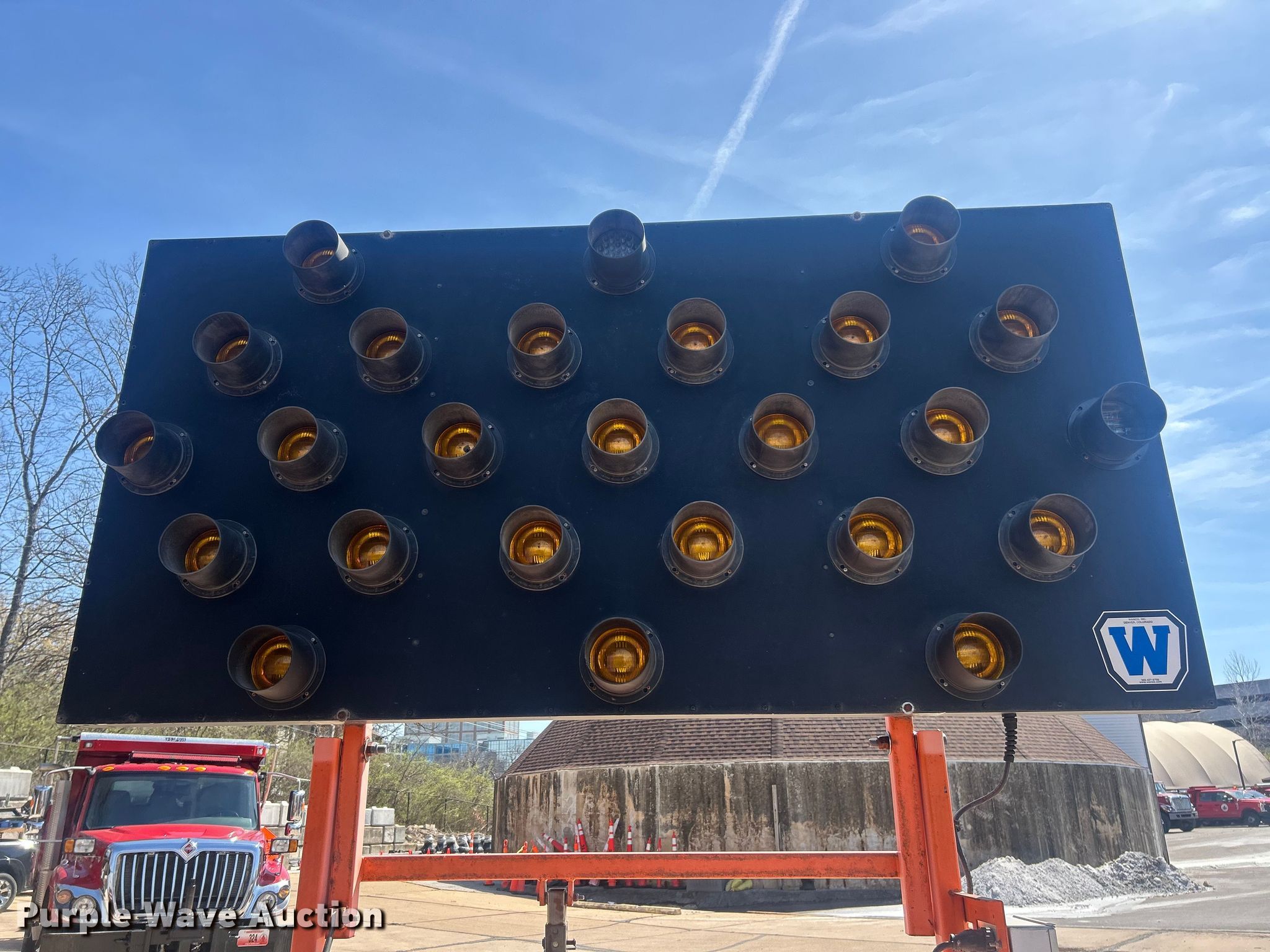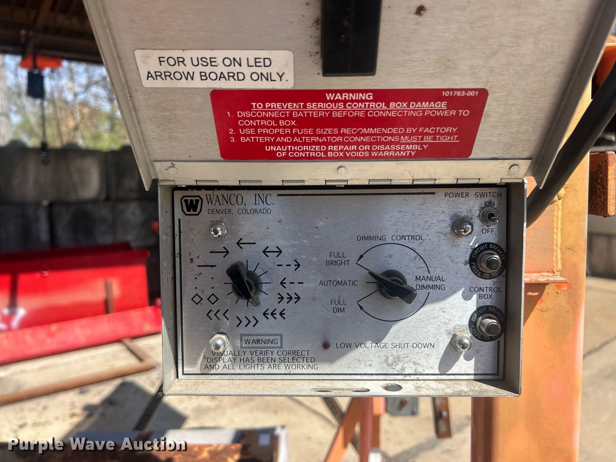 (2) road safety signs. Wanco WTD2B8-SAC arrow board. VIN: 5F11D101011001201. Engine Lombardi, Cylinders: 1, Fuel: Diesel, Hours: 3085. Features Hitch: Pintle, Landing gear: Single, Spring suspension, GVWR: 2100, GAWR: 2000. Tires Size: 205/75D15, Steel wheels. Wanco WTD3B8-SA arrow board VIN: 5F11D101471000299. Engine Predator, Cylinders: 1 cylinder, Fuel: Gas, Features , Hitch: Pintle, Landing gear: Single, Suspension: Spring, GVWR: 2100, GAWR: 2000. Tires Size: 205/75D15, Steel wheels. American Signal message board Features Overall dimensions: 15'L x 80"W x 9'H, Board Dimensions: 11'6"W x 79"H, Solar panels. Tires Size: 205/75D15, Steel wheels. Notes Non-operational. This is worksite support equipment and will not come with a title. Transfer of ownership documentation will be a bill of sale. City of Creve Coeur, MO. St. Louis, MO 63141