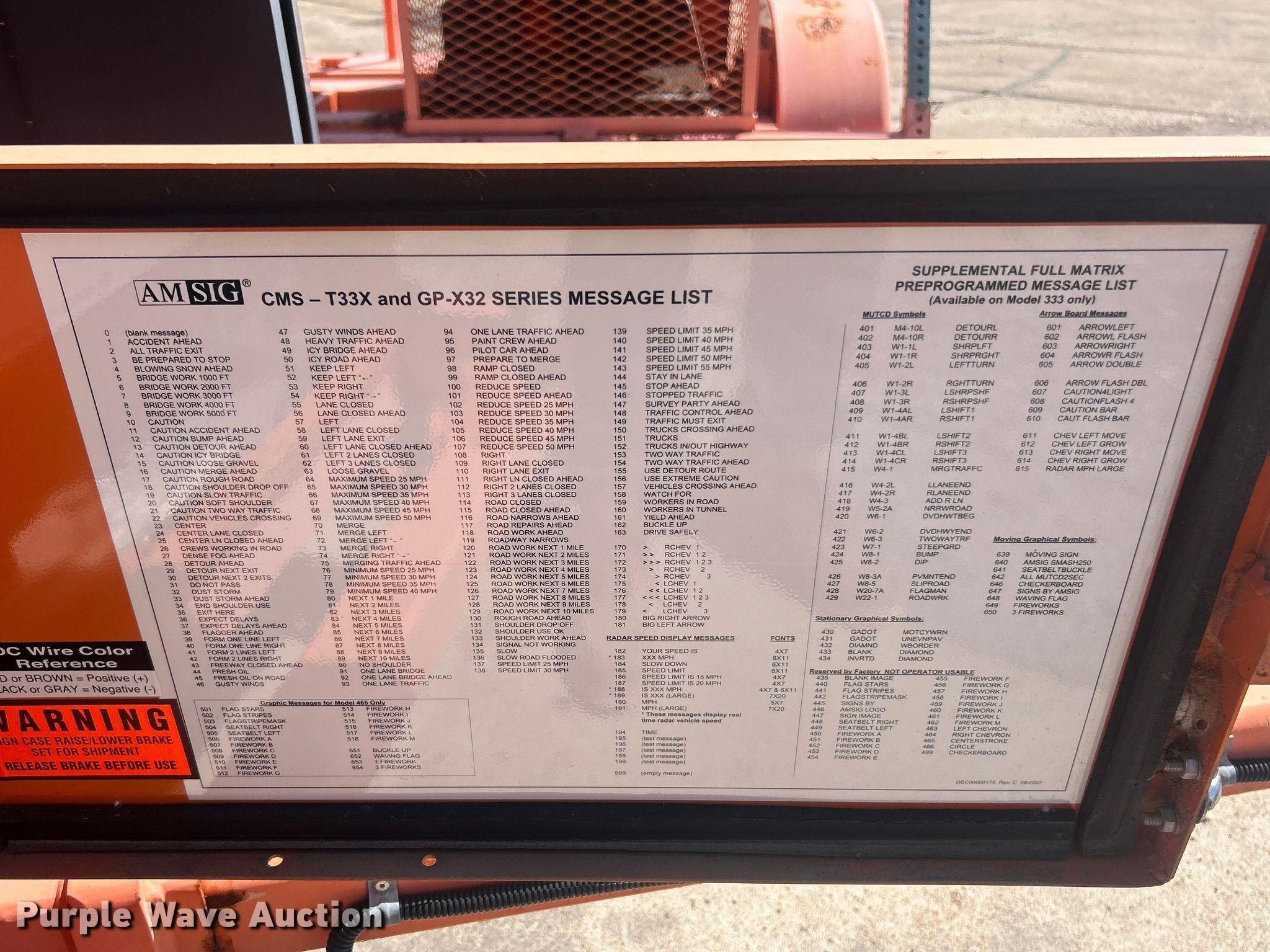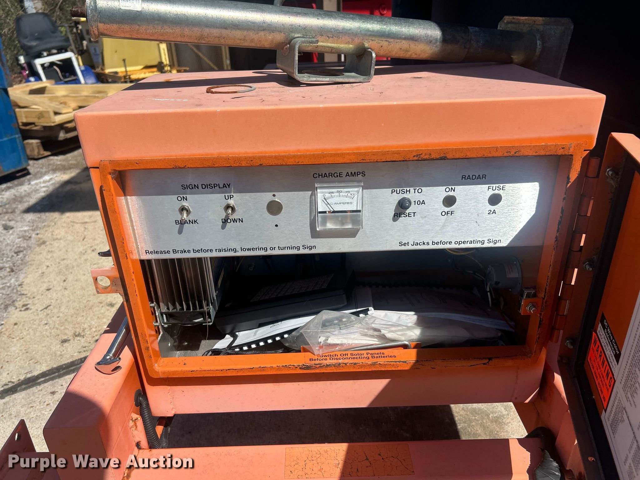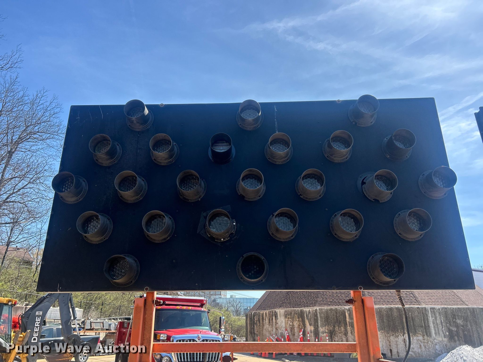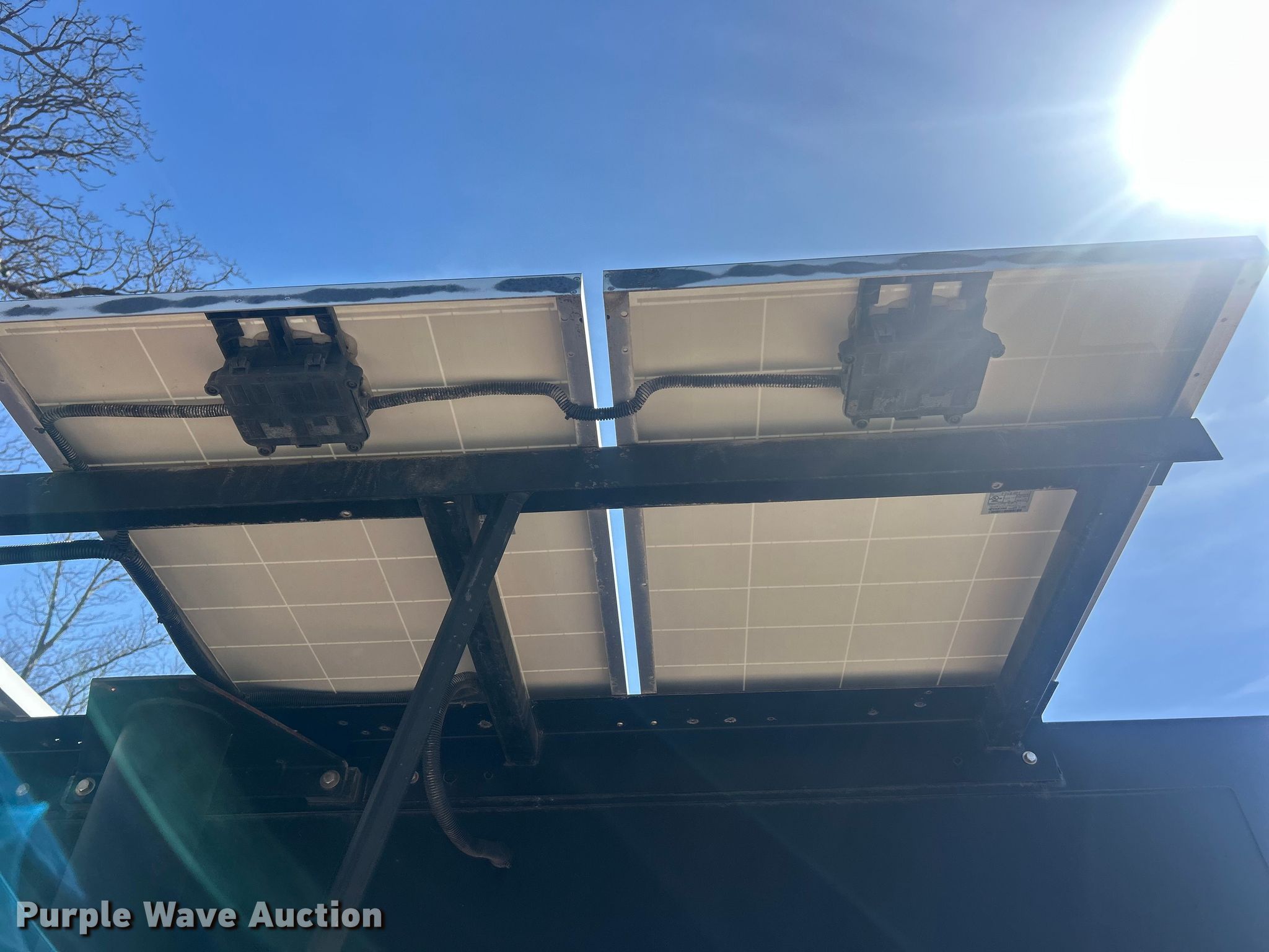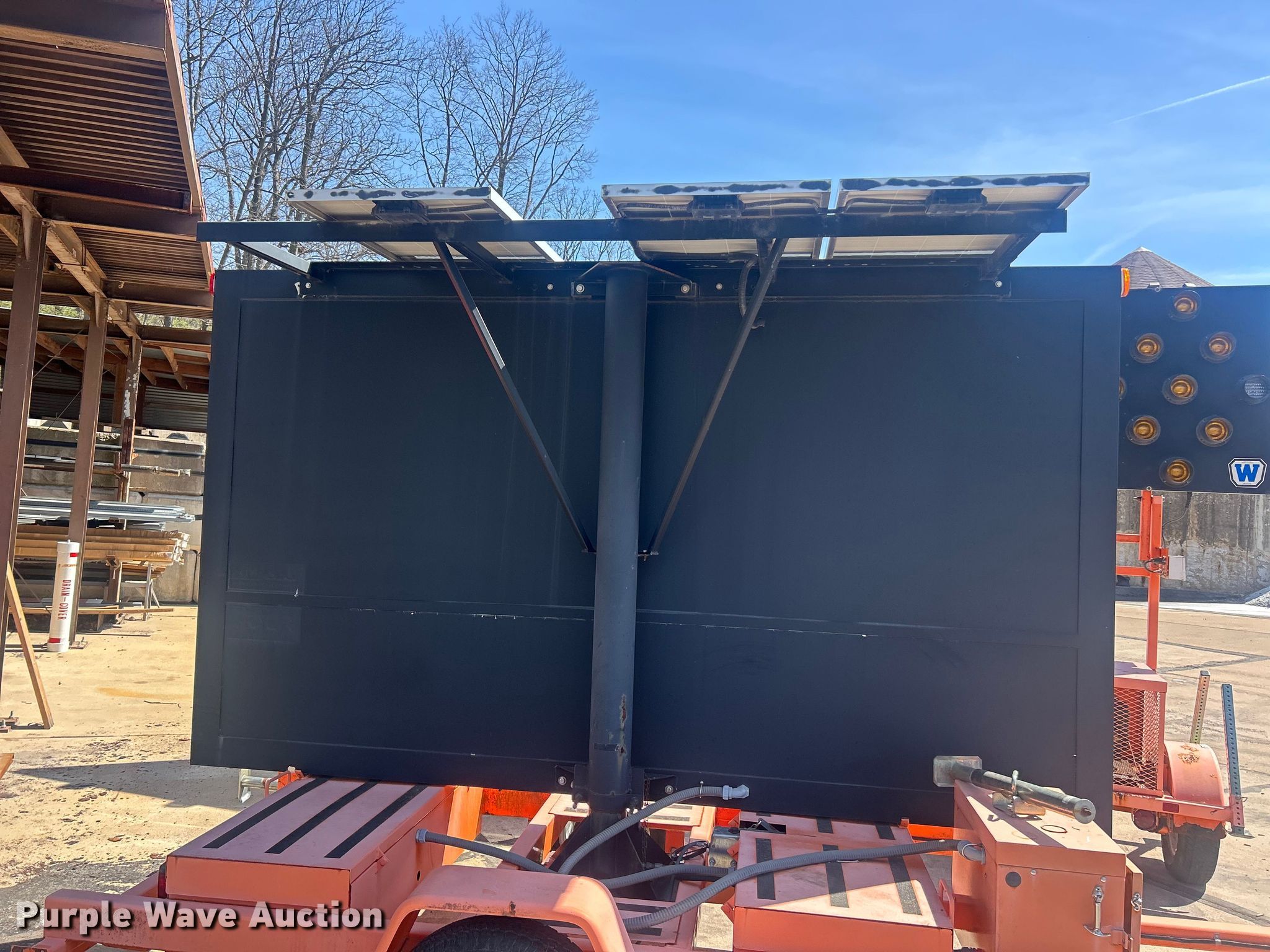(2) road safety signs. Wanco WTD2B8-SAC arrow board. VIN: 5F11D101011001201. Engine Lombardi, Cylinders: 1, Fuel: Diesel, Hours: 3085. Features Hitch: Pintle, Landing gear: Single, Spring suspension, GVWR: 2100, GAWR: 2000. Tires Size: 205/75D15, Steel wheels. Wanco WTD3B8-SA arrow board VIN: 5F11D101471000299. Engine Predator, Cylinders: 1 cylinder, Fuel: Gas, Features , Hitch: Pintle, Landing gear: Single, Suspension: Spring, GVWR: 2100, GAWR: 2000. Tires Size: 205/75D15, Steel wheels. American Signal message board Features Overall dimensions: 15'L x 80"W x 9'H, Board Dimensions: 11'6"W x 79"H, Solar panels. Tires Size: 205/75D15, Steel wheels. Notes Non-operational. This is worksite support equipment and will not come with a title. Transfer of ownership documentation will be a bill of sale. City of Creve Coeur, MO. St. Louis, MO 63141
