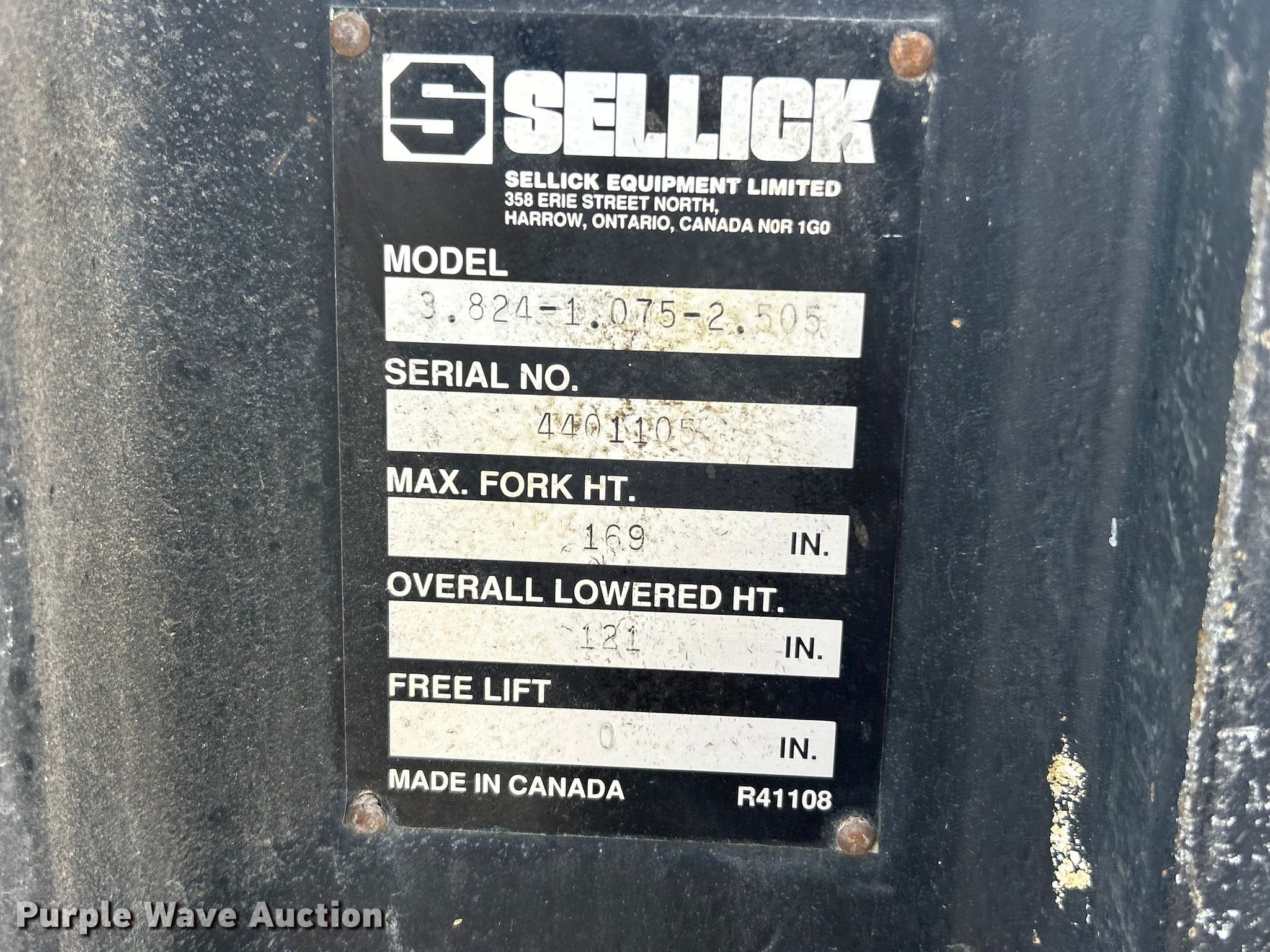 Sellick SD-80 forklift. Hours: 5,588 on meter, Serial: 4712105832, Unit #: 05824. Engine Perkins, Displacement: 4.2L, Cylinders: 4, Fuel type: Diesel. Transmission Shuttle shift. Operators station OROPS. Features Maximum lift capacity: 8,000 lbs, Maximum lift height: 169", Collapsed mast height: 121", Mast stages: 2, Side shift, Mast tilt, Fork length: 46". Tires Front: 16.9-24, Rear: 14-17.5. Notes Jump start required during on-site data collection, Hydraulic issues, leaks, Transmission issues, leaks. Missouri Dept. of Transportation - District 6. Ballwin, MO 63021