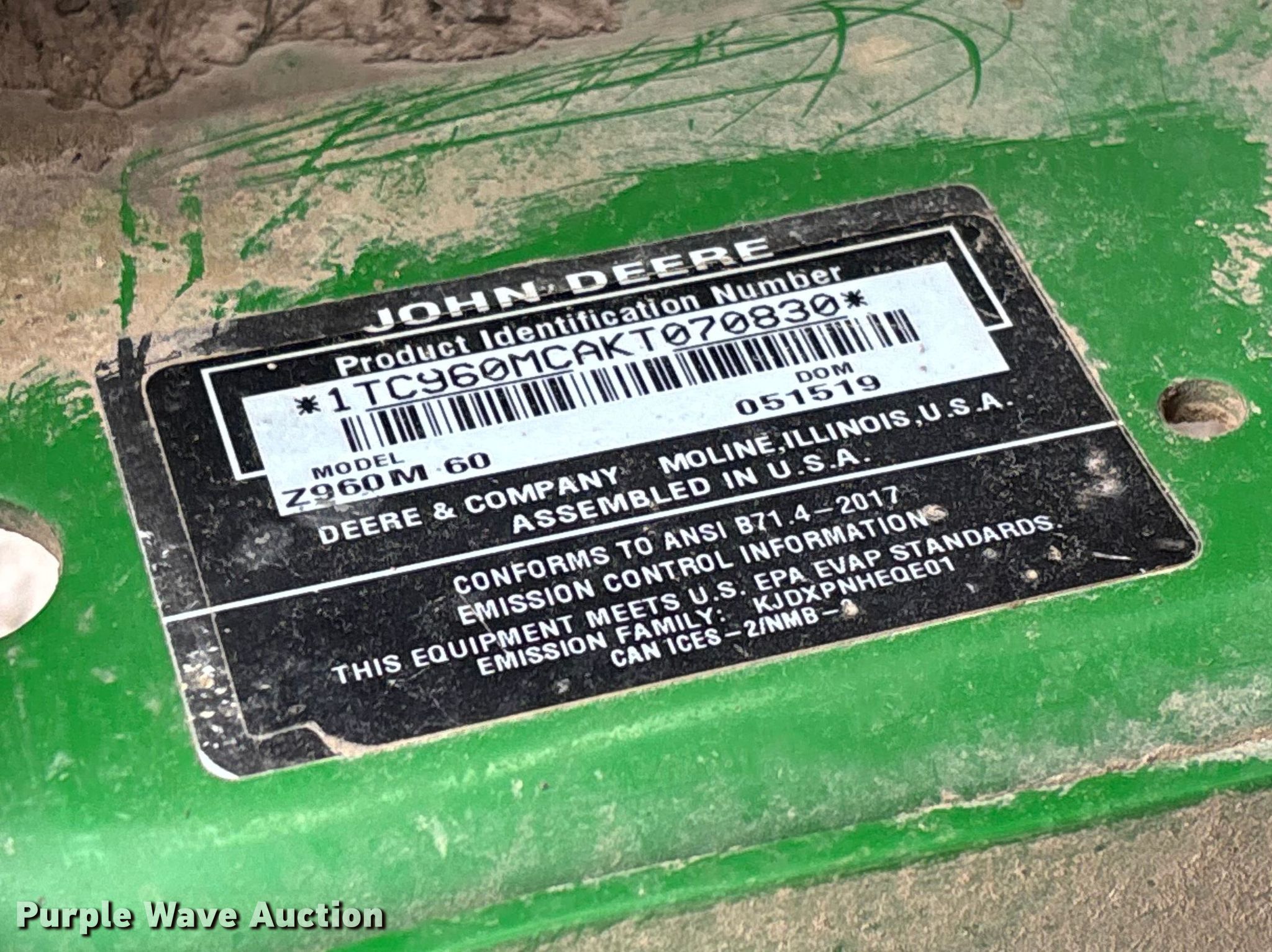Purple Wave is selling a used Commercial Turf Mower in Missouri. This item is a 2019 John Deere Z960M ZTR lawn mower with the following: Hours: 1,389 on meter, Cutting width: 60", Serial: 1TC960MCAKT070830