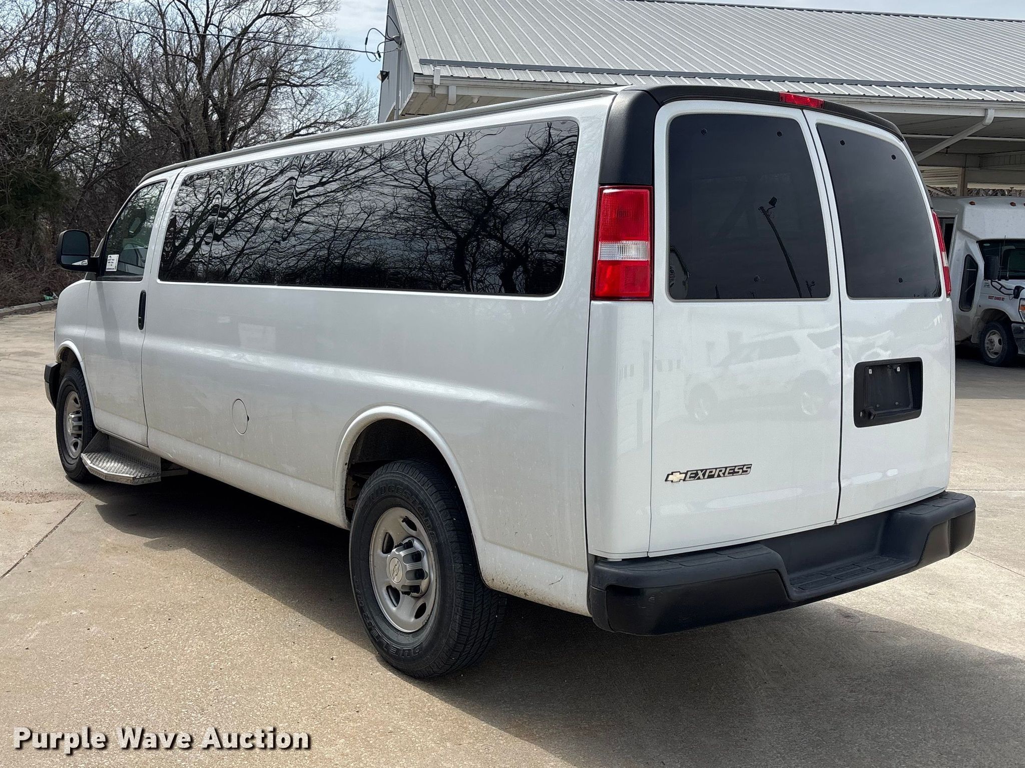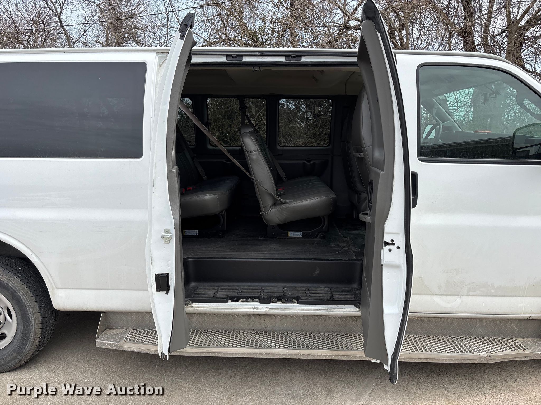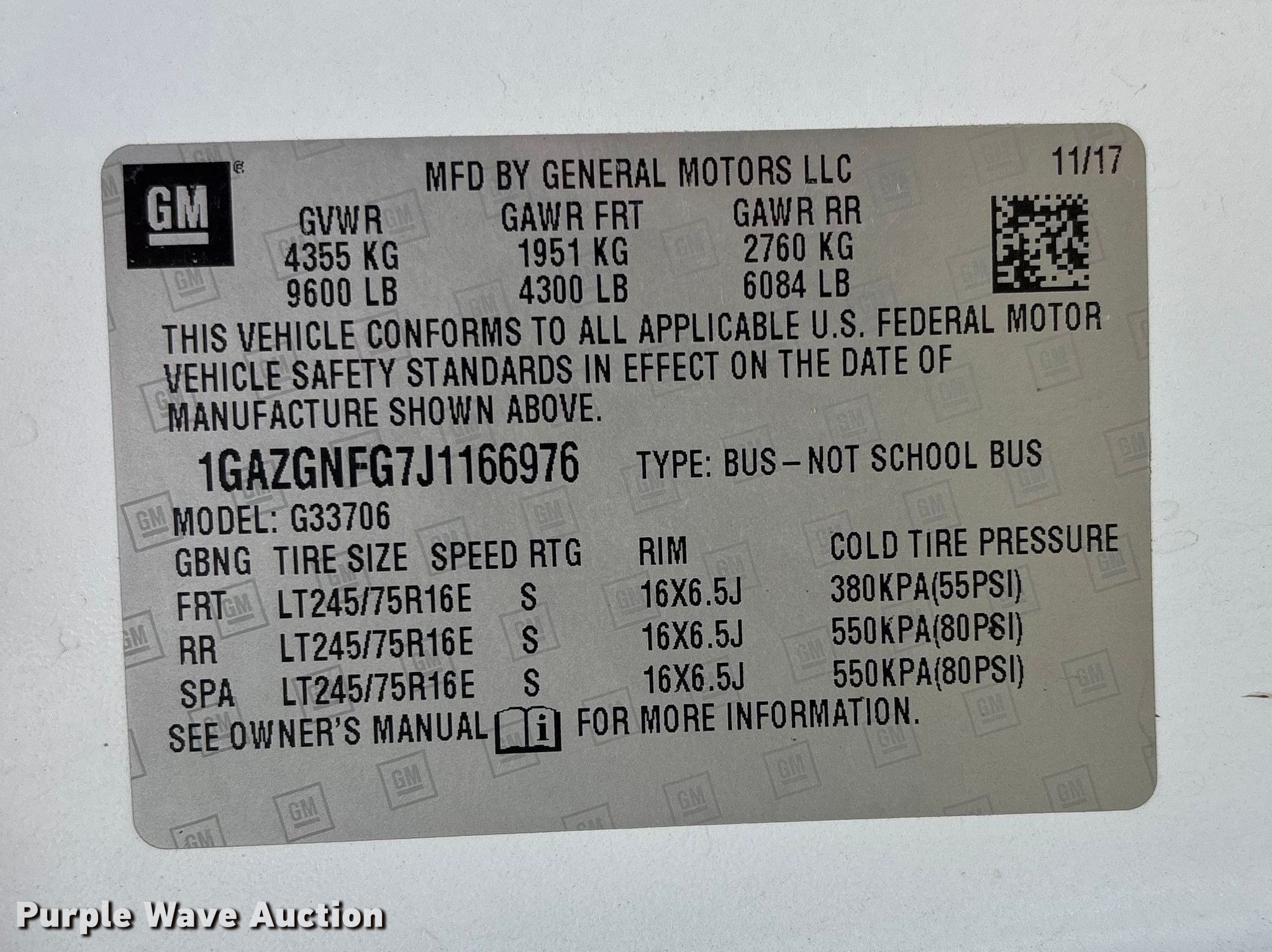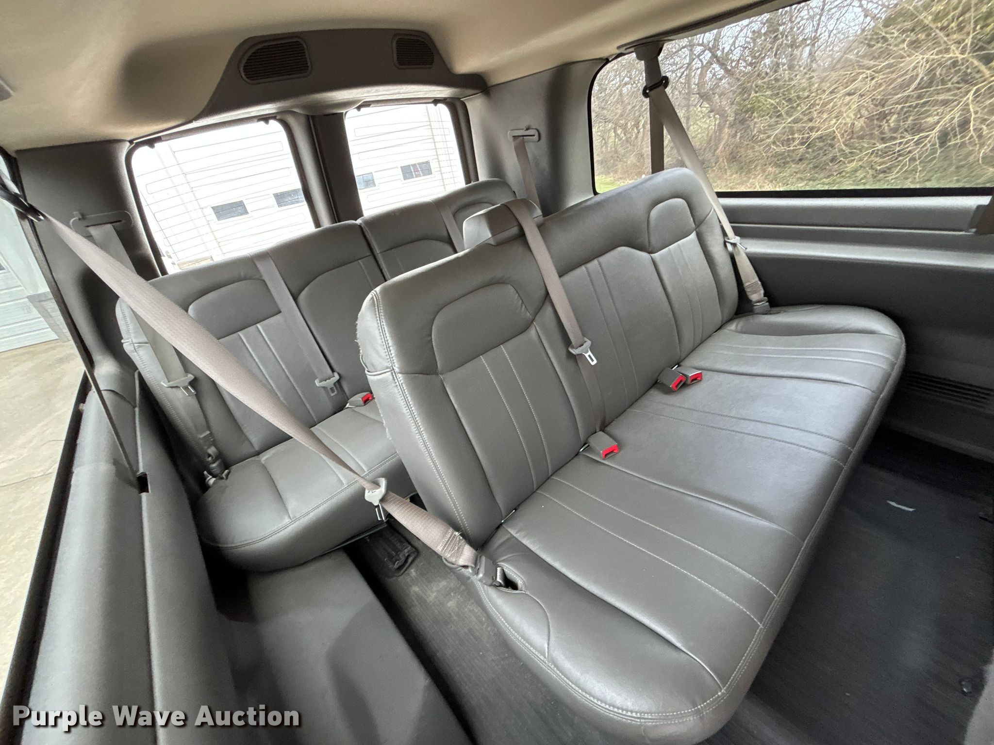 2018 Chevrolet Express 3500 van. Miles: 126,558 on odometer, VIN: 1GAZGNFG7J1166976. Engine Displacement: 6.0L, Cylinders: 8, Fuel type: Gas. Transmission Automatic. Interior AC, Heat, Heated mirrors, Power windows, Power locks, Cruise control, Backup camera. Tires Size: 245/75R16. Notes Dash warning indicator: TPMS. Missouri title. Title distribution may be delayed up to 14 days from verification of funds. Ray County Transportation, Inc.. Richmond, MO 64085