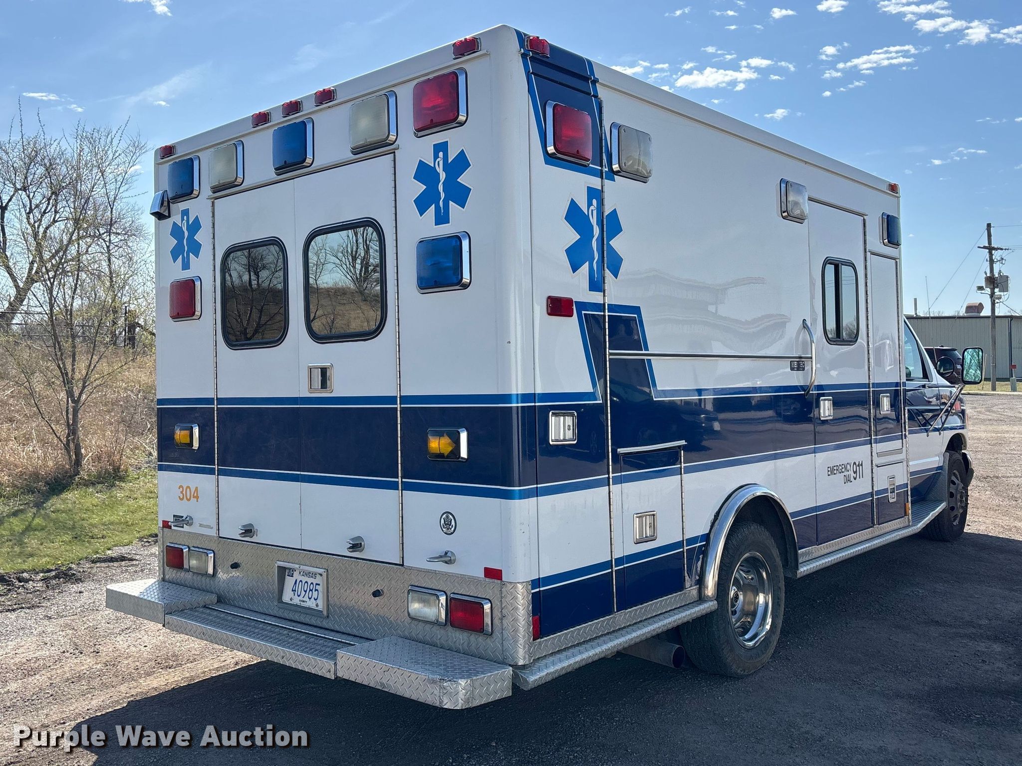 Purple Wave is selling a used Fire Truck or Emergency Vehicle in Kansas. This item is a 2001 Ford E450 ambulance with the following: Miles: 145,011 on odometer, VIN: 1FDXE45F91HB42480, Unit #: 304