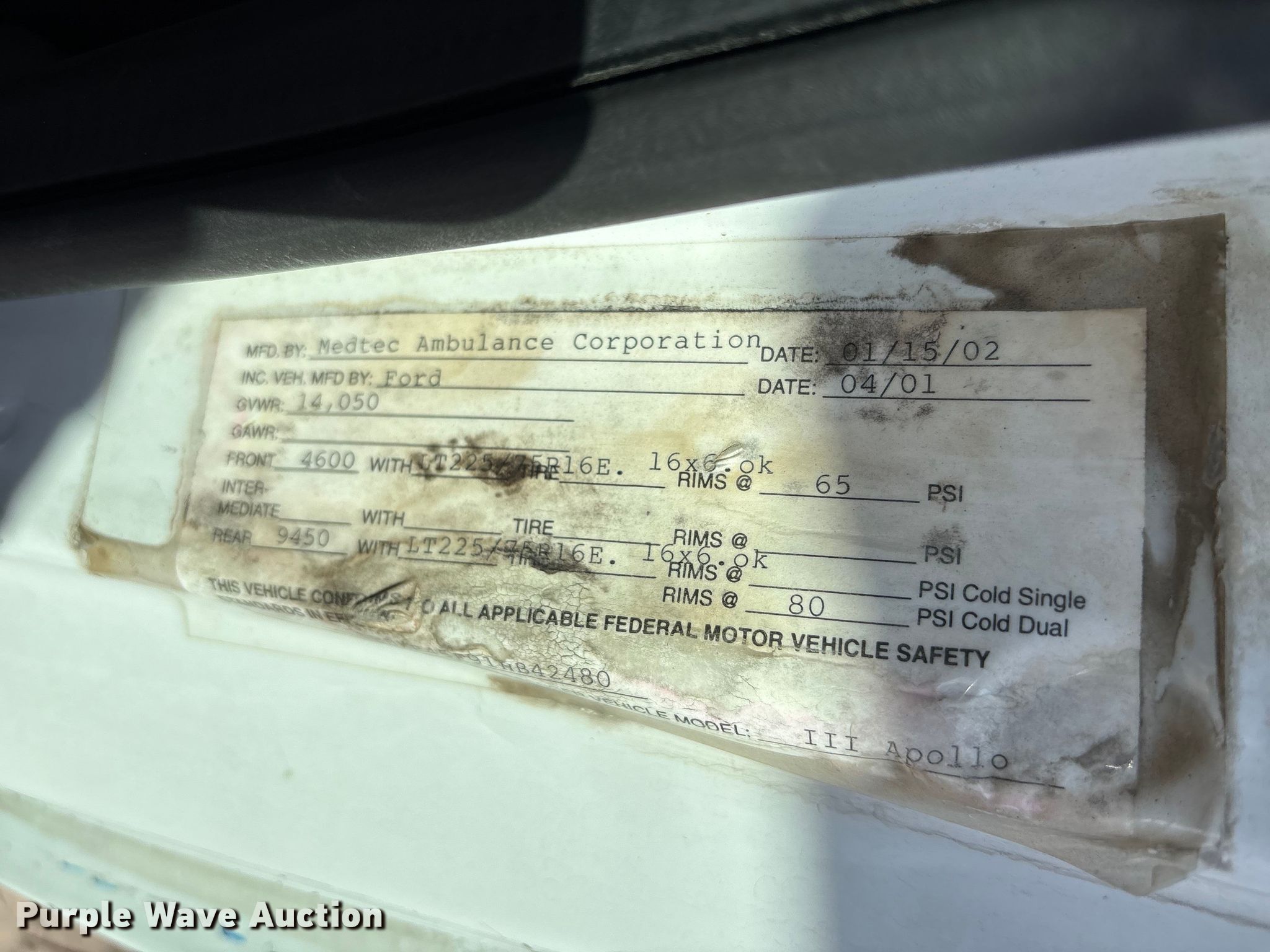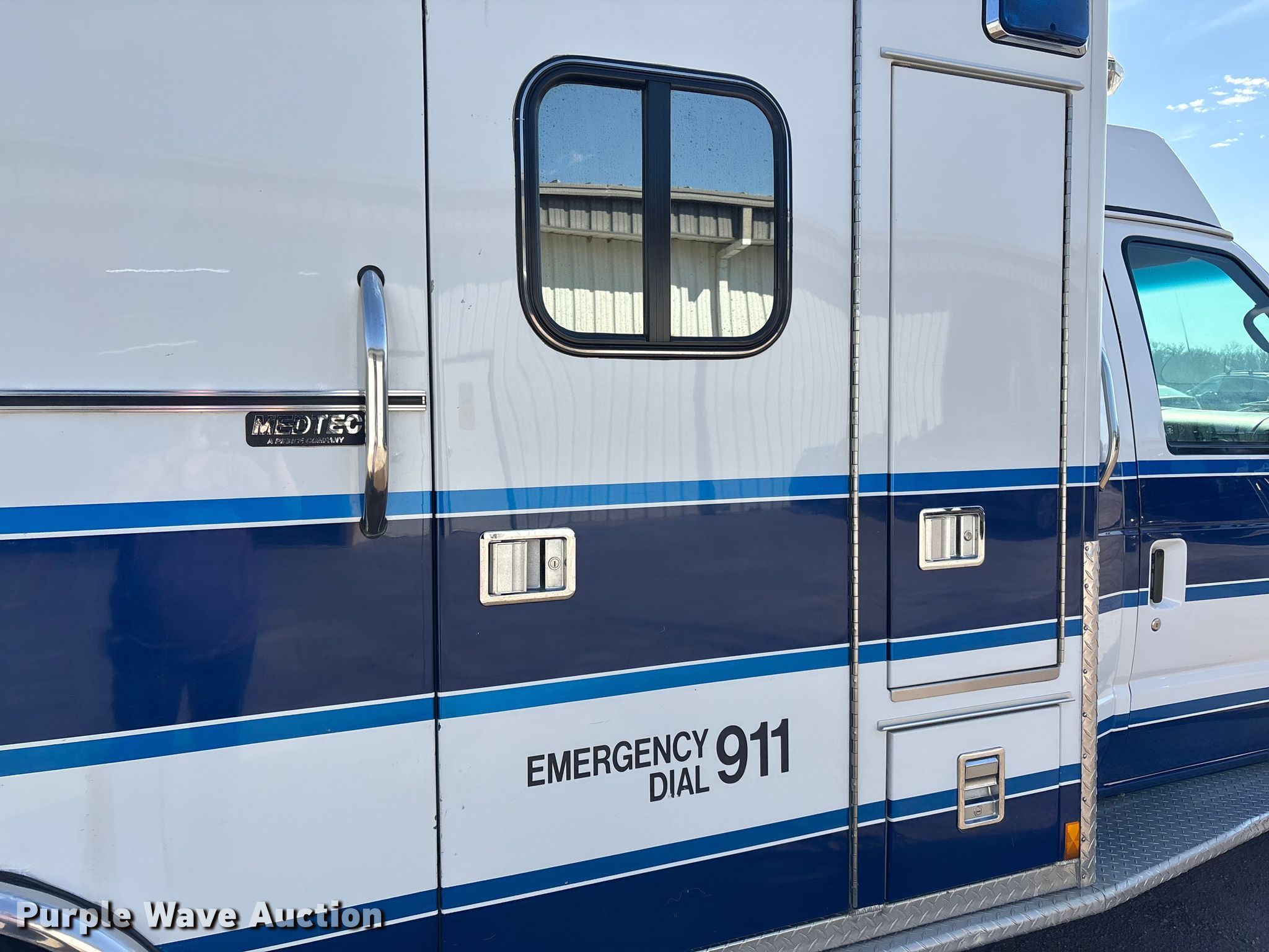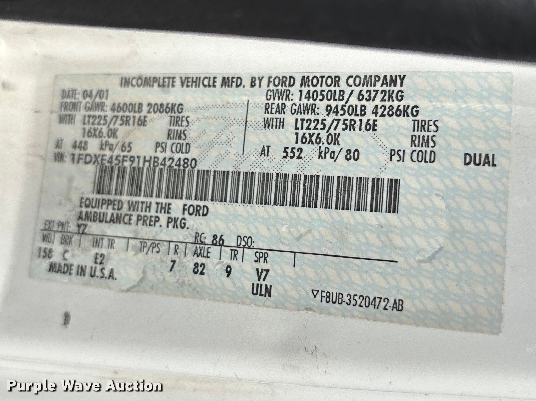 2001 Ford E450 ambulance. Miles: 145,011 on odometer, VIN: 1FDXE45F91HB42480, Unit #: 304. Engine Fuel type: Diesel. Transmission Automatic. Chassis Axles: Single, Suspension: Spring, Brakes: Hydraulic, GVWR: 14,050 lbs, Wheelbase: 156". Interior AC, Heat, Power windows, Power locks, Cruise control. Features Ambulance body Medtec, PA/ siren controls, Oxygen hookups, Backup alarm. Tires Size: 225/75r16, Brand: Hankook. Notes Backup alarm. Kansas title. Title distribution may be delayed up to 14 days from verification of funds. Council Grove, KS 66846