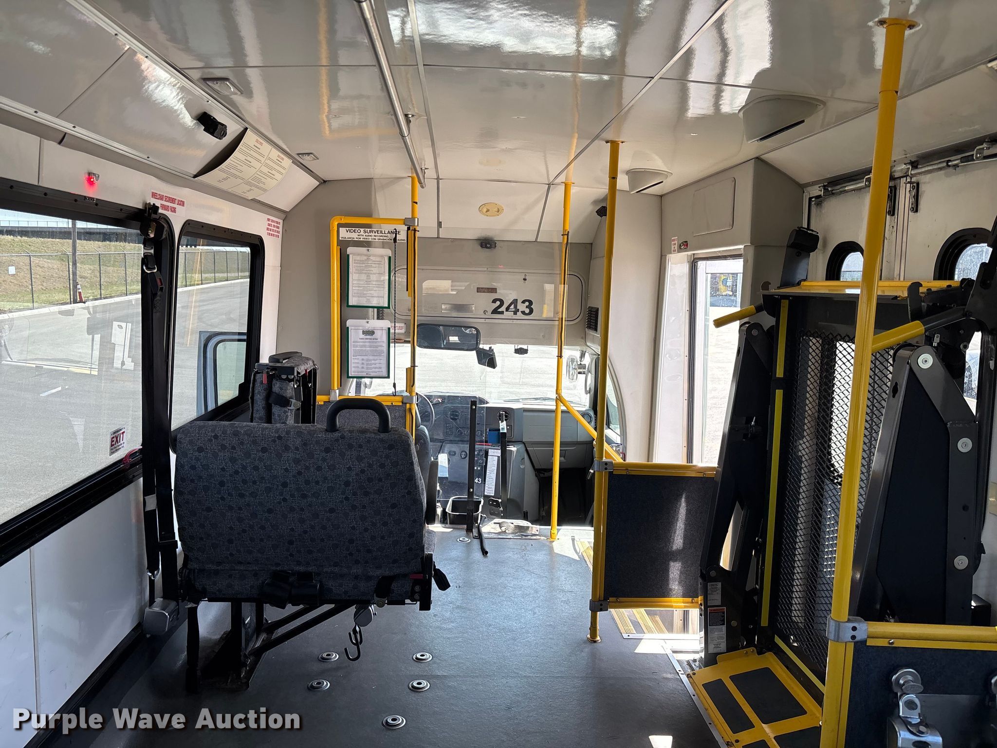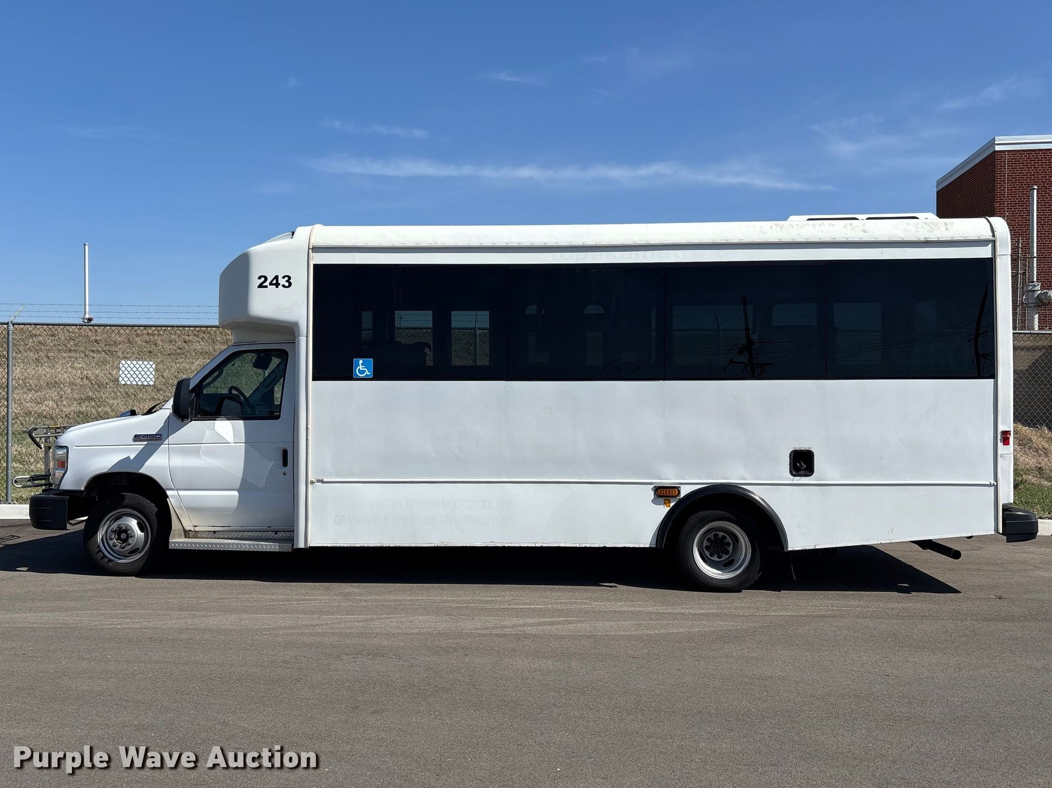 2013 Glaval E450 Super Duty transit bus. Miles: 186,129 on odometer, Hours: 15,396 on meter, VIN: 1FDXE4FS1DDA30957, Unit #: 243. Engine Displacement: 6.8L, Cylinders: 10, Fuel type: Gas. Transmission Automatic. Chassis Axles: Single, Suspension: Spring, Brakes: Hydraulic, GVWR: 14,500 lbs, Wheelbase: 216". Interior AC, Heat, Cruise control, Backup camera, Passengers: 11, Wheelchair lift. Tires Size: 205/75R16, Brand: Hankook. Kansas title. Title distribution may be delayed up to 14 days from verification of funds. Topeka, KS 66603