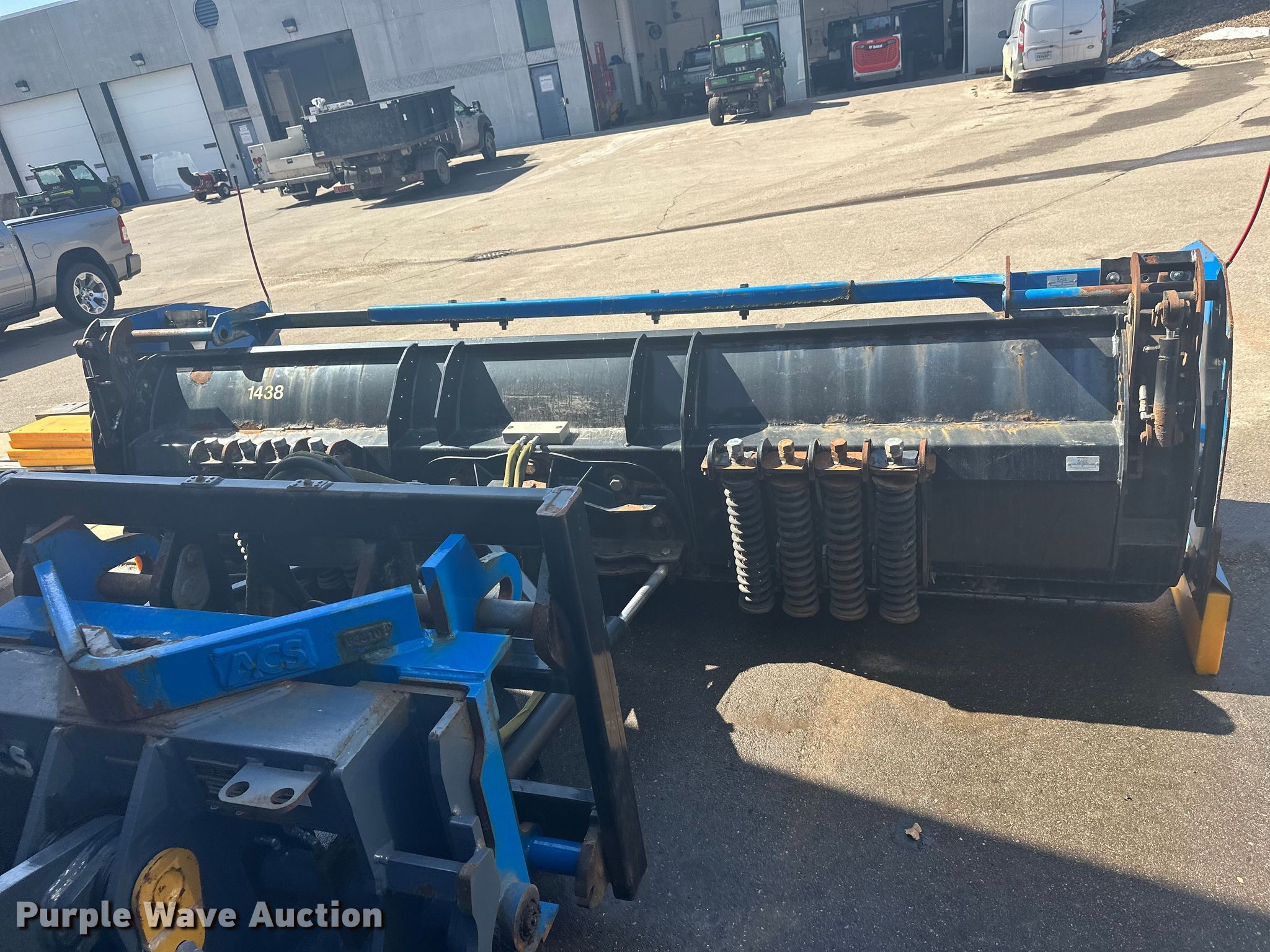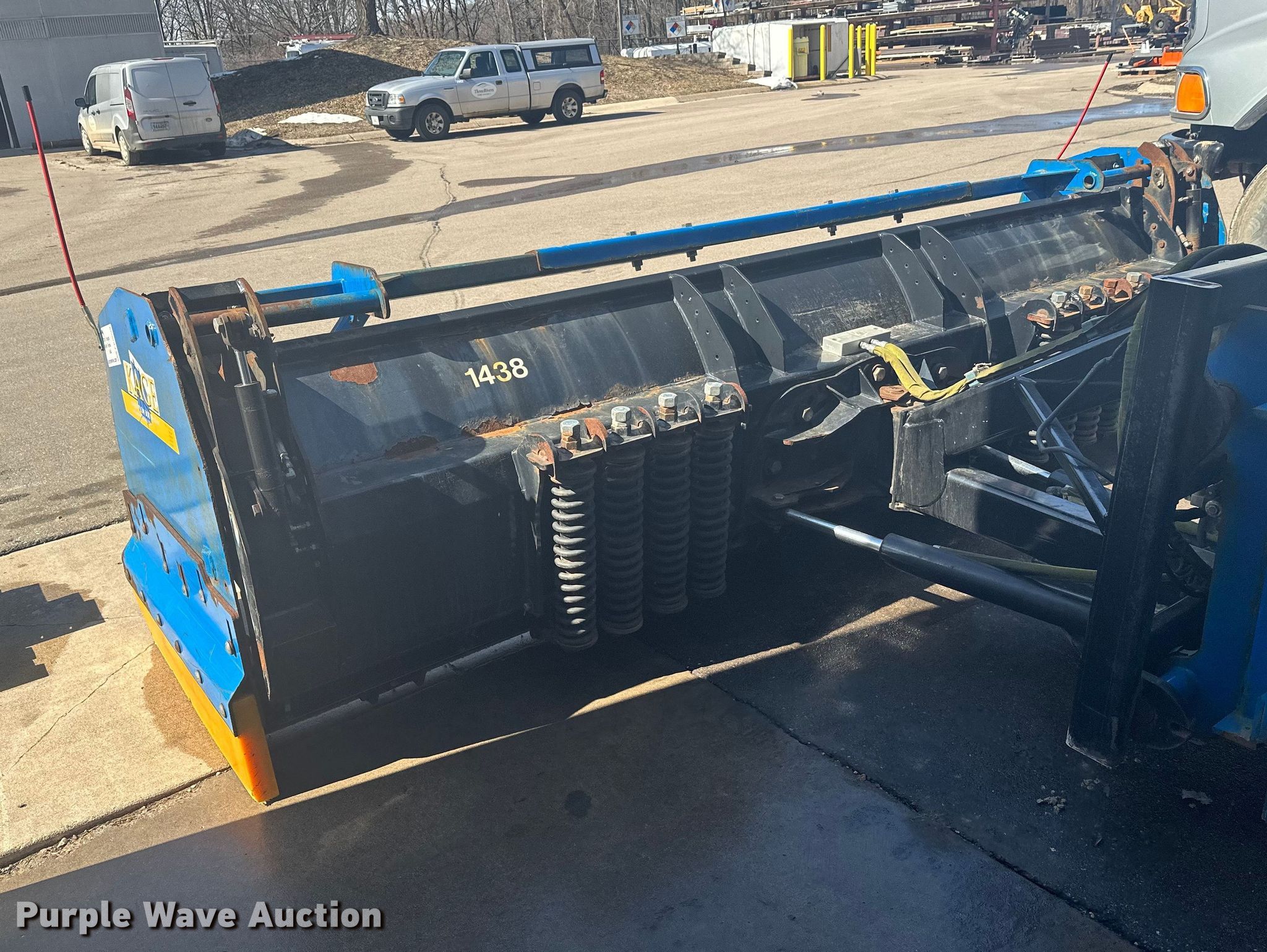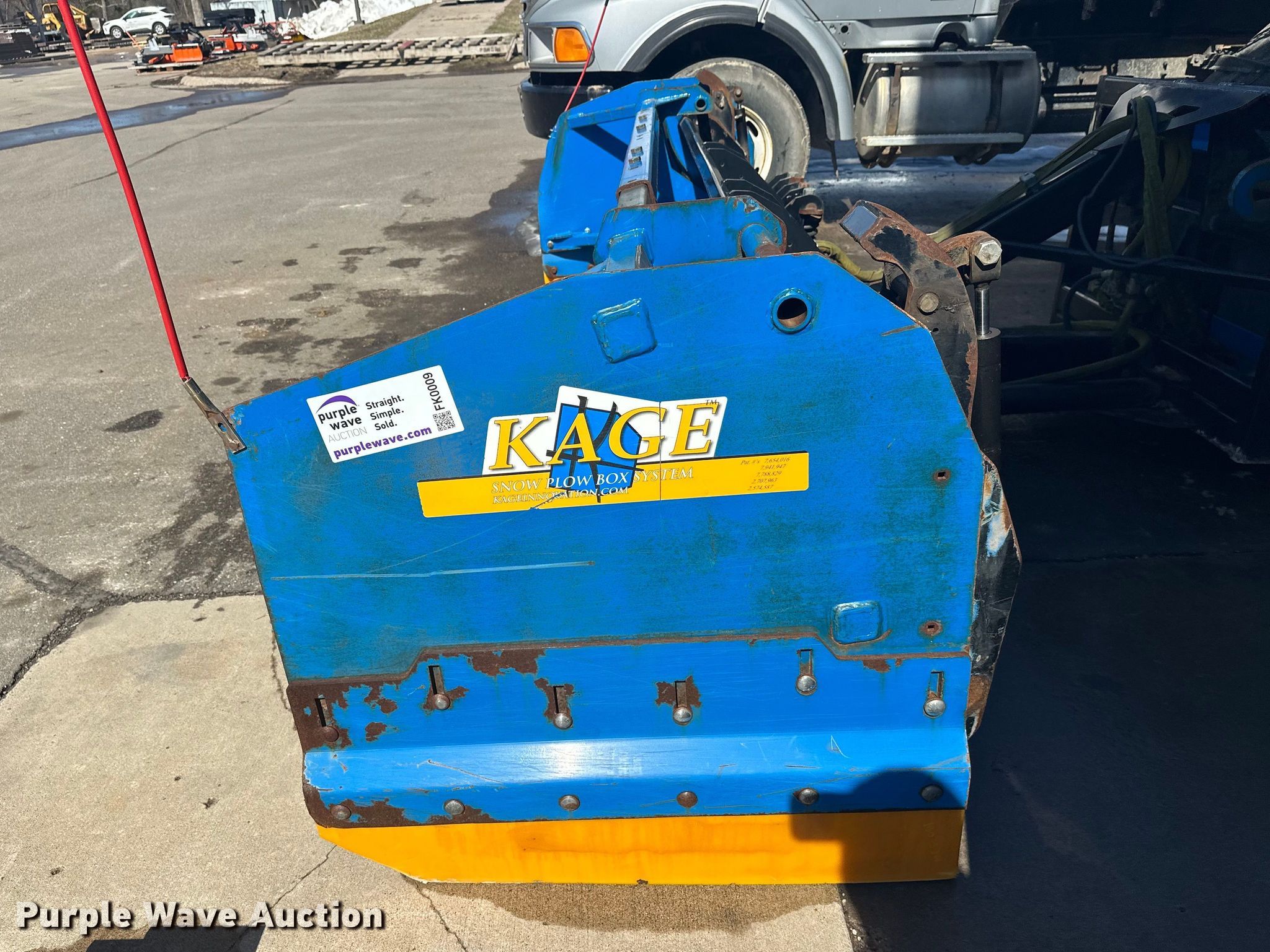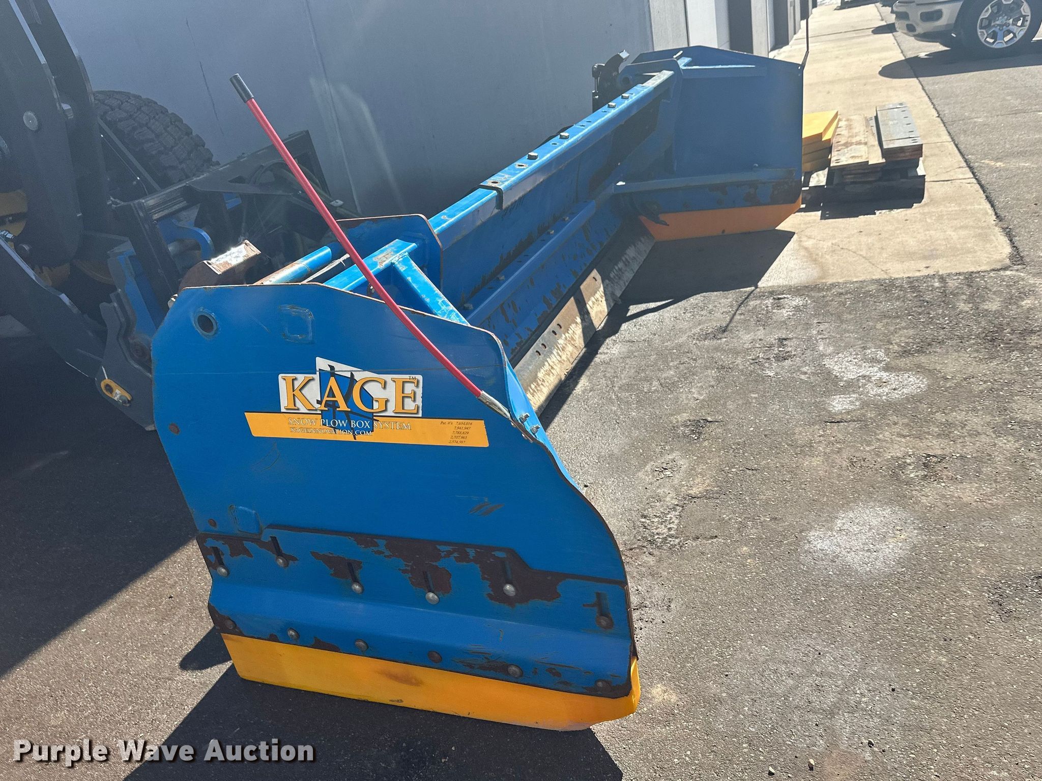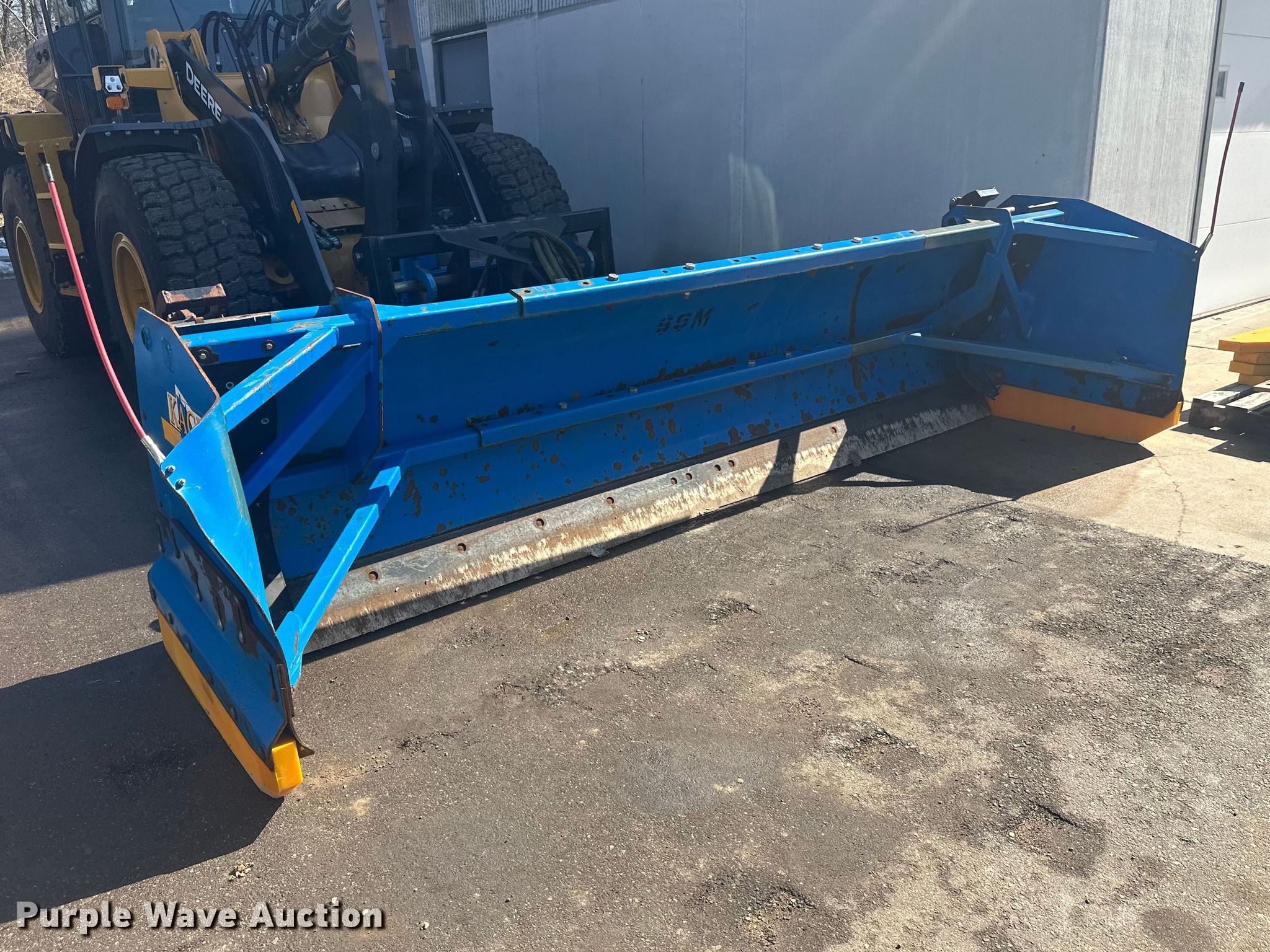 Purple Wave is selling a used Wheel Loader Attach. in Minnesota. This item is a Kage Snow plow box system wheel loader snow pusher with the following: ACS quick coupler, Width: 12' 3", Additional cutting edges and wear bars included